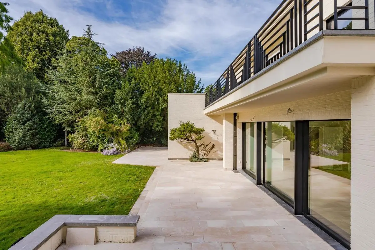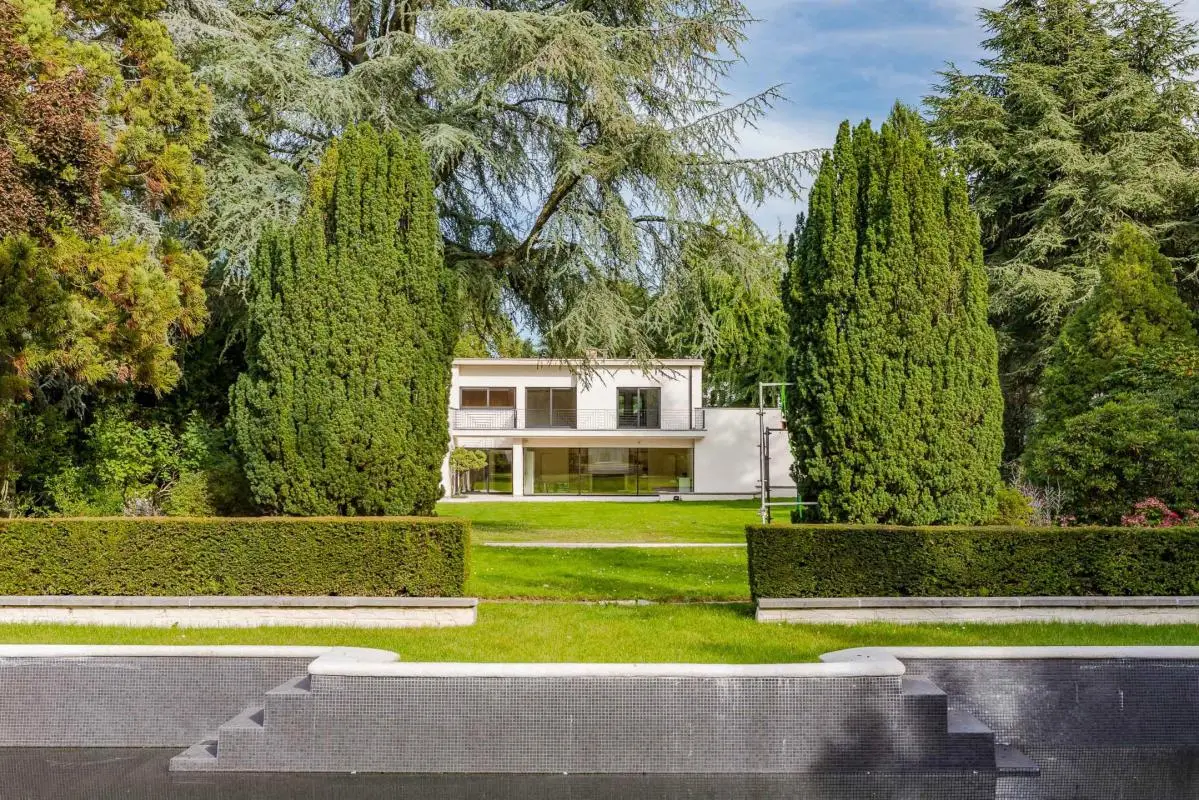Situated on one of Uccle's most sought-after avenues, this rare minimalist property blends perfectly into its exceptionally green surroundings. Set in 45 ares of land, it benefits from a garden planted with trees, spectacular views and a swimming pool, offering a unique living environment. With 500 m² of living space, it boasts spacious reception rooms, a study, four bedrooms (with the possibility of adding more) and two bathrooms. An independent caretaker's lodge enables staff or guests to be accommodated independently. The property has undergone a complete technical refurbishment, with new frames, electricity and heating. The interior finishing touches have yet to be completed, giving you the opportunity to personalise the spaces as you wish. A five-car garage completes this exceptional property. EPC G