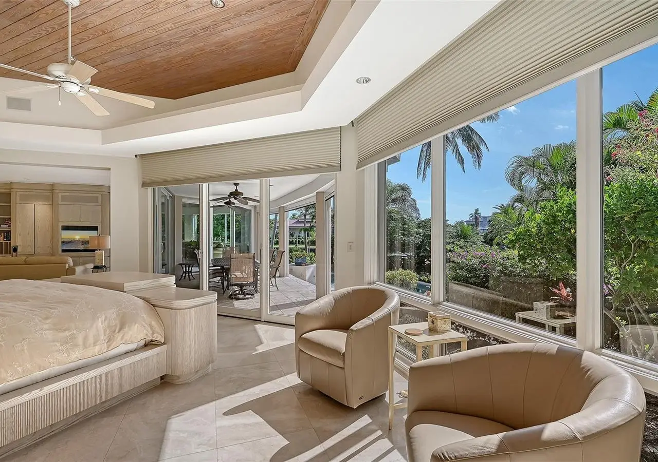Bay Isles Harbor, Longboat Key - Stunning 4BR/5.5BA, 5,080 SF waterfront home in the prestigious Bay Isles Harbor section of Longboat Key. This architectural masterpiece features a dramatic great room with soaring tongue-and-groove ceilings and floor-to-ceiling windows showcasing sweeping water views. The circular kitchen offers stone counters, top-tier appliances, and integrated Lutron lighting, audio, and video systems. The first-floor primary suite opens to the pool and screened patio with a spa-style bath and private office. A newer 32x23 guest suite includes two Murphy beds, entertainment area, steam shower, and sauna. Enjoy a private dock on protected deep sailboat water with a 12,000 lb. lift. Bay Isles residents enjoy gated security and access to the exclusive Bay Isles Beach Club on the Gulf of Mexico.