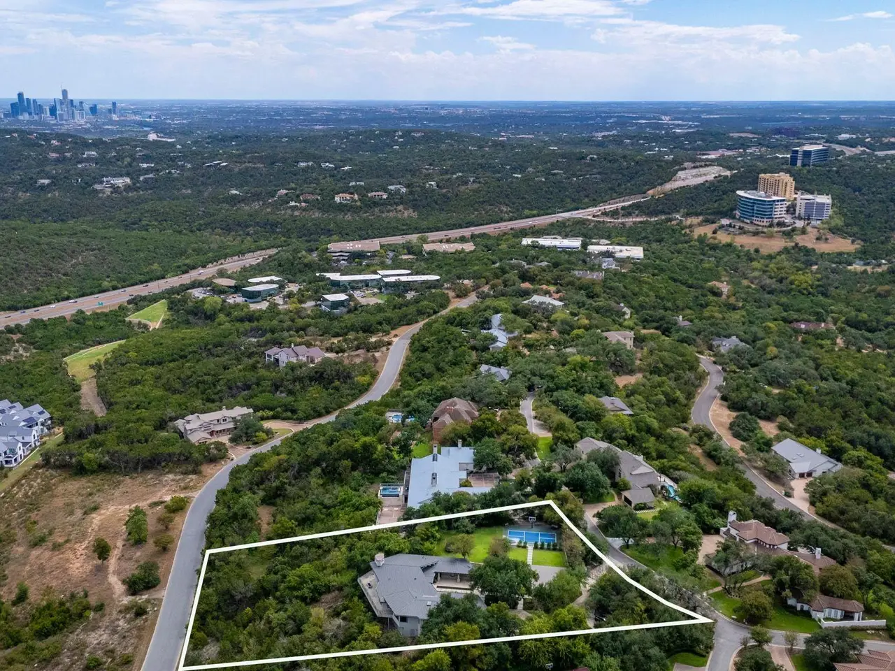 Situated in Rob Roy, one of Westlake's most coveted gated communities, 10 Hedge Lane boasts exceptional views, expansive terraces, and a 3-car garage. The single-level residence features 4 bedrooms and 4.5 bathrooms on a premier lot with a lush green yard and sports court. Glide over floating stones as you approach the striking glass doors that welcome you inside the residence. The interiors instantly impress with a vaulted ceiling, fireplace, and incredible panoramic views of the Hill Country and the Austin skyline in the distance. Natural light pours into the living room through abundant windows and sliding glass doors to the terrace. The living room flows into the immaculate gourmet kitchen with ample cabinetry, stainless steel appliances, and a wet bar. Escape to the privacy of the primary suite that features French doors to the terrace and beautiful vistas. The spacious primary bathroom offers dual sinks, a soaking tub, a glass-enclosed shower, a vanity room, and a massive walk-in closet. 3 additional guest suites, each with en-suite baths, provide comfort and privacy for family and visitors. A powder room, mudroom, and laundry room complete the home. Living in Rob Roy offers the perfect blend of privacy, prestige, and convenience in one of Austin's most sought-after gated communities. Nestled in the scenic hills of West Austin, residents enjoy expansive homesites with breathtaking Hill Country views, all while being just minutes from downtown, Lake Austin, and top-rated Eanes ISD schools. With 24-hour security, a tranquil atmosphere, and proximity to premier shopping, dining, and entertainment at Barton Creek and Westlake, Rob Roy provides a rare opportunity to enjoy both serene living and the vibrancy of Austin life. Tax and assessed values are estimates for illustration purposes only. All figures should be independently verified. Some images are virtually staged for visualization and may not reflect the actual appearance or condition of the property.
