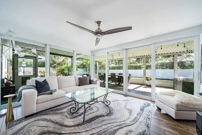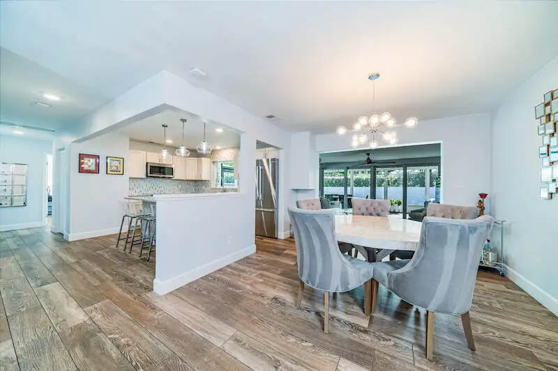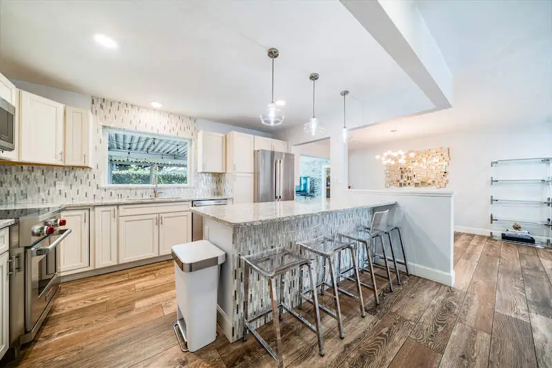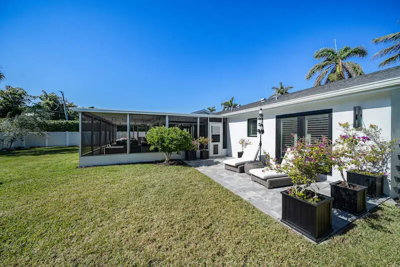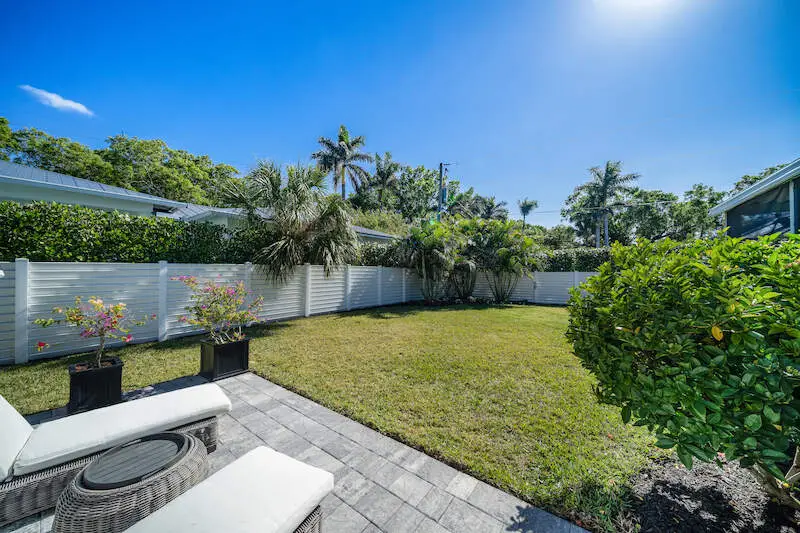 Gorgeous curb appeal!! This absolutely charming 3-bedroom, 2-bath ranch-style home in the desirable Lake Park neighborhood boasts stunning curb appeal with a freshly painted white exterior, bold black trim, main roof is asphalt shingles, metal lanai roof, and tasteful wood detailing accents. The inviting front porch, new light fixtures, and paver driveway with governors circle driveway for extra cars enhance the welcoming aesthetic. The beautifully landscaped yard is framed by newer white PVC privacy fencing and a gated rear yard. Decorative metal rain gutter downspouts add a touch of sophistication, creating a Santa Barbara-inspired exterior that feels crisp and contemporary. Inside, the open-concept layout is modernized with seamless "wood-look" tile plank flooring throughout, the kitchen features lighter creamy cabinetry, a tiled backsplash, breakfast bar, and high-end appliances including a WOLF electric cooktop and oven, BOSCH dishwasher, and French door refrigerator/freezer. The owner's suite offers an en-suite bath and dual closets, while the guest suite opens to a paver patio overlooking the private backyard. The renovated guest bathroom includes white tiled shower walls accented with mosaic bands, a floating double-sink vanity, and extra storage. A glass-enclosed family room with tile plank floors, a stone accent wall, and a ceiling fan provides additional living space, while the screen-enclosed porch with epoxy flooring and string lights is perfect for relaxing or entertaining. The oversized 1.5 garage features built-in storage rack and the enclosed laundry room is equipped with Samsung front-loading washer and dryer. With its lushly landscaped and private backyard, proximity to top-rated schools, trendy restaurants, and Naples' sunny beaches, this home offers a perfect blend of classic charm and modern living in a highly sought-after walking community.
