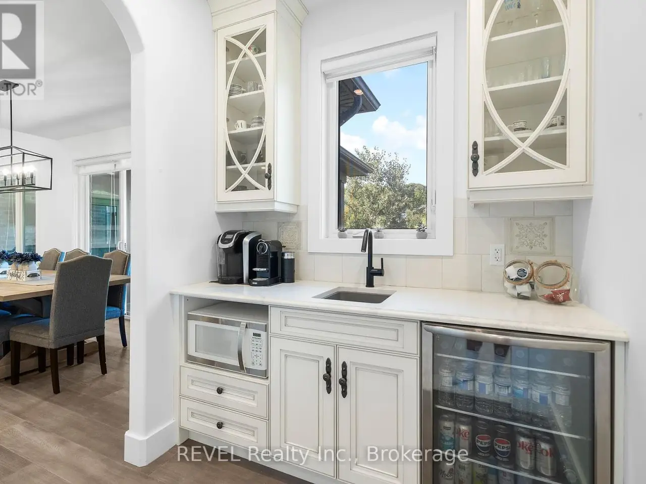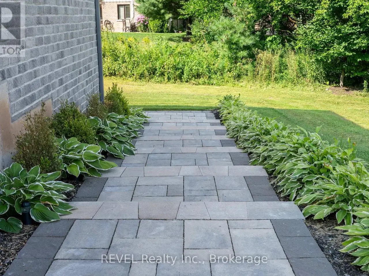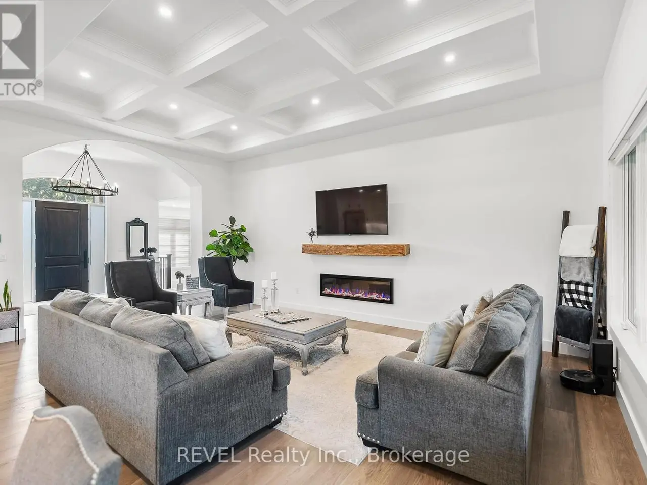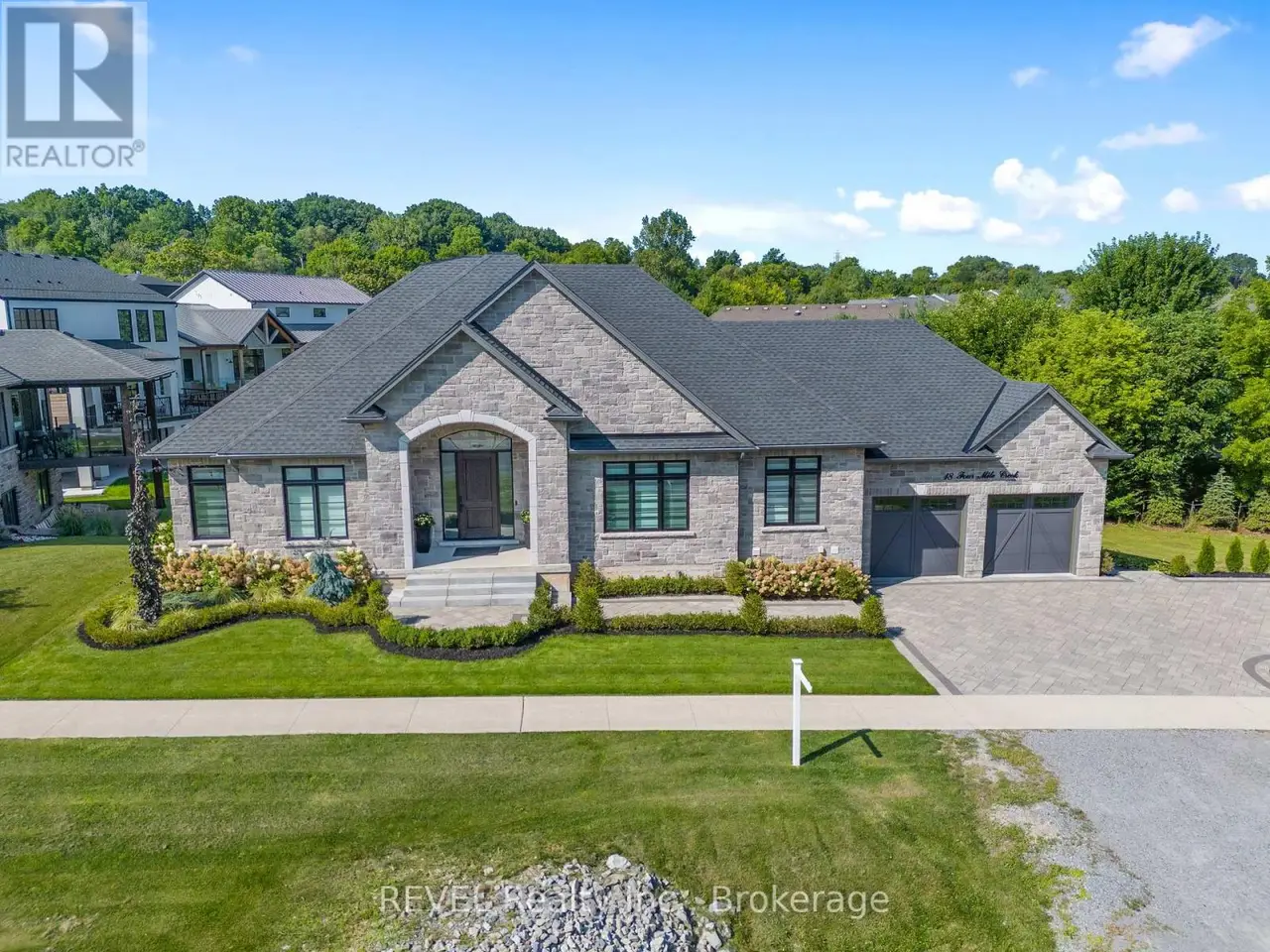 Welcome to this stunning custom-built stone bungalow with 2,750 sqft of finished living space, on a large irregular pie-shaped lot with mature trees. Step into a spacious front foyer leading to an open-concept main floor, where luxury meets comfort. The kitchen is a chef's dream, featuring Traditional and Contemporary design features, large island with a built-in dishwasher, bar top seating andFrigidaire Professional Series appliances. Quartz countertops throughout, Engineered Hardwood and ceramic tile flooring. A walk-in pantry off the dining area offers a wine cooler, prep sink, and extra storage. The living room boasts a cozy electric fireplace and a coffered ceiling, while the dining area opens to a rear deck, perfect for entertaining. The master bedroom suite includes a walk-in closet and a 4-piece ensuite with a large walk-in tiled shower. Two additional bedrooms share a 3-piece bath with another walk-in shower, plus a convenient 2-piece powder room. Outdoor living is a delight with a rear covered porch featuring a gas BBQ hookup and composite decking, and a 3-season sunroom with vaulted ceilings by Outdoor LivingDesigns. The 300 sqft finished basement area offers extra living space, with potential for an in-law suite in the unfinished section, complete with a full walkout and roughed-in 3-piece bathroom. A private hot tub area adds to the appeal. The fully landscaped property includes a sprinkler system, lighting, interlocking stone patios, and walkways. An oversized 2-car garage provides ample storage. Located near wineries, restaurants, shopping, and with easy access to the QEW and Lewiston-Queenston Border Bridge, this home offers the perfect blend of luxury and convenience.**EXTRAS** tankless water heater, basement fridge (id:7434)