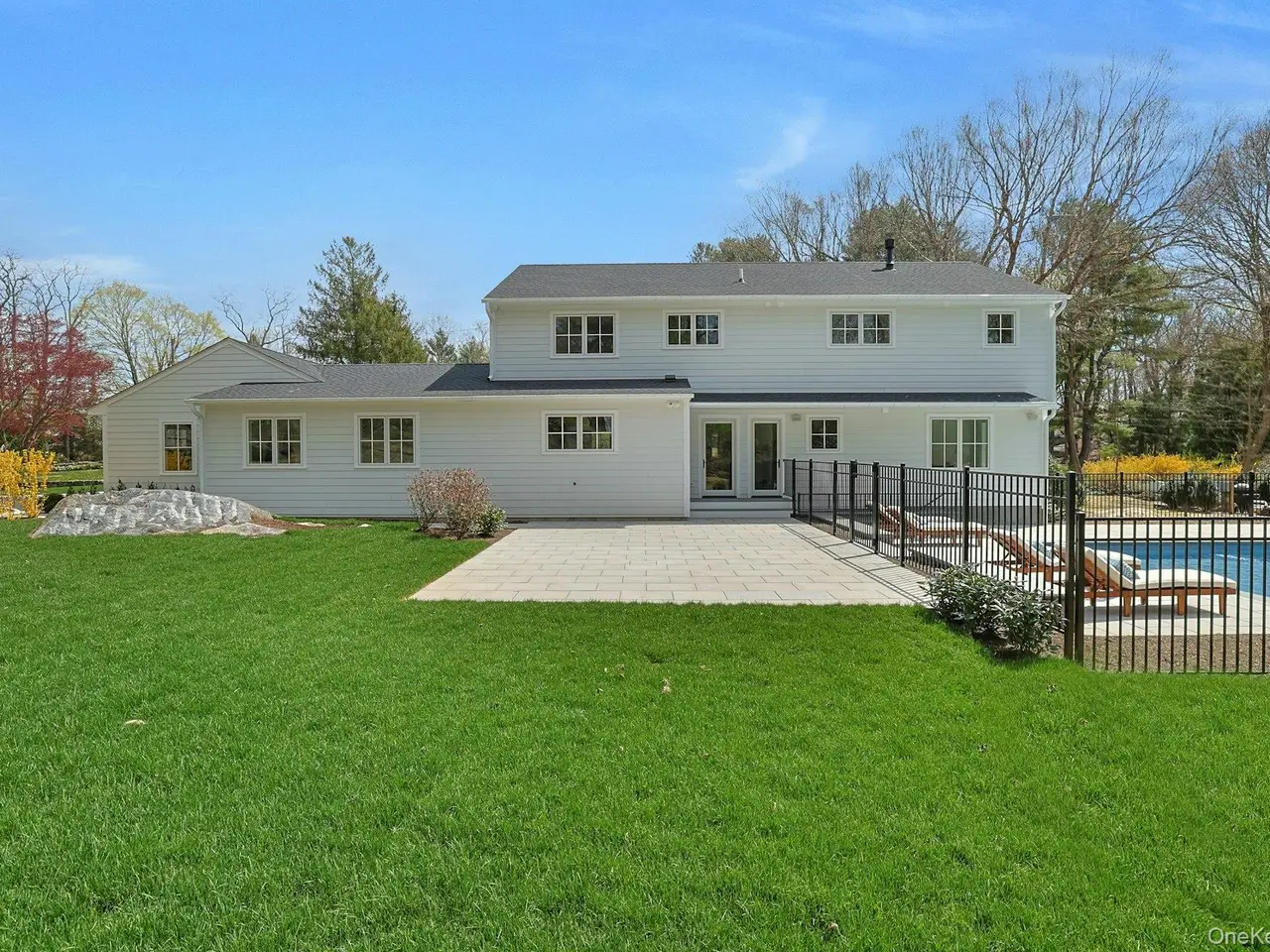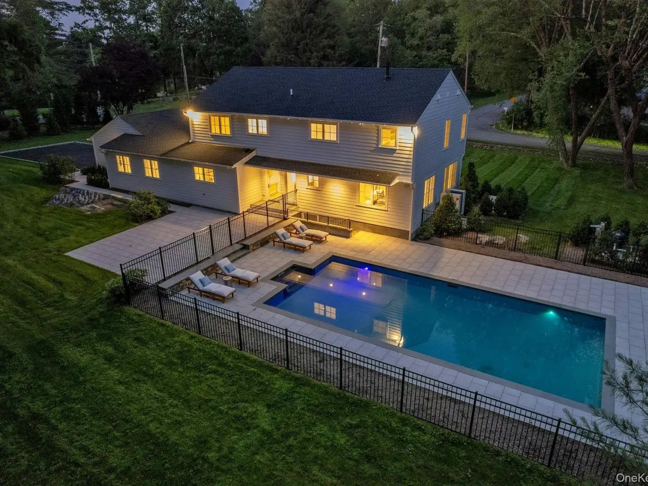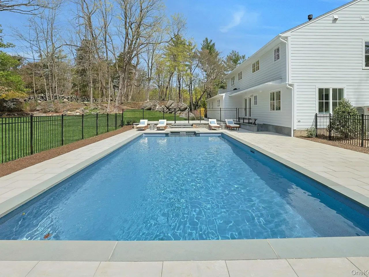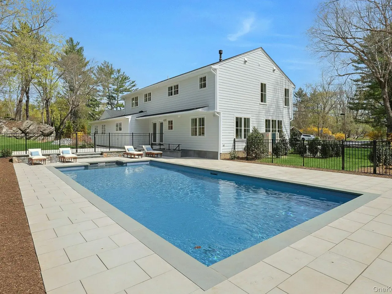 Elegant Colonial with Pool on Cul-de-Sac in Armonk (Byram Hills Schools) Located on a quiet cul-de-sac, this expanded and updated Colonial sits on a level, landscaped acre with a heated in-ground pool, stone patio, and fenced yard. Oversized windows fill the home with light, showcasing wide-plank wood floors and high-end finishes. The chef's kitchen features marble counters, custom cabinetry, and top appliances. The spacious primary suite includes a luxurious bath with radiant heat, soaking tub, and oversized shower. Lives like a 4-bedroom with a flexible first-floor guest room/office. Finished walk-out lower level (~950 sf) opens to the pool area. Approx. 3,800 sf above grade. Oversized 3-car garage, outfitted closets, and full-house Generac generator complete the package.
