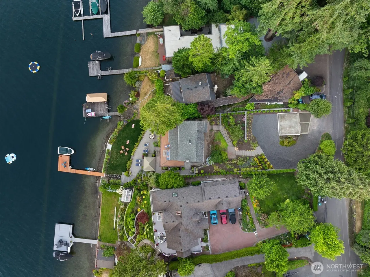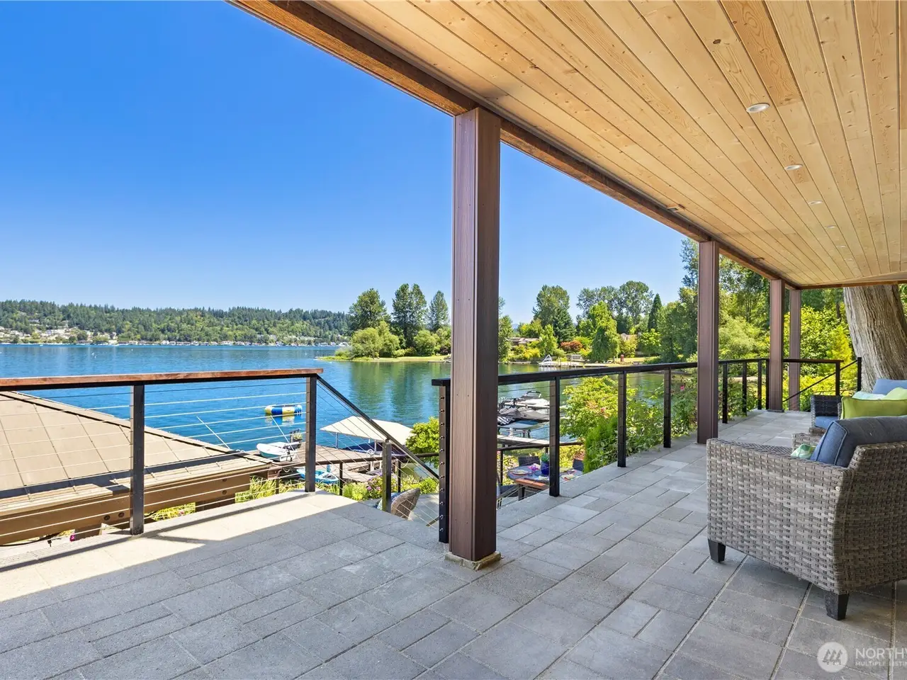 With 75 feet of Lake Sammamish waterfront and 5,000-plus square feet of total indoor/outdoor living space, this breezy lakeside haven invites you to slow down and savor the moment. Spend sun-drenched days boating from your private dock, paddleboarding at sunrise or playing cornhole on the lawn. Walls of glass frame lake views from nearly every angle - gliding eagles, shimmering light and forested silhouettes. All bedrooms capture the water's beauty, including a vaulted primary suite and spa-like bath wrapped in glimmering tile. Renovated in 2017, the home blends creamy neutrals, blue accents and warm hardwoods for an airy coastal vibe. A two-car garage, full-width deck, patio and gazebo set the stage for sunset dinners and starlit evenings by the lake.