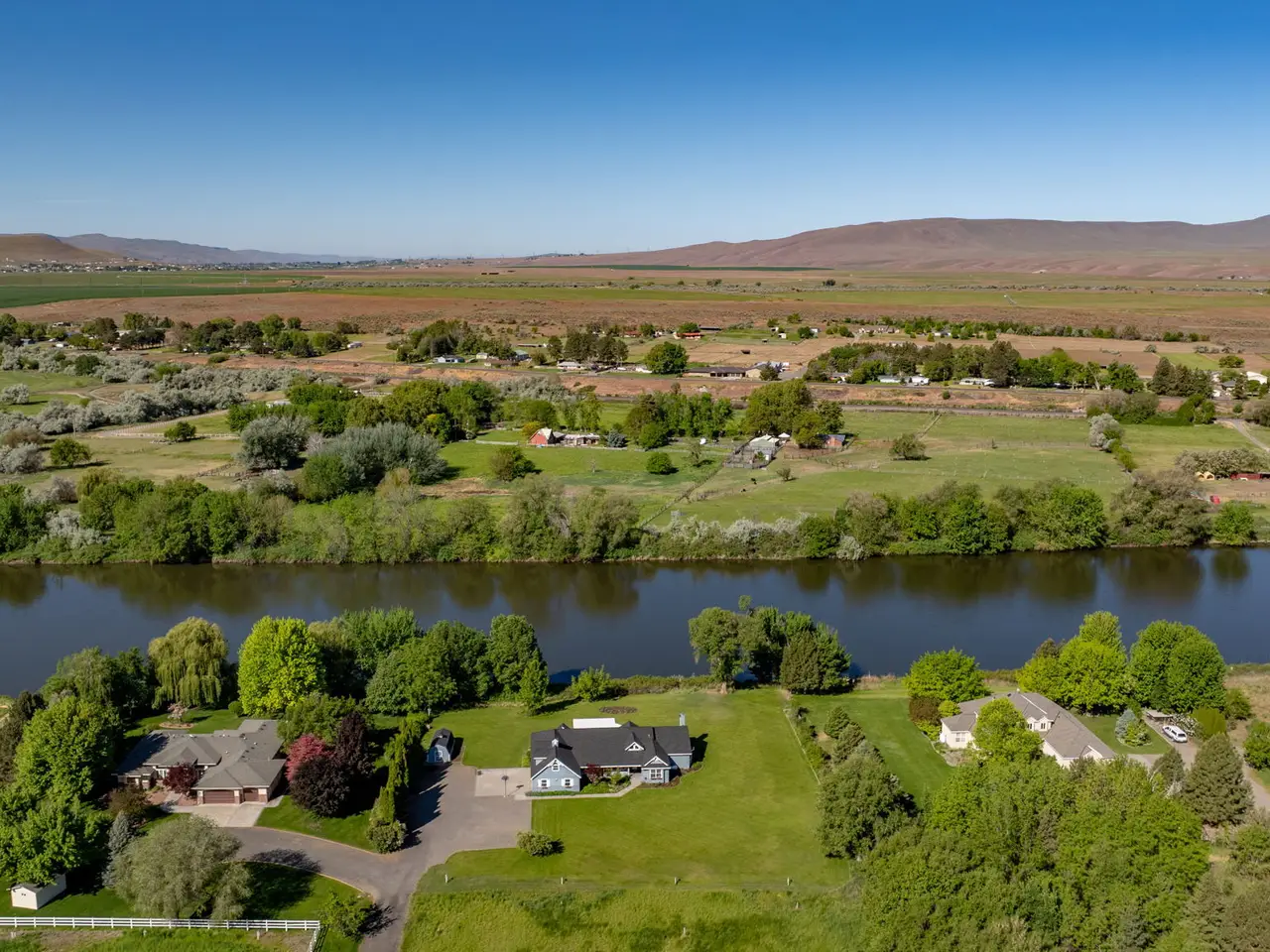 Your private riverfront retreat just minutes from the city! Discover unparalleled tranquility on this one-of-a-kind 5.3-acre riverfront treasure. Perfectly positioned for privacy and peace, the property offers sweeping panoramic views—sunrises over open pasture to the east and vibrant sunsets along the river to the west. A tree-lined private drive welcomes you home, where beautifully landscaped, irrigated grounds and mature trees create a serene, park-like setting. Inside, natural light fills the spacious home, where Swedish-finished oak hardwood floors, vaulted ceilings, and views from each room elevate everyday living. The open-concept kitchen flows seamlessly into casual and formal living areas, making it ideal for both quiet mornings and vibrant entertaining. A large picture window frames the river and western sky, bringing the outdoors in. The thoughtful split-bedroom layout ensures comfort and privacy, with a primary suite that opens to a secluded western-facing deck—perfect for unwinding while taking in the beauty and changing light. An oversized bonus loft/flex space above the garage offers views of the eastern pasture, while a private east-facing office with double doors is ideal for working remotely or creative pursuits. Designed for year-round outdoor enjoyment, the home features expansive east- and west-facing porches, a stamped concrete patio with custom pergola, and lush gardens with raspberries, grapes, and ornamental landscaping. The smart 12-zone irrigation system keeps everything vibrant with ease. Every season offers something special to look forward to making it a compelling place to gather. Recent upgrades include a new roof (2025), all-new kitchen appliances, energy-efficient geothermal HVAC, custom solar screens, and a side-load three-car garage with extra guest parking. Bordering a 2,000-acre protected ranch and bird sanctuary, this rare property offers unmatched seclusion just five miles from the amenities of West Richland and neighboring Richland - including the future Costco and Red Mountain wine country. With full in-use and operating water rights and direct river access, this is a truly special opportunity to enjoy the best of both worlds: luxurious country living with city conveniences close by.