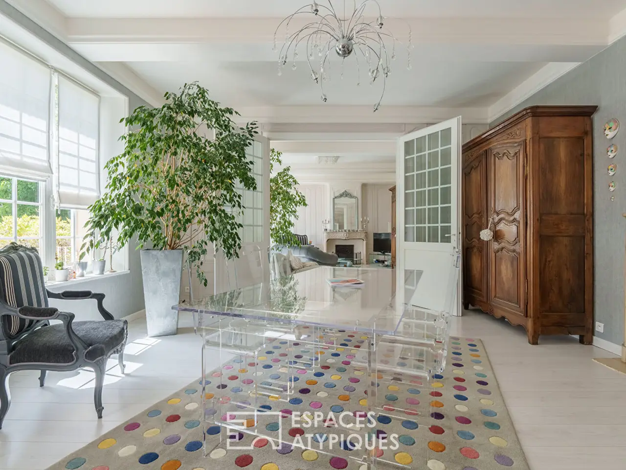 Situated in the heart of the village, this magnificent winegrower's house, completely renovated in 2009, spans 354 m2 and is set in secluded wooded grounds. The property comprises a vast living space, complemented by an independent flat that can be rented out or connected to the main residence, thus increasing the living space or creating a space dedicated to a professional activity or seasonal rental. Its authentic architecture, preserving its original high-quality materials, gives this property a singular charm and a warm atmosphere. The interior of the main house has a functional and elegant layout. On the ground floor, a beautiful entrance hall opens onto a bright kitchen with direct access to a south-facing terrace, equipped with an awning to make the most of sunny days. The living room, two lounges, a study and three bedrooms provide comfortable, flexible living space. The house also includes two shower rooms, a bathroom, a storeroom and a laundry room, providing practicality and comfort on a daily basis. The cellars, which have been converted into a reception room and tasting room with a wine press, add an extra touch of character, ideal for entertaining or organising events. The attics can still be converted, offering potential for extension or personalisation. The flat has an entrance hall on the ground floor and a living room, kitchen and bedroom with dressing room and shower room on the first floor. The outside spaces are a real asset, with shaded terraces, a spa in the sun and century-old trees providing a serene, intimate atmosphere. A room with a pizza oven, a garden room, a garage and a courtyard create a practical and friendly environment. The property enjoys a peaceful setting, yet is close to the amenities and schools of Lay Saint Christophe, making daily life easy. Connections to Nancy via the TED bus network add to the appeal of the area. The proximity of hiking trails means that you can take full advantage of nature, while still being just a few minutes from the town. This property stands out for its authenticity, carefully preserved original materials and elegant decor. Its development potential, its configuration with two independent or connected dwellings and its well-kept outdoor spaces make it a rare property on the market. A place where history, comfort and nature come together to offer an exceptional living environment, full of charm and character. 10-minute walk to shops Schools within 5 minutes' walk 5-minute walk to public transport REF. 521 Additional information * 12 rooms * 6 bedrooms * 4 bathrooms * Floor : 1 * Outdoor space : 1788 SQM * Property tax : 1 273 € Energy Performance Certificate Primary energy consumption c : 100 kWh/m2.year High performance housing