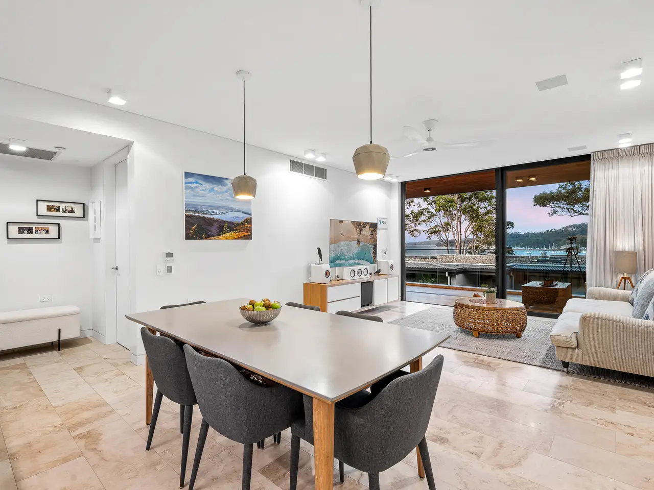• Streamlined living/dining area with captivating water views