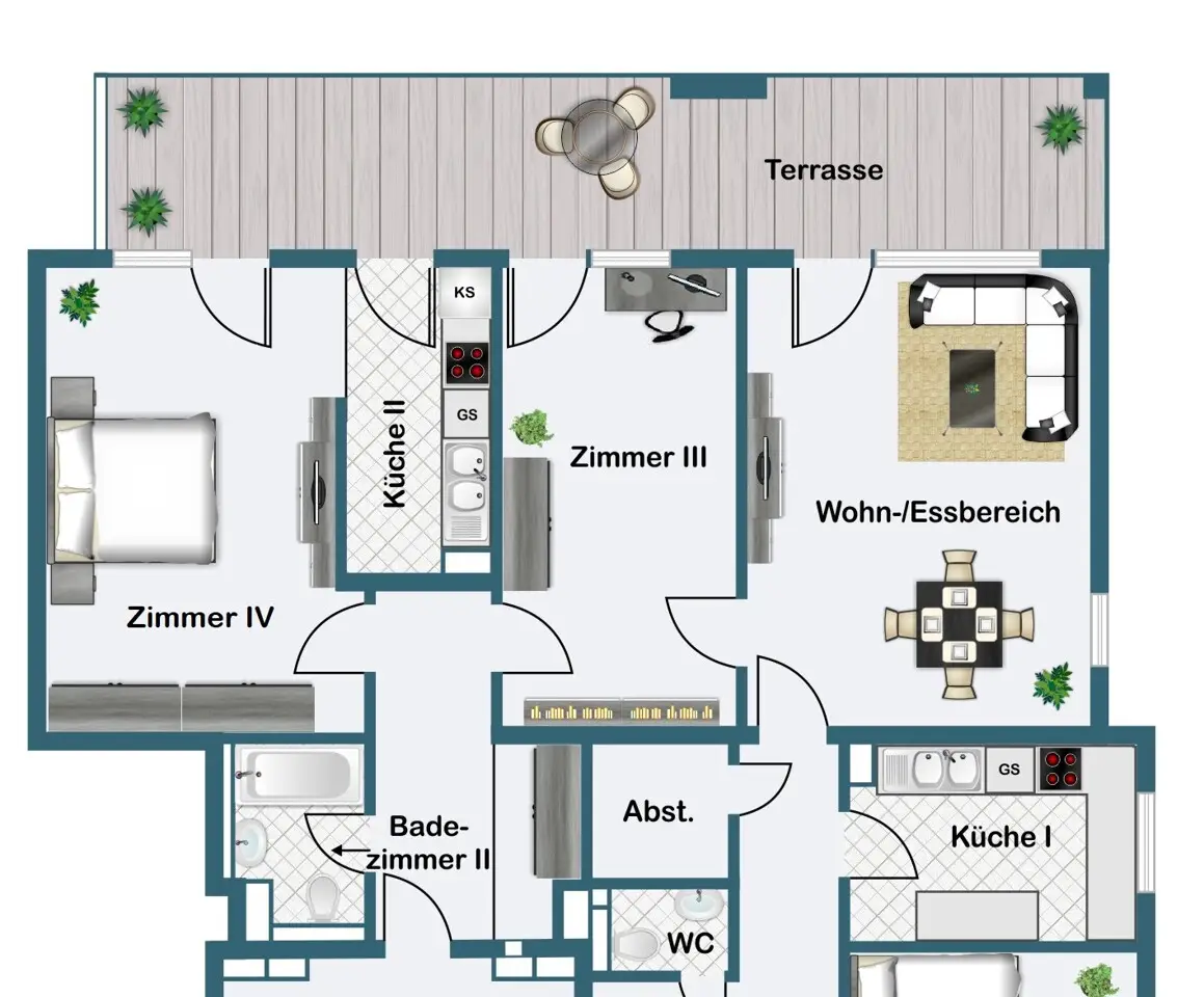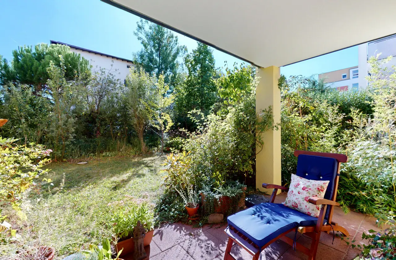 This special property combines the advantages of a barrier-free first floor apartment with the feeling of living in your own home. It is located in a well-kept, family-friendly ensemble of apartment buildings with a park-like common area and playgrounds and impresses with its unique combination of spaciousness, tranquillity and excellent infrastructure. The centerpiece is the approximately 325 m² garden, which offers exclusive special usage rights. It is beautifully ingrown, has fruit trees, a small pond and shady areas. The spacious, south-facing, covered terrace invites you to linger and offers a pleasant ambience at any time of day. There are five rooms, two bathrooms and a guest WC in a living space of around 154 m². Large, mostly floor-to-ceiling windows ensure that the rooms are flooded with light. The windows are double-glazed and fitted with electric shutters. Thanks to the barrier-free layout, the apartment is suitable for families as well as couples or senior citizens who value comfort and freedom of movement. The property was originally planned as two separate apartments that were merged. It consists of a three-bedroom apartment with approx. 87.22 m² and a two-bedroom apartment with approx. 66.78 m², which can easily be separated again. For this reason, there are currently two kitchens available - a practical solution for families or for individual redesign. Overall, the apartment is in a very well-kept condition, although selective modernization is advisable. The underfloor heating, which is operated by a modern heat pump, is a particular plus. It was only installed in 2023 and ensures a pleasant indoor climate. The building, which was constructed in 2003, is equipped with an elevator, making it easy to access the two spacious cellar compartments in the basement. An underground parking space is currently rented in the immediate vicinity of the building and can be taken over. The location near Dornbusch impresses with its excellent infrastructure: shopping facilities, schools, daycare centers and public transport connections are in the immediate vicinity and make the location particularly attractive. This garden apartment is truly unique, as it combines the advantages of urban living with the tranquillity and spaciousness of a private garden.