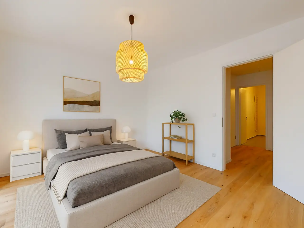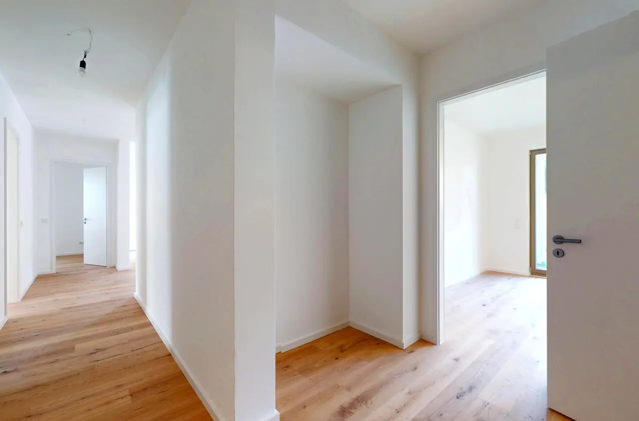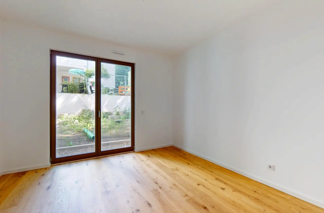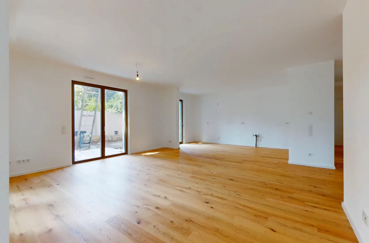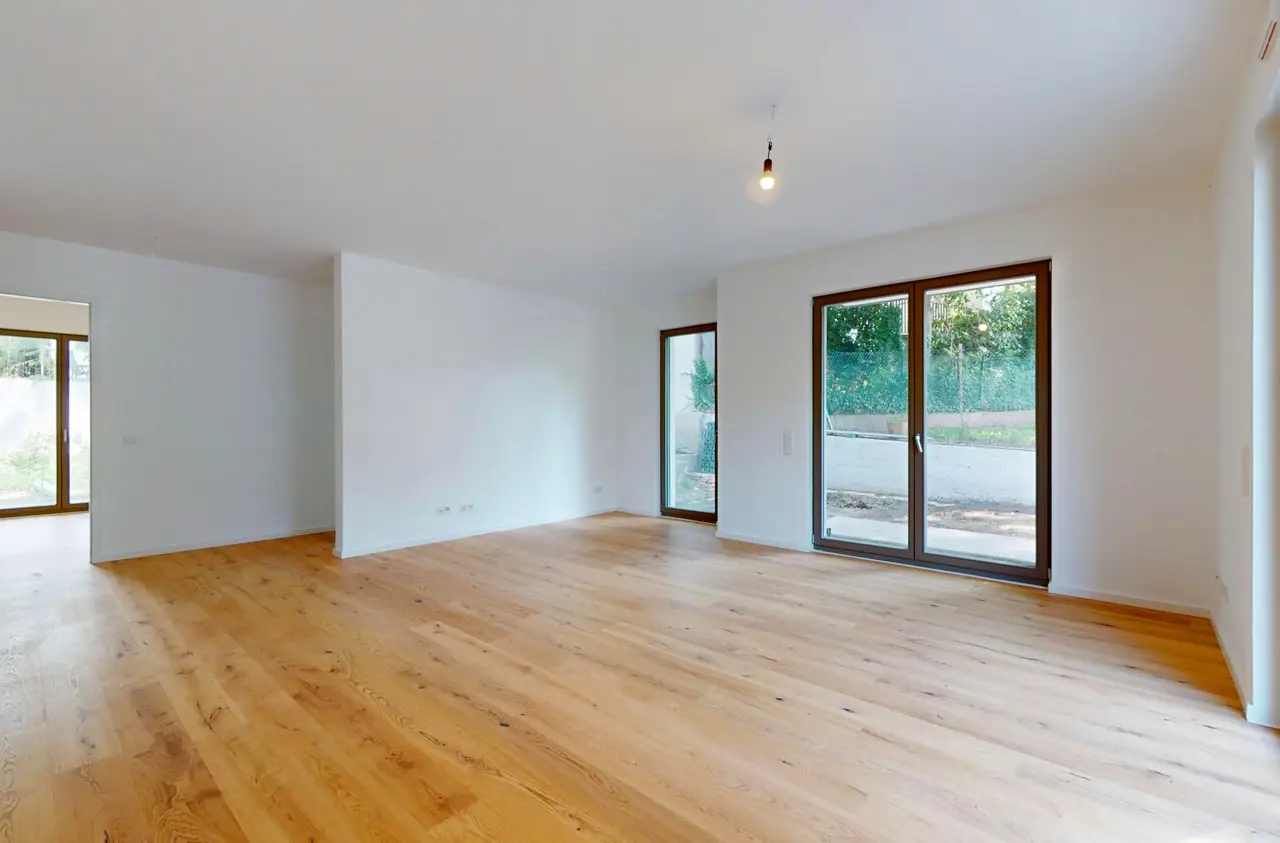 This exclusive first floor apartment combines contemporary living with high-quality comfort and a well thought-out floor plan. It is located in an architecturally appealing new building ensemble in a quiet, mature location in Alt-Eschersheim and offers you the special advantage of first-time occupancy. Access to the apartment is via a well-kept front garden, which emphasizes the private and inviting character of the building. As soon as you enter, you are greeted by a spacious entrance area from which all rooms are accessed. The hallway opens harmoniously into a spacious living, dining and cooking area, which forms the heart of the apartment. Floor-to-ceiling windows and the south-east orientation ensure light-flooded rooms and a bright, friendly living atmosphere. High-quality oak parquet flooring with a plank look creates a warm, stylish ambience, while large-format porcelain stoneware tiles in the two bathrooms exude timeless elegance. The bathrooms are equipped to a high standard with walk-in showers and bathtubs, elegant designer washbasins and branded fittings. A particular highlight of this apartment is the exclusive outdoor space: two terraces, an architecturally attractive sun deck and a lovingly designed garden area extend the living space into the open air. These areas are exclusively available to this unit and invite you to linger and relax in the greenery. The apartment is located in an energy-efficient KfW Efficiency House 55 and is equipped with a future-oriented hybrid heating system - consisting of an air heat pump and modern gas condensing technology - as well as photovoltaics. This property is ideal for discerning couples, families or senior citizens who place particular value on quality, peace and quiet and an apartment with a garden and terraces - without having to sacrifice proximity to Frankfurt city center. It is possible to purchase a two-room neighboring apartment (approx. 59 m²) to create a guest, office or au-pair apartment and extend the living space to approx. 192 m².