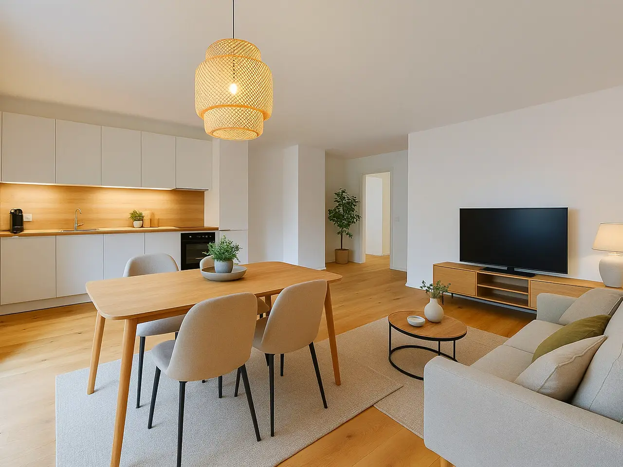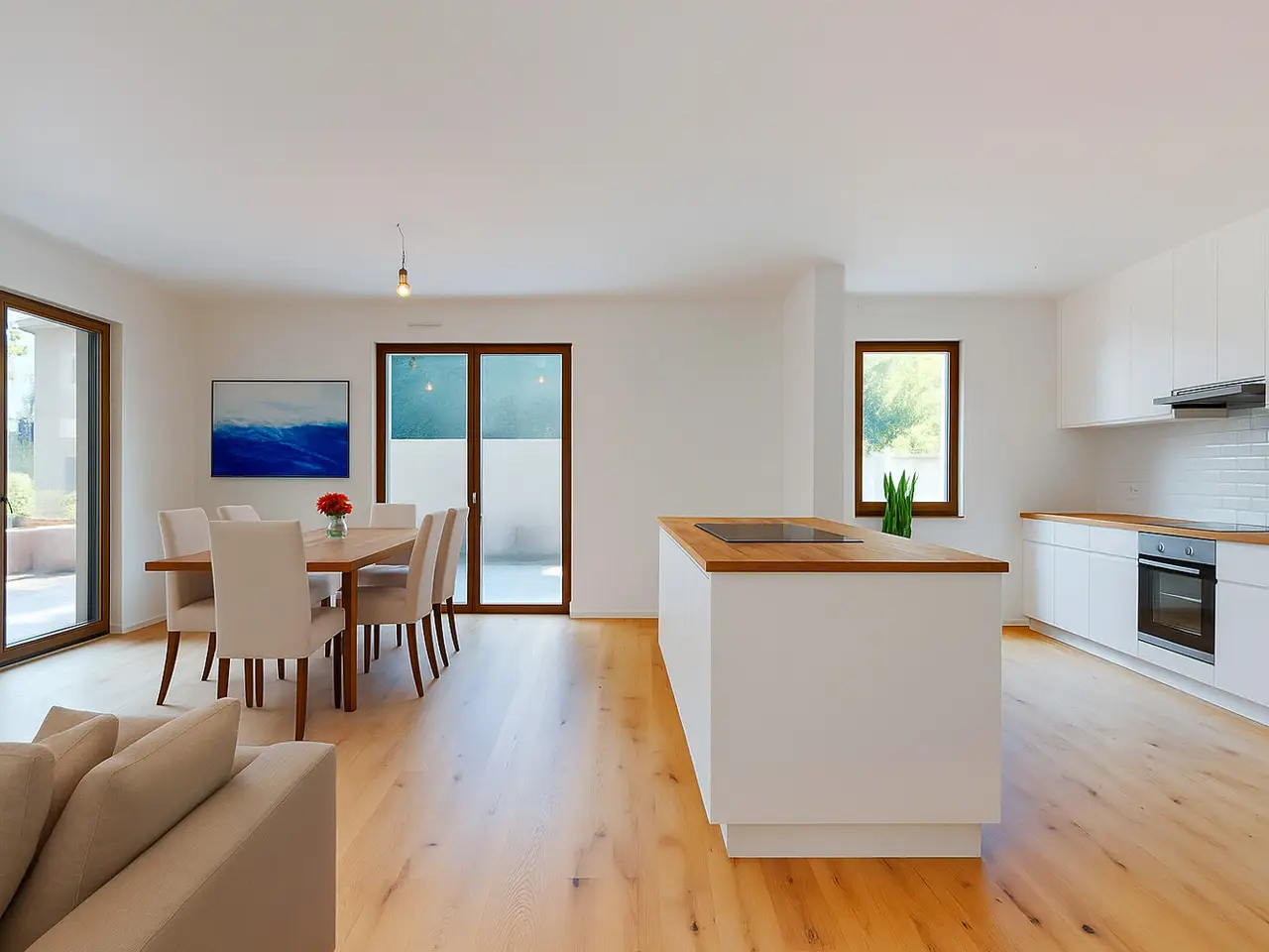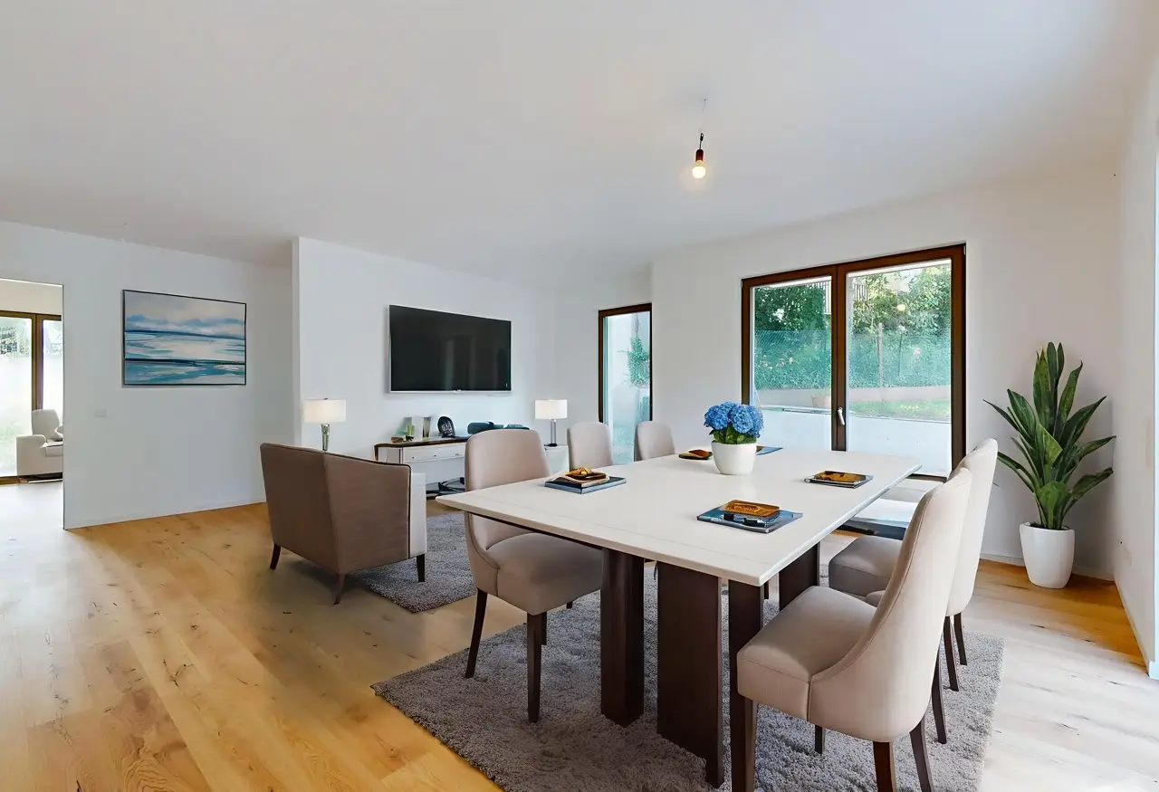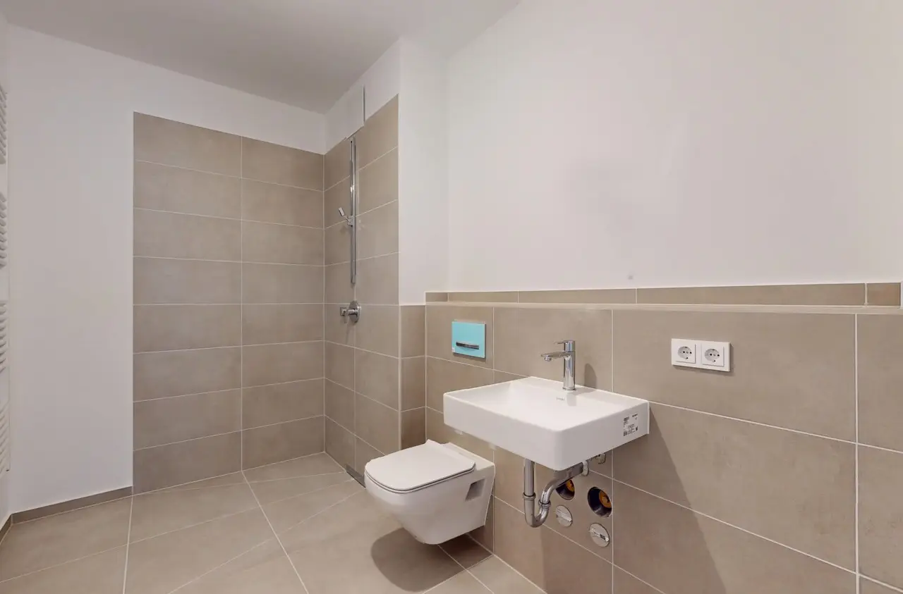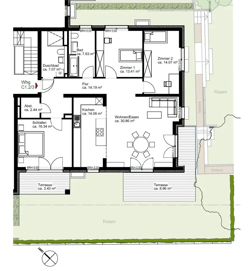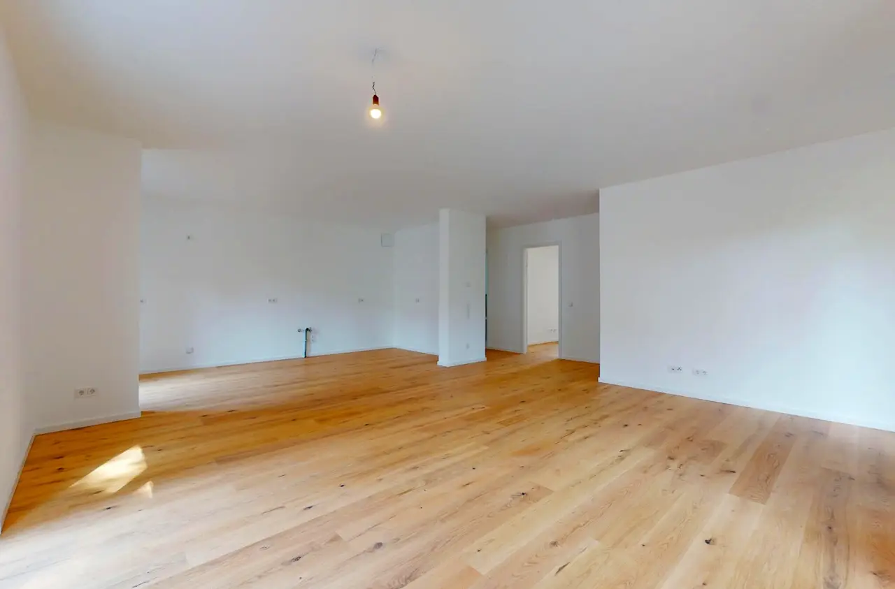 This exclusive first floor apartment combines contemporary living with high-quality comfort and a well thought-out floor plan. It is located in an architecturally appealing new building ensemble in a quiet, mature location in Alt-Eschersheim and offers you the special advantage of first-time occupancy. Access to the apartment is via a well-kept front garden, which emphasizes the private and inviting character of the building. As soon as you enter, you are greeted by a spacious entrance area from which all rooms are accessed. The hallway opens harmoniously into a spacious living, dining and cooking area, which forms the heart of the apartment. Floor-to-ceiling windows and the south-east orientation ensure light-flooded rooms and a bright, friendly living atmosphere. High-quality oak parquet flooring with a plank look creates a warm, stylish ambience, while large-format porcelain stoneware tiles in the two bathrooms exude timeless elegance. The bathrooms are equipped to a high standard with walk-in showers and bathtubs, elegant designer washbasins and branded fittings. A particular highlight of this apartment is the exclusive outdoor space: two terraces, an architecturally attractive sun deck and a lovingly designed garden area extend the living space into the open air. These areas are exclusively available to this unit and invite you to linger and relax in the greenery. The apartment is located in an energy-efficient KfW Efficiency House 55 and is equipped with a future-oriented hybrid heating system - consisting of an air heat pump and modern gas condensing technology - as well as photovoltaics. This property is ideal for discerning couples, families or senior citizens who place particular value on quality, peace and quiet and an apartment with a garden and terraces - without having to sacrifice proximity to Frankfurt city center. It is possible to purchase a two-room neighboring apartment (approx. 59 m²) to create a guest, office or au-pair apartment and extend the living space to approx. 192 m².