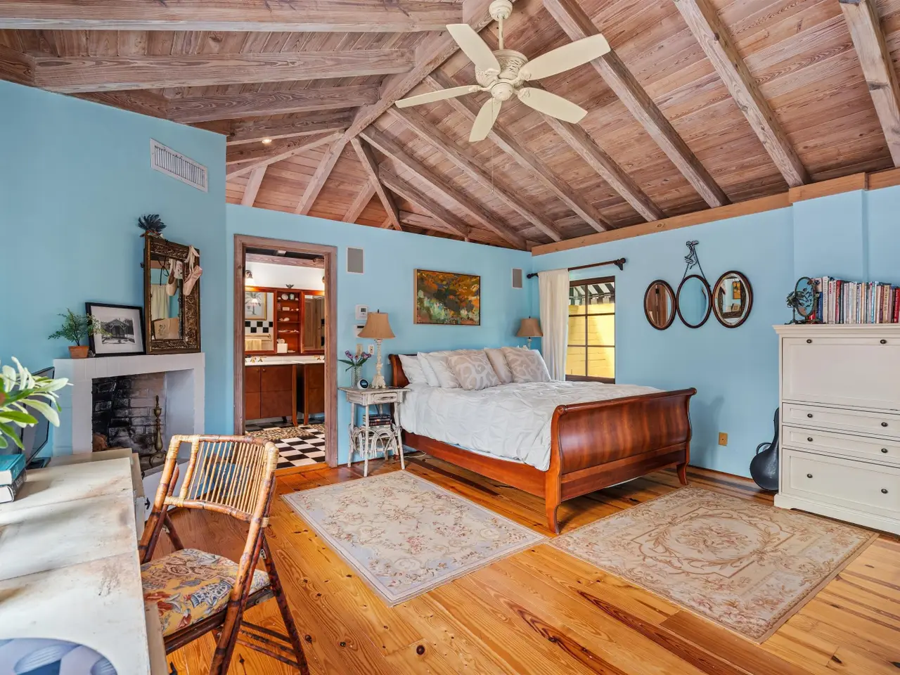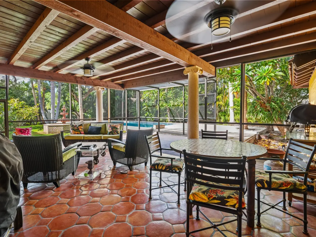 Beautifully maintained and thoughtfully updated 1950s residence, steeped in historical significance, was designed by renowned architect Beford Shoumate. This exquisite three-bedroom residence features an array of striking characteristics maintaining the charm of its era that include wood-beamed ceilings and rich cypress paneling complemented by Dade County pine and Mexican-tile flooring 334 Palm Trail, Delray Beach, Florida: The desirable Palm Trail neighborhood is perfectly located, just minutes from Delray Beach's award-winning sand-carpeted beaches, as well as vibrant Atlantic Avenue's boutique shopping, dining and nightlife venues. It is barely 20 minutes from Boca Raton's private executive airport, and an easy 30 minute commute to Palm Beach International Airport. PROPERTY: Sited on more than a half-acre parcel, with expansive lawns, old-growth trees, tropical landscaping and sea grape hedging in Delray Beach's Palm Trail area, steppingstones lead to the front entryway, establishing a gracious sense of place. In the back, the screened loggia, with Mexican-tile flooring and a wood-beamed ceiling, flow out to the sun-splashed pool set within a large patio. RESIDENCE: This beautifully maintained and thoughtfully updated 1950s residence, steeped in historical significance, was designed by renowned architect Beford Shoumate for Lowell Davidson Kern, Delray Beach's mayor in 1956, and his wife, Dorothy. Spanning 3, 738 total square feet, this exquisite three-bedroom residence features an array of striking characteristics that evoke the charm of its era. Creating a harmonious flow, the open-concept living and dining rooms showcase two fireplaces, pine flooring and wood beamed ceilings, along with cypress-paneled and brick accent walls. Embracing the allure of indoor/outdoor living, sliding glass doors from the dining room open to the large, screened pool loggia. Enriched by painted paneling, wood cabinets and a floor that incorporates decorative, hand-painted Mexican tile, the kitchen is finished with granite counters, high-end stainless-steel appliances, passe plats for easy entertaining, and a breakfast bar that opens to the family room. Offering garden views, a sitting room connects to the guest wing with two guest bedroom suites, with one currently serving as a pool-view office and the other featuring a peaked wood-beamed ceiling and offering garden views. Designed with a split-bedroom plan, the primary suite presides over the second floor. A serene retreat with a cypress-wood beamed volume ceiling, a fireplace with a simple brick surround, picture windows offering garden views and a private balcony, the suite comprises a custom-fitted walk-in closet and a bathroom with quartz finishes, two wood vanities and a glass-enclosed shower. Completing the layout are a powder room, a laundry room with a pantry closet and the two-car garage. With an easy flowing layout, new Hurricane rated windows and doors, inviting outdoor spaces, new and rich architectural details in the heart of Delray Beach, this residence is not just a place to live, but a canvas for creating cherished memories.