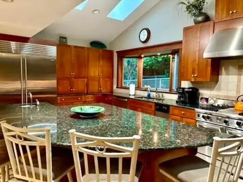 This stunning oceanfront cottage, situated on 3.85 acres at Majestic Point with views of Mount Desert Island, features breathtaking vistas and luxurious amenities throughout. The spacious 4-bedroom, 2.5-bath residence boasts a chef's kitchen equipped with a Sub Zero refrigerator, a Wolf stove, multiple sinks and a butcher block, as well as radiant heat. Three brick fireplaces add to the charm of the living room, den, and master bedroom. The expansive front porch overlooks Mount Desert Narrows and Western Bay, ideal for kayaking and paddle boarding. Additional stand alone garage is heated and insulated. The private location offers a serene setting to enjoy coastal Maine's natural beauty and recreation.