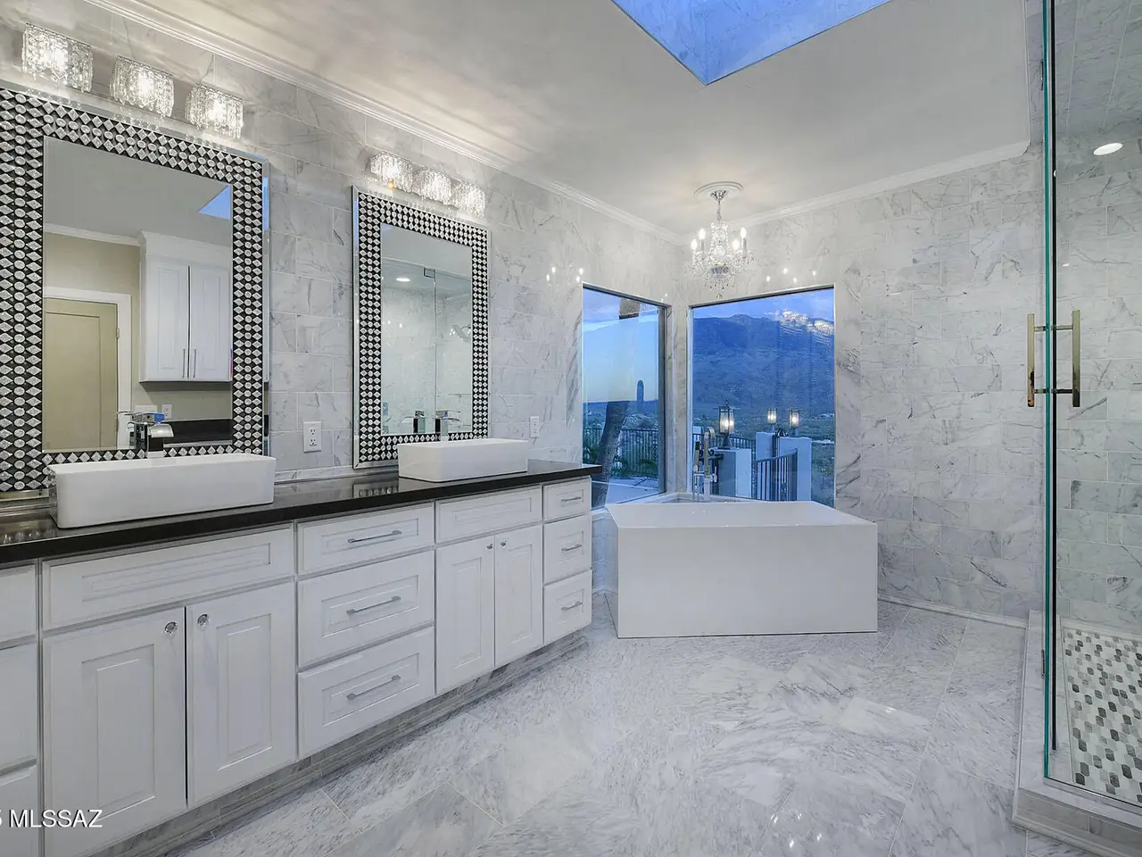 Panoramic views of mtn, city & Tanque Verde valley beckon through walls of windows adorning this luxurious home beautifully set on 7.22 hillside acres in the heart of La Cebadilla Estates. Gleaming pecan wood floors, etched marble FP, fabulous kitchen with 48-inch dual fuel range, double ovens, 2 DW, separate column refrigerator/freezer, oversized island w/bar seating, solid wood cabinets & casual dining w/jaw-dropping views. Full remodel also included luxe baths throughout; split plan offers romantic owner's suite w/FP, city lights & ''wow'' spa-like bath w/soaking tub & pool access; the lower level is great entertaining or kid hang-out space w/exercise rm, wet bar, potential media room. All new exterior decking in front & bath for 2053 covered outdoor living enjoyment.