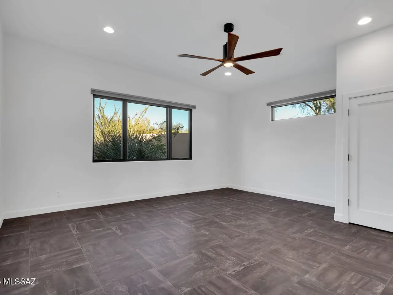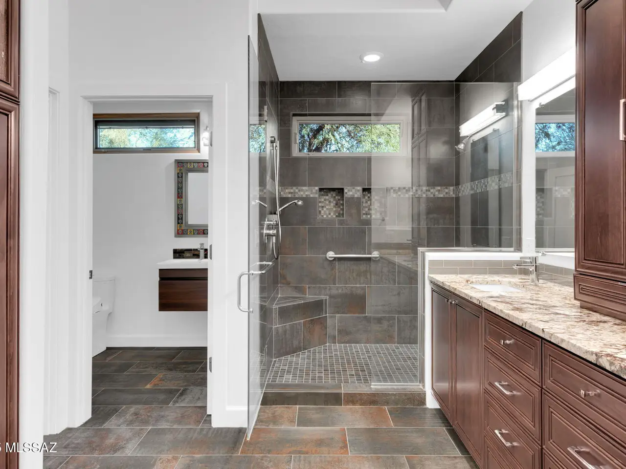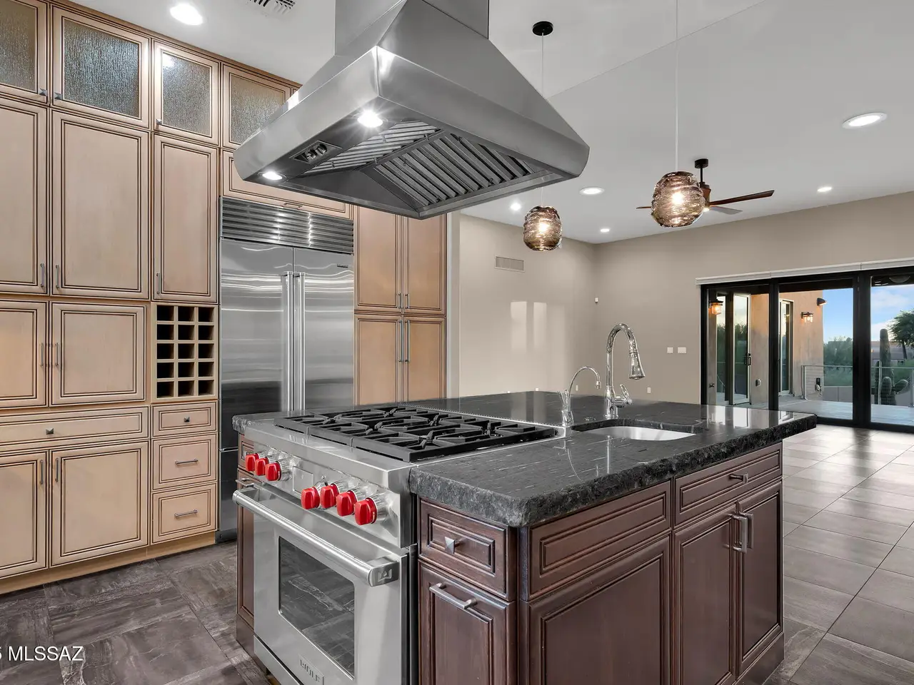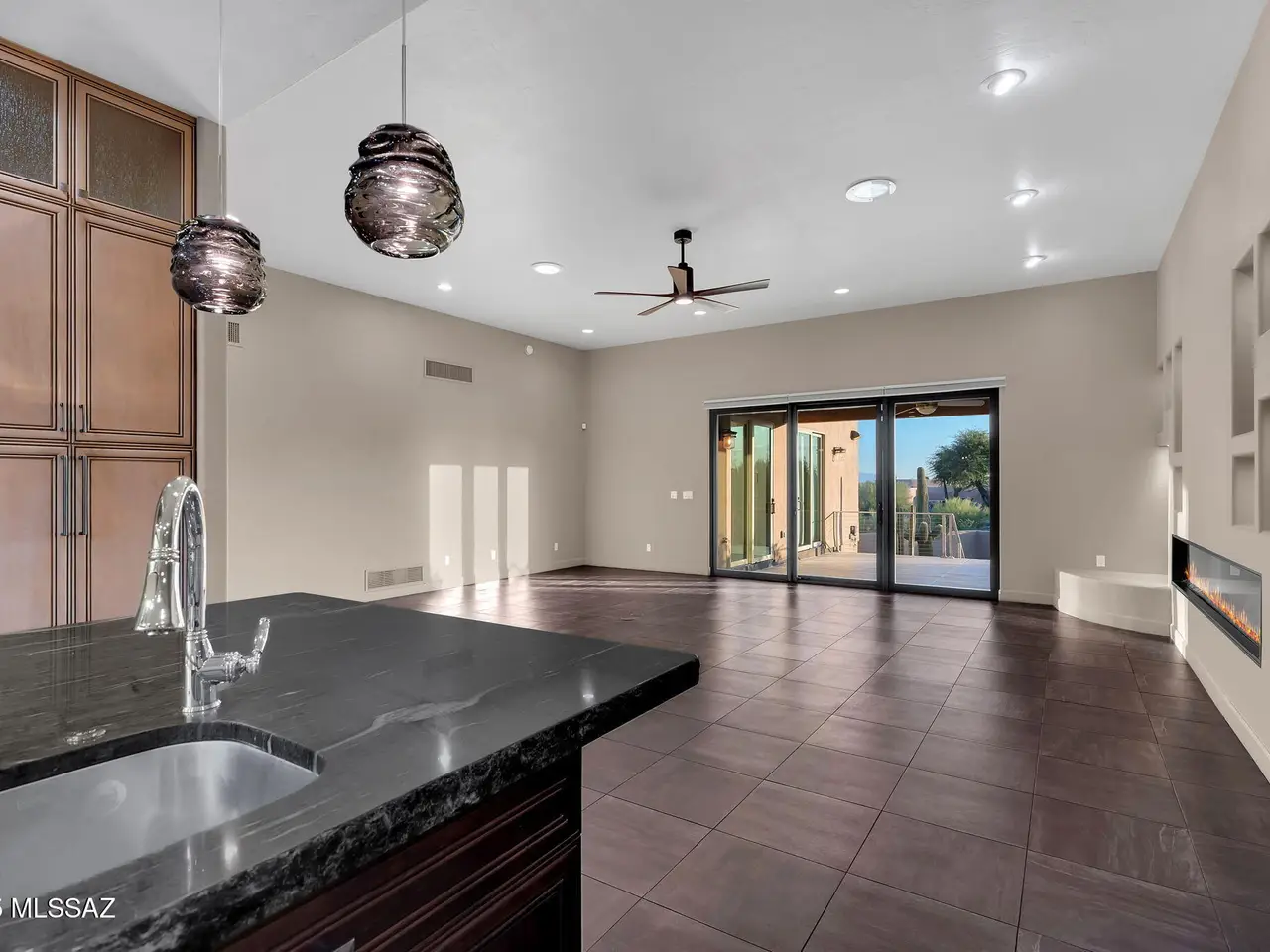 A superb blend of southwestern and contemporary architecture and design makes this an ideal retreat on the grounds of, the recipient of Michelin Guide honors, Canyon Ranch Health and Fitness Resort. The current improvements, additions, and remodeling done with delicate simplicity and quality construction adhering to minute details in its functionality. A comfortable open floor plan flows seamlessly from the living room through the kitchen and the dining area into the rest of this 4 bedrooms and 4 bathroom house. A wide streamlined 10 ft electric fireplace adds soothing warmth to the space. Fine quality of the custom-designed kitchen cabinets, granite tops and the high-end appliances is immediately apparent. Primary Suite includes a workout studio, floor to ceiling windows inviting in landscape and the Rincon Mountain views. Second and third bedrooms enjoy ensuite bathrooms and spacious walk-in closets. High-end porcelain tiles flooring, except for the fitness room, laid with special luxury vinyl plank flooring recommended for heavy workouts and waterproof surfaces provides comfort, safety and flexibility. Enjoy the views while entertaining friends on your multi-level travertine tiled patio descending towards a custom designed pool and spa. Desert plants and mature saguaro cacti breathe life into these immaculately landscaped grounds. The detached pool house/studio has full bathroom and a closet. Enjoy total immersion into Canyon Ranch healthy living philosophy and recharge and rejuvenate. Start your early morning walk on the iconic 2 mile loop followed by plethora of group fitness classes, meditation, yoga, pilates, aerobics and strength at the spa and gym facilities. Treat yourself to a massage, consult with expert practitioners, counselors and physicians in areas of nutrition, integrative and traditional medicine. Enjoy organized desert and mountain hikes and cycling. Build an appetite for healthy, delicious meals at one of the two dining venues. All at your fingertips.