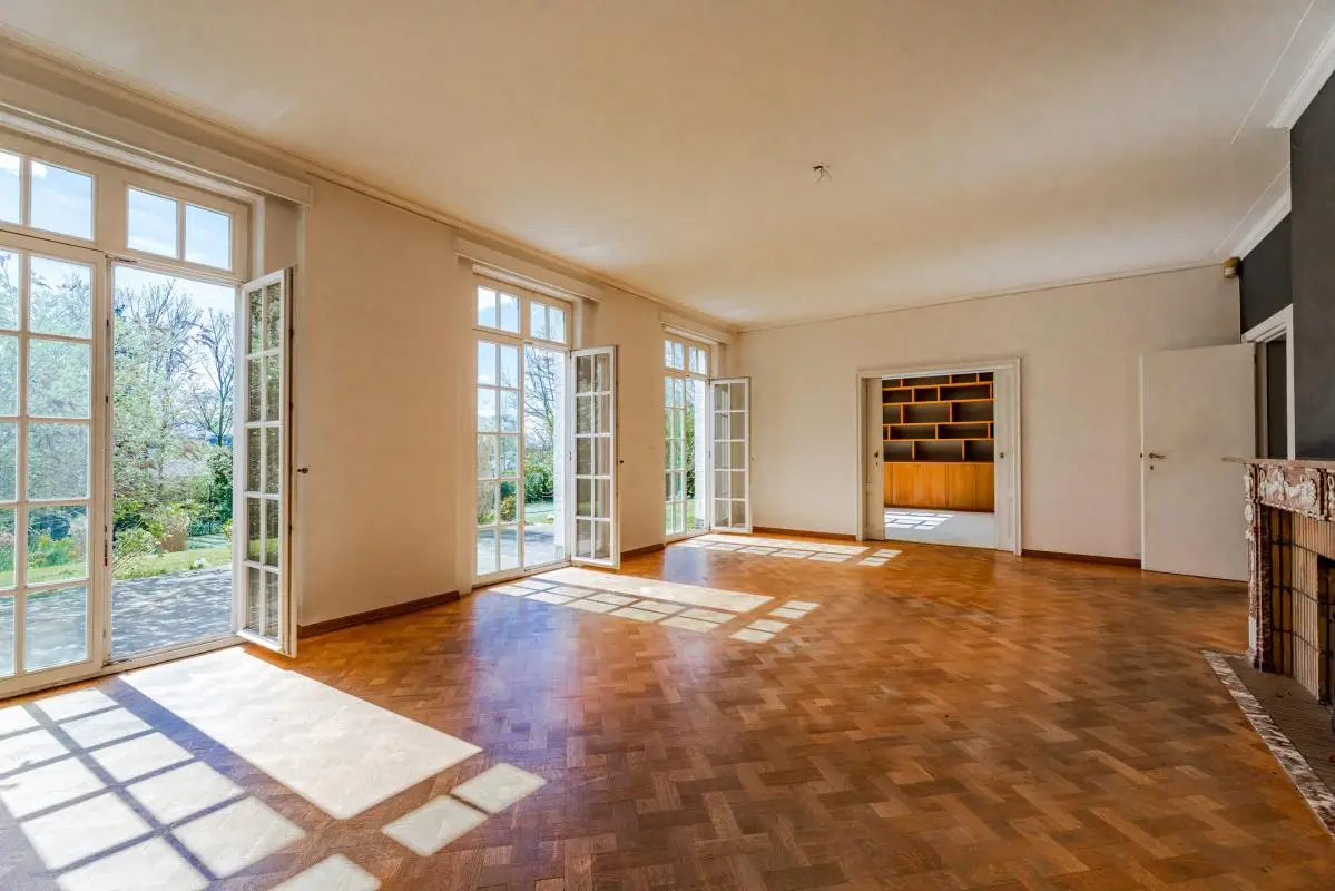 In the beautiful residential area of Vert Chasseur, this spacious family villa from the 1950s is set in magnificent land of ± 32 ares 12, planted with trees and perfectly oriented south. It offers a living area of ± 420 m², including beautiful, bright reception rooms opening onto the terrace and garden, a fully equipped kitchen, an office or games room, five bedrooms, two bathrooms and a shower room. The garden has an outdoor swimming pool (in need of renovation) and a tennis court. A garage for two cars completes the property. A rare find in a green environment, close to the Sonian Forest and the amenities of Vivier d'Oie. EPC G