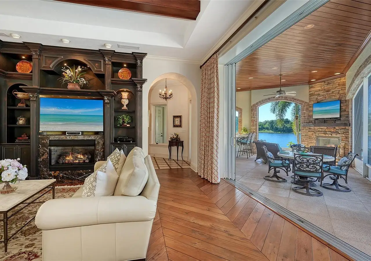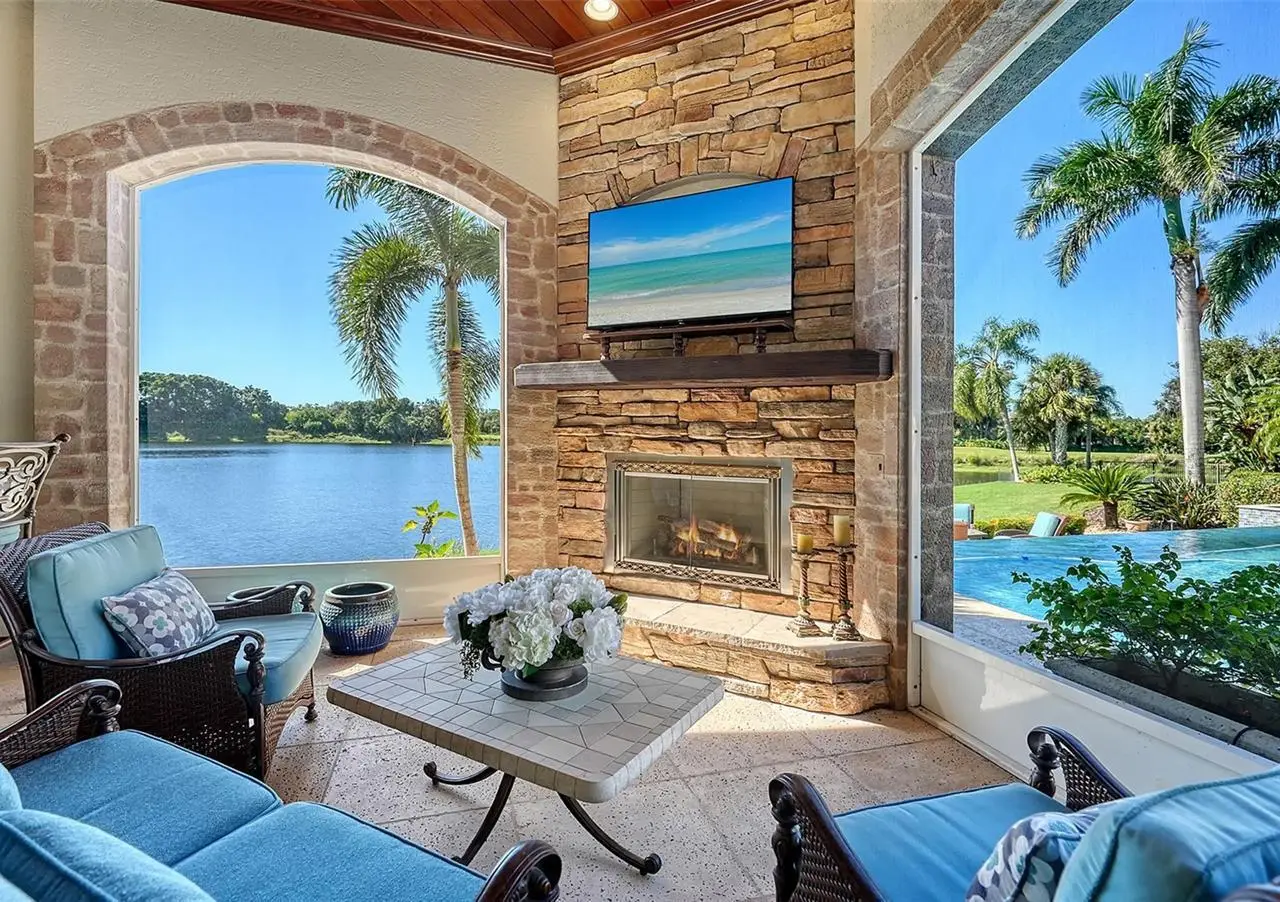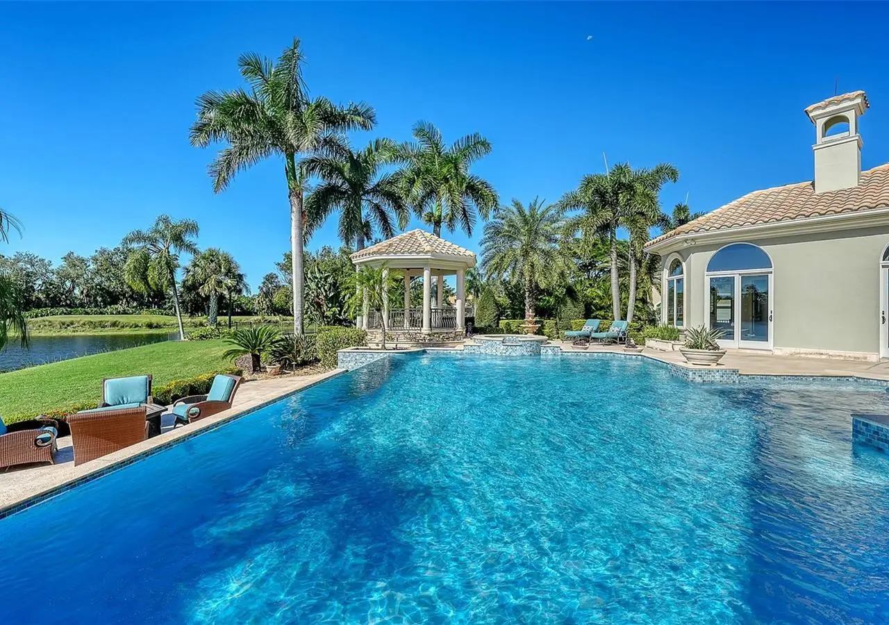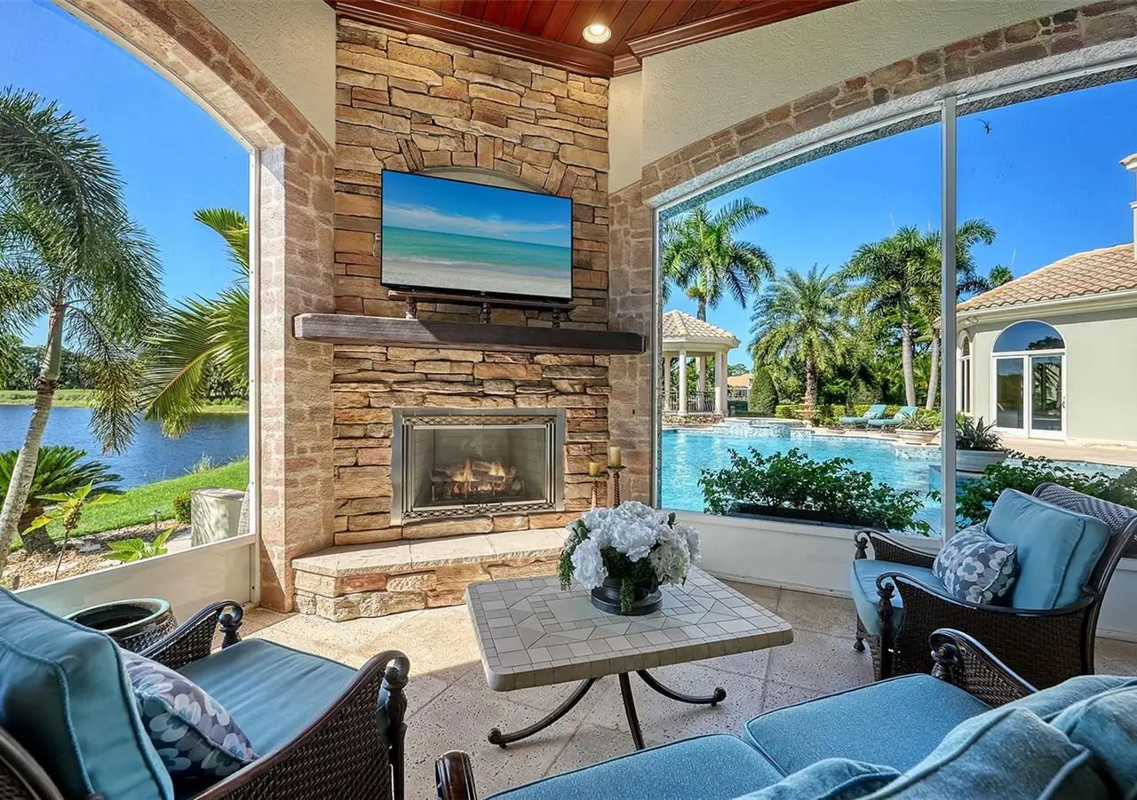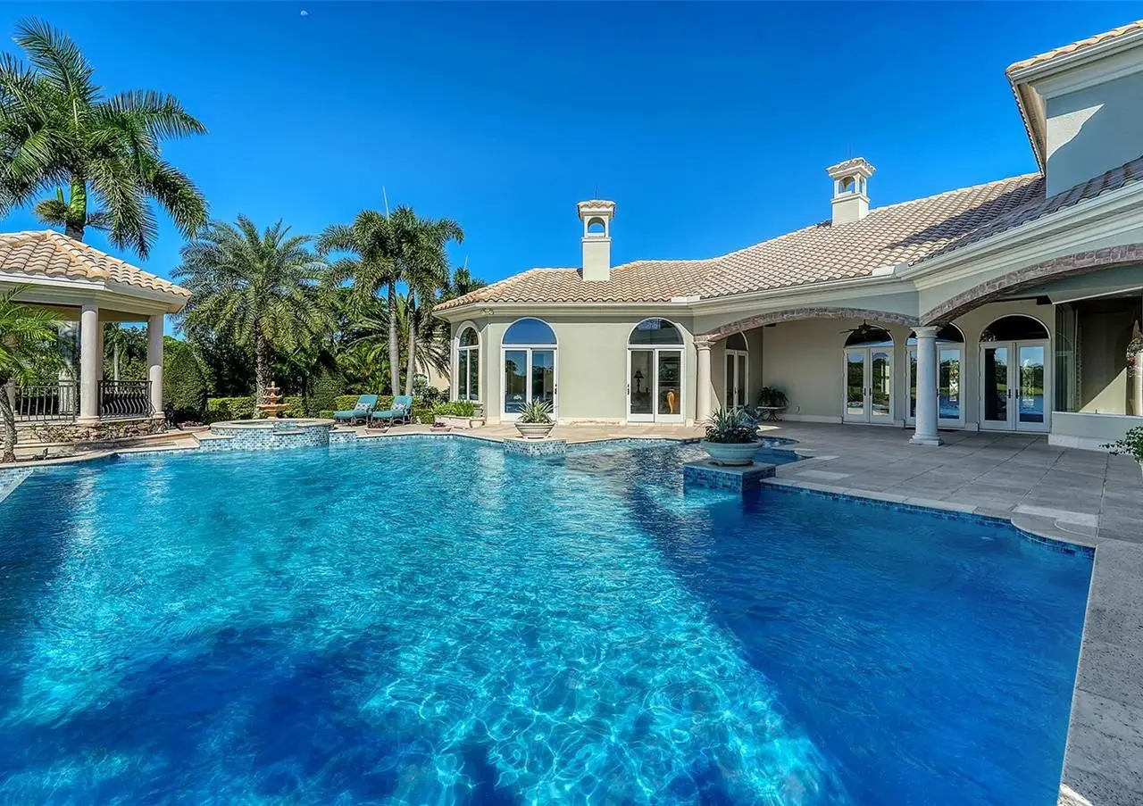 Inside the gates of University Park Country Club in the coveted enclave of Knightsbridge, this notable residence pairs timeless architecture with thoughtful modern UPDATES. Set on ¾ acre and the largest lakefront lot in the Park, the home enjoys complete privacy with sweeping water views and backdrop of the golf course in the distance. Built by one of Sarasota’s premier builders, the home is distinguished by an open-air infinity pool and spa (RE-SURFACED AND NEW TILE), fountains, a detached gazebo, and landscaping groomed to the hilt. The interior with travertine and walnut-plank flooring and custom millwork throughout is a testament of the finest craftsmanship. The everlasting finishes are enhanced with freshly painted walls, updated window treatments and other refinements throughout. The chef’s kitchen is a true centerpiece, recently enhanced with new quartz countertops. Custom cabinetry, a Butler’s Pantry and premium appliances include a six-burner Wolf range, separate wall oven, two Sub-Zero refrigerators, three dishwashers, and a built-in Miele coffee bar—ideal for entertaining on any scale. For those who pine for excellence in construction and everlasting elegance – the talent in this craft of fine carpentry has become more precious with time. The first-floor primary suite features custom closets, updated lighting and electronic shades, a dramatic fireplace, Anderson doors to the pool, and access to a private courtyard. Second level, accessed by ELEVATOR or a grand staircase, you’ll find a theater room for 8, a large bonus room with built-in media wall, full bar, sumptuous guest suite and a covered terrace. Additional highlights include a side entry 4-CAR AIR CONDITIONED GARAGE plus golf cart bay and a separate air-conditioned storage room. A whole house GENERATOR, water filtration and RO, smart lighting system, newer aluminum fencing to secure the entire rear side boundary lines, screened and full outdoor kitchen with stone fireplace, and updated audio system. This is resort-style living in one of Sarasota’s premier gated country club settings that continues to enjoy a reputation of the finest (optional) golf, tennis and racquet sports around. Social mixes and club dining is part of the lifestyle. Appreciate the unequivocal convenience to University Park’s shopping mecca nearby, fine dining, SRQ International Airport and downtown Sarasota just a short 20 minute drive.