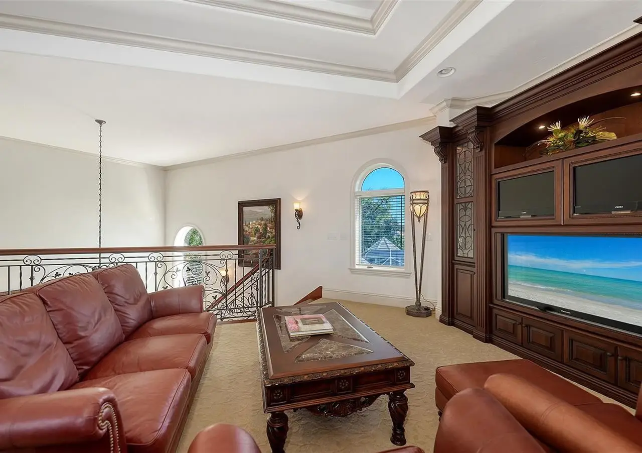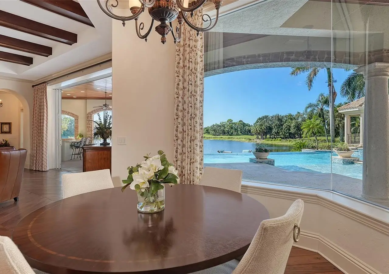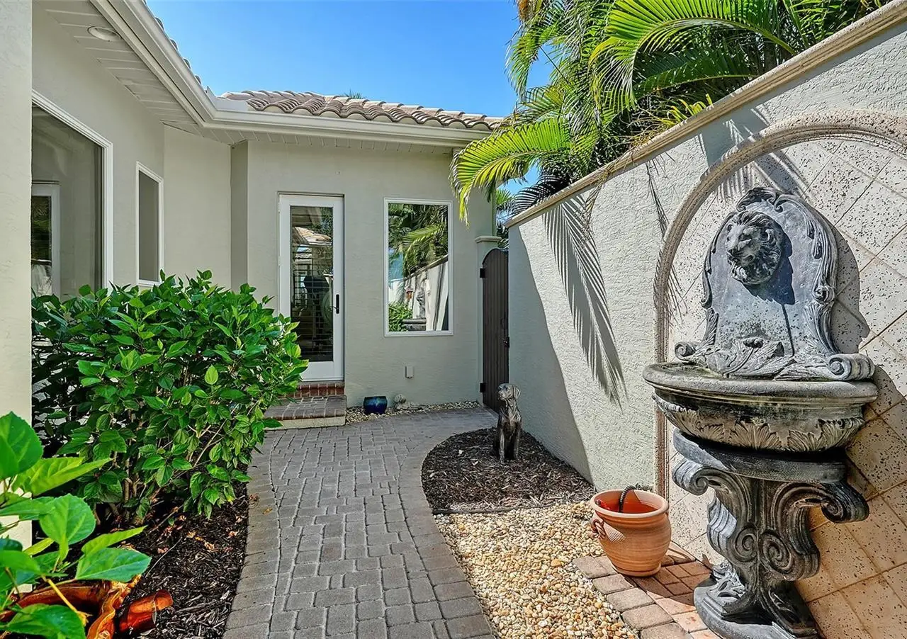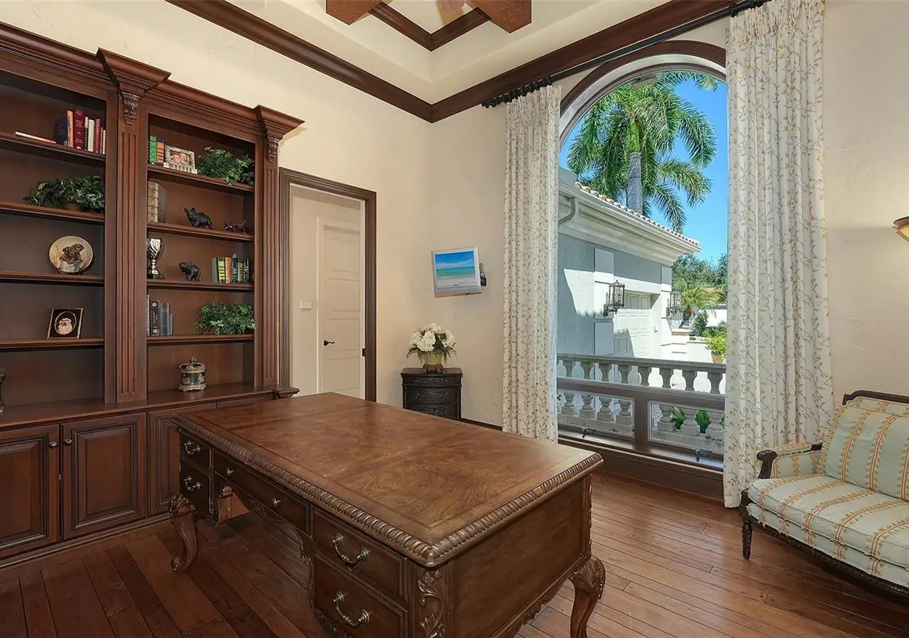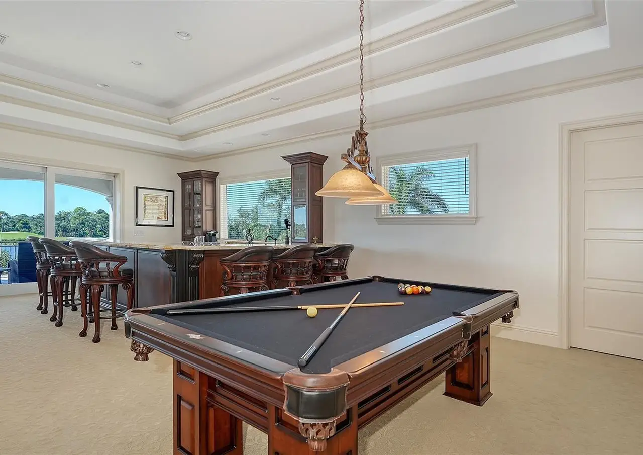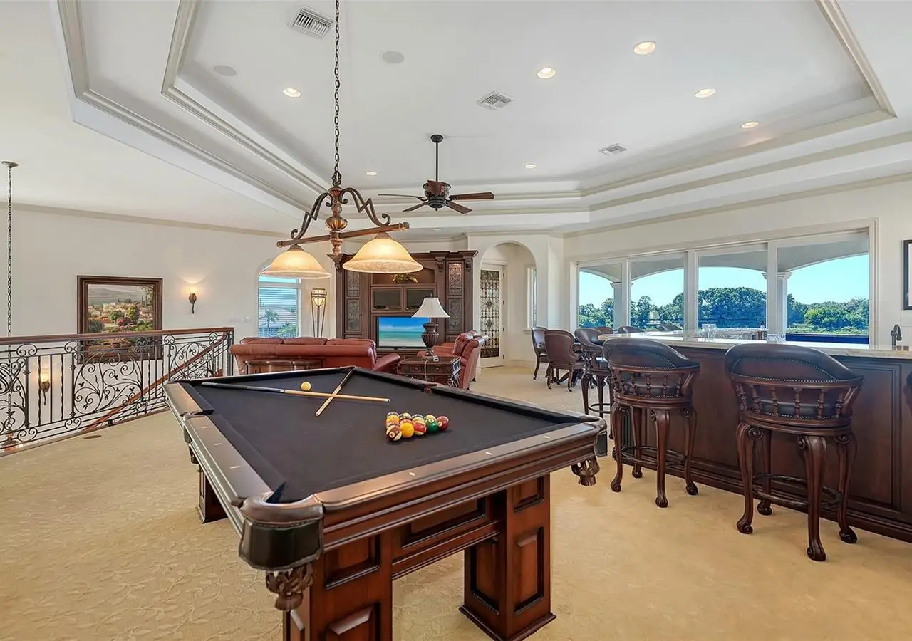 Inside the gates of University Park Country Club in the coveted enclave of Knightsbridge, this notable residence pairs timeless architecture with thoughtful modern UPDATES. Set on ¾ acre and the largest lakefront lot in the Park, the home enjoys complete privacy with sweeping water views and backdrop of the golf course in the distance. Built by one of Sarasota’s premier builders, the home is distinguished by an open-air infinity pool and spa (RE-SURFACED AND NEW TILE), fountains, a detached gazebo, and landscaping groomed to the hilt. The interior with travertine and walnut-plank flooring and custom millwork throughout is a testament of the finest craftsmanship. The everlasting finishes are enhanced with freshly painted walls, updated window treatments and other refinements throughout. The chef’s kitchen is a true centerpiece, recently enhanced with new quartz countertops. Custom cabinetry, a Butler’s Pantry and premium appliances include a six-burner Wolf range, separate wall oven, two Sub-Zero refrigerators, three dishwashers, and a built-in Miele coffee bar—ideal for entertaining on any scale. For those who pine for excellence in construction and everlasting elegance – the talent in this craft of fine carpentry has become more precious with time. The first-floor primary suite features custom closets, updated lighting and electronic shades, a dramatic fireplace, Anderson doors to the pool, and access to a private courtyard. Second level, accessed by ELEVATOR or a grand staircase, you’ll find a theater room for 8, a large bonus room with built-in media wall, full bar, sumptuous guest suite and a covered terrace. Additional highlights include a side entry 4-CAR AIR CONDITIONED GARAGE plus golf cart bay and a separate air-conditioned storage room. A whole house GENERATOR, water filtration and RO, smart lighting system, newer aluminum fencing to secure the entire rear side boundary lines, screened and full outdoor kitchen with stone fireplace, and updated audio system. This is resort-style living in one of Sarasota’s premier gated country club settings that continues to enjoy a reputation of the finest (optional) golf, tennis and racquet sports around. Social mixes and club dining is part of the lifestyle. Appreciate the unequivocal convenience to University Park’s shopping mecca nearby, fine dining, SRQ International Airport and downtown Sarasota just a short 20 minute drive.