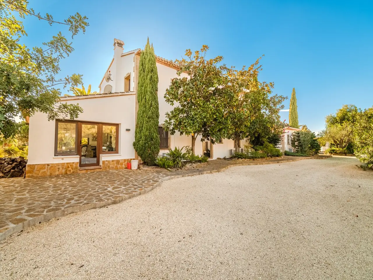 This charming traditional style villa is located in a fantastic residential area, just 3 km from Jávea. The beautiful house offers all the charm and wonderful natural surroundings of a true typical Spanish villa, set on a plot of approximately 16.000 m2, with its own vineyards, olive, grapefruit, almond and orange trees. In fact, this property has all the elements of the romantic ideal that attracts so many people to the Mediterranean region. The house covers a built area of 415m2, facing south and overlooking the Montgó. The main floor contains a charming dining room with fireplace, a fully equipped rustic kitchen, a bright living room, a TV room, two bedrooms with en-suite bathrooms and another living room/office. On the first floor you will find another bedroom with bathroom, the master bedroom, a rustic style suite with dressing room and a spacious bathroom. The basement level contains a wine cellar, pantry, laundry room and a spacious living room. The villa has terracotta floors and wooden doors, frames and beams, as well as modern facilities and comforts such as central heating, air conditioning and an automatic irrigation system. In addition, there is a separate casita consisting of a living room with fireplace and kitchen, 1 bedroom and 1 complete bathroom. In a property like this much of the focus is on the nature of the exterior, which adds to the quality of life. A feature to note is the large porch leading to the lawn, a green area flanked by a consolidated garden and a barbecue area with equipped summer kitchen. The epicentre of the garden is a 12x6 metre heated swimming pool (salt water) from where you can enjoy beautiful mountain views. The large private fenced plot has its own driveway leading to a patio and a pergola for three cars, a large storage room and a water deposit. Within a few minutes drive you can access the magnificent beaches and coves, protected natural areas and the beautiful old town of Jávea, as well as several golf courses, spa hotels and a wide range of water sports and horse riding. Charming rustic villa with modern facilities, exquisite gardens and a large swimming pool, surrounded by grapefruit, almond and orange groves, just 3 km from Jávea.
