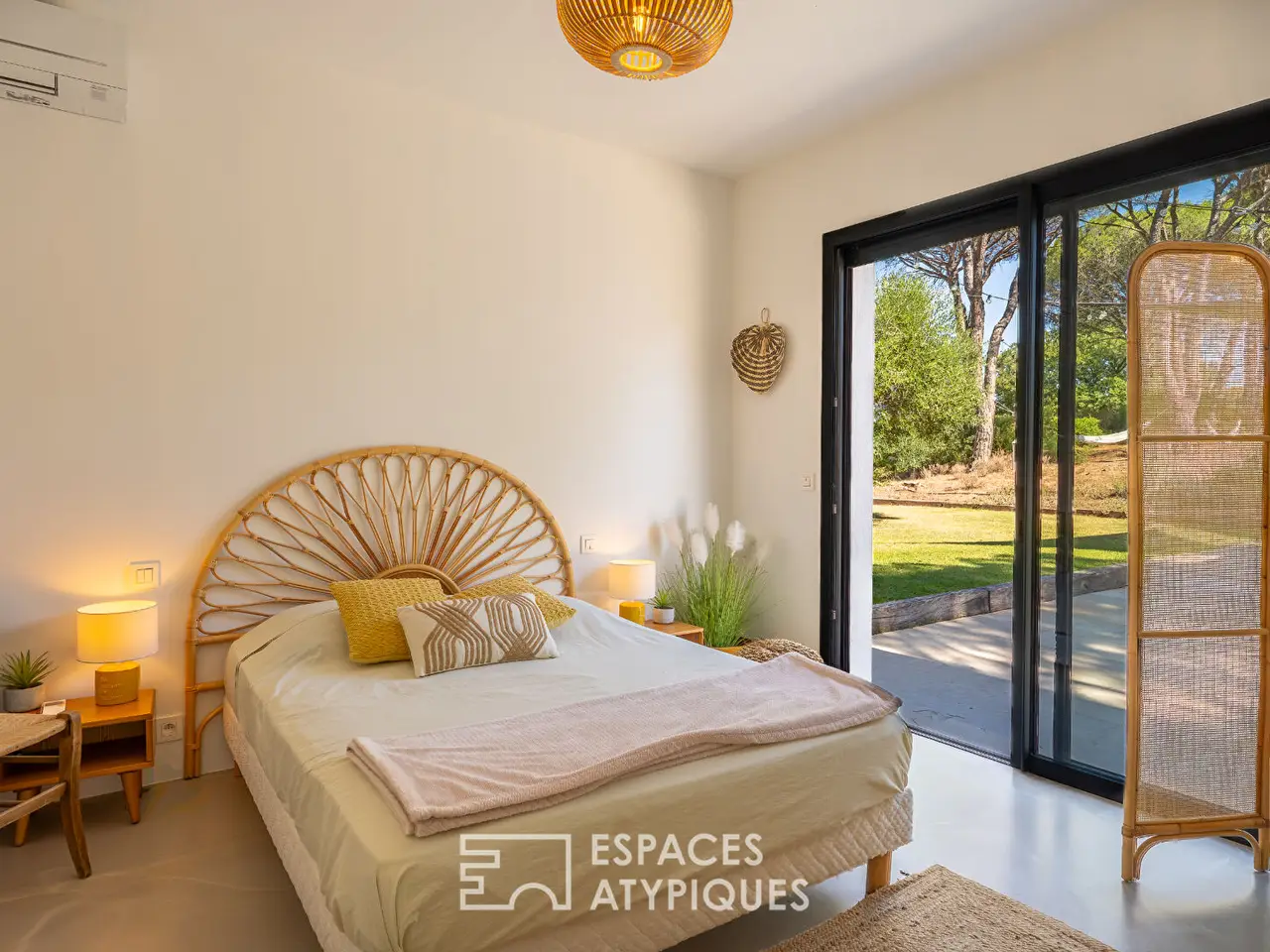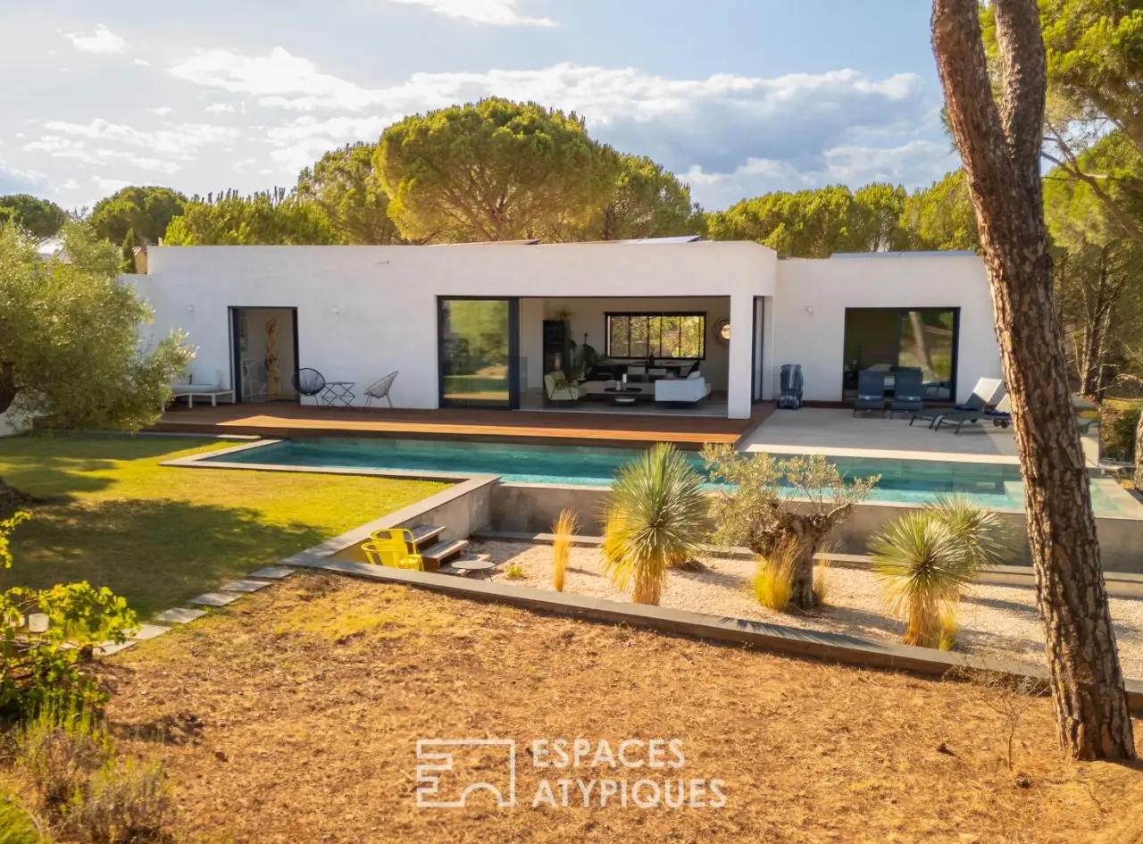 Architect-designed villa in the heart of the vineyards - In the heart of a privileged residential environment, this contemporary architect-designed villa of approximately 180 sqm stands on a vast plot of over 2,600 sqm. In a peaceful setting, it offers an exceptional living environment in the vineyards, with a heated infinity pool and several furnished terraces, inviting relaxation and conviviality with views of the Massif des Maures. The interior design is distinguished by an optimized layout and generous volumes. The main living room of over 75 sqm, bathed in natural light thanks to large bay windows, opens onto the exterior. It offers an elegant living room, a spacious dining room, and a fully equipped open kitchen with a central island. The high-end materials, clean lines, and careful decoration contribute to creating an atmosphere of serenity and modernity. In the extension, a relaxation area with a television lounge and billiards table promises convivial moments. The sleeping area consists of two bedrooms, each with a private bathroom, as well as a spacious master suite with a dressing room. A separate 50sqm apartment with its own outdoor space, consisting of a living room-kitchen, a bedroom, and a bathroom, is a real asset for entertaining friends or family, or for rental income. Outside, the landscaped garden is a true invitation to well-being. The infinity pool surrounded by a wide wooden deck and several lounge areas is the focal point of this villa. The Mediterranean vegetation brings freshness and privacy, creating a true haven of peace. A 50m3 pool house, a double garage, and a laundry room complete the features of this property. Close to all amenities, yet sheltered from view, this property is a prestigious residence rare on the market. This architect-designed villa embodies the perfect blend of design, functionality, and elegance. Its unique architecture and high-end services make it an exceptional property, a prime address for a life combining luxury and comfort. ENERGY CLASS: A (57 kWh/m2/year) / CLIMATE CLASS: A (1 kg CO2/m2/year). Estimated annual energy expenditure for standard use between EUR1,070 and EUR1,520 indexed to the years 2021, 2022 and 2023 (subscription included)REF. 12243Additional information* 7 rooms* 4 bedrooms* 4 shower rooms* 1 floor in the building* Outdoor space : 2635 SQM* Parking : 4 parking spaces* Property tax : 3 575 €Energy Performance CertificatePrimary energy consumptiona : 57 kWh/m2.yearHigh performance housing*57kWh/m2.year1*kg CO2/m2.yearA*B*C*D*E*F*GExtremely poor housing performance* Of which greenhouse gas emissionsa : 1 kg CO2/m2.yearLow CO2 emissions*1kg CO2/m2.yearA*B*C*D*E*F*GVery high CO2 emissionsEstimated average annual energy costs for standard use, indexed to specific years 2021, 2022, 2023 : between 1070 € and 1520 € Subscription IncludedAgency feesThe fees include VAT and are payable by the vendorMediatorMediation Franchise-Consommateurswww.mediation-franchise.com29 Boulevard de Courcelles 75008 ParisInformation on the risks to which this property is exposed is available on the Geohazards website : www.georisques.gouv.fr
