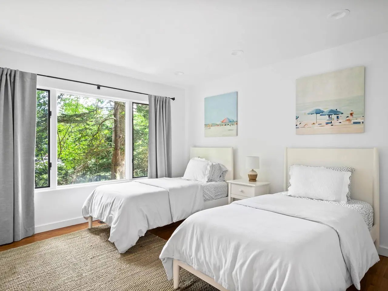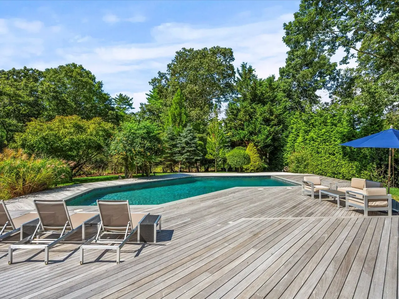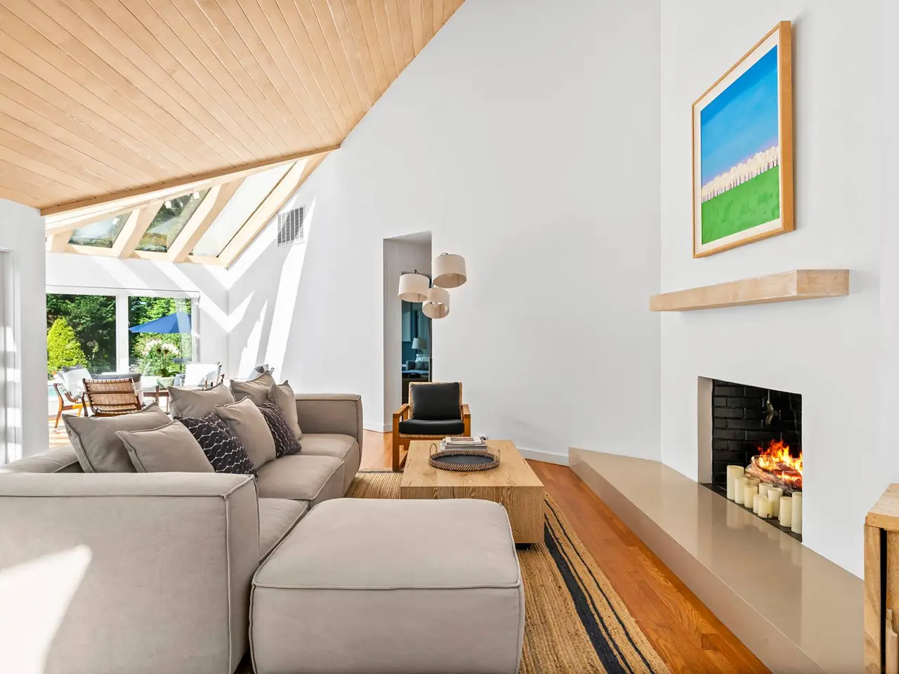 This sun-filled contemporary home situated on a private 1 +/- acre was meticulously renovated in 2021. A thoughtfully designed floor plan provides 3,500 +/- square feet of open living space, 3 bedrooms, 3 baths and a den. The dramatic open-concept layout is highlighted by expansive skylights that fill the home with natural light. The first floor features a living room with fireplace, a stylish dining area, a sleek eat-in kitchen and comfortable family room, all seamlessly integrated. Walls of sliding glass doors connect the interior to an expansive multi-level wood deck surrounding a heated gunite pool, providing a relaxing indoor-outdoor lifestyle. The first floor also includes two separate bedroom wings; a tranquil primary suite and an additional guest suite with a full bath and adjacent den. Upstairs, a private loft-style bedroom suite features its own deck overlooking the pool, offering an ideal retreat for guests. Additional amenities are a full unfinished basement, a two-car garage, and mature landscaping. Enjoy close proximity to Quogue Village shops, dining and beach - making this a perfect year-round residence or weekend escape. Listing ID: 925757