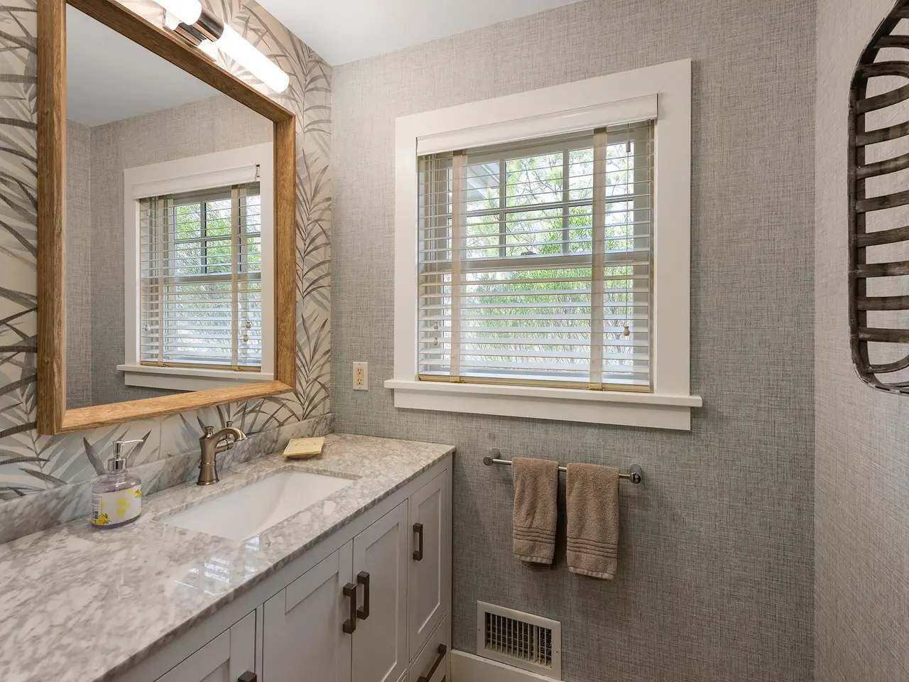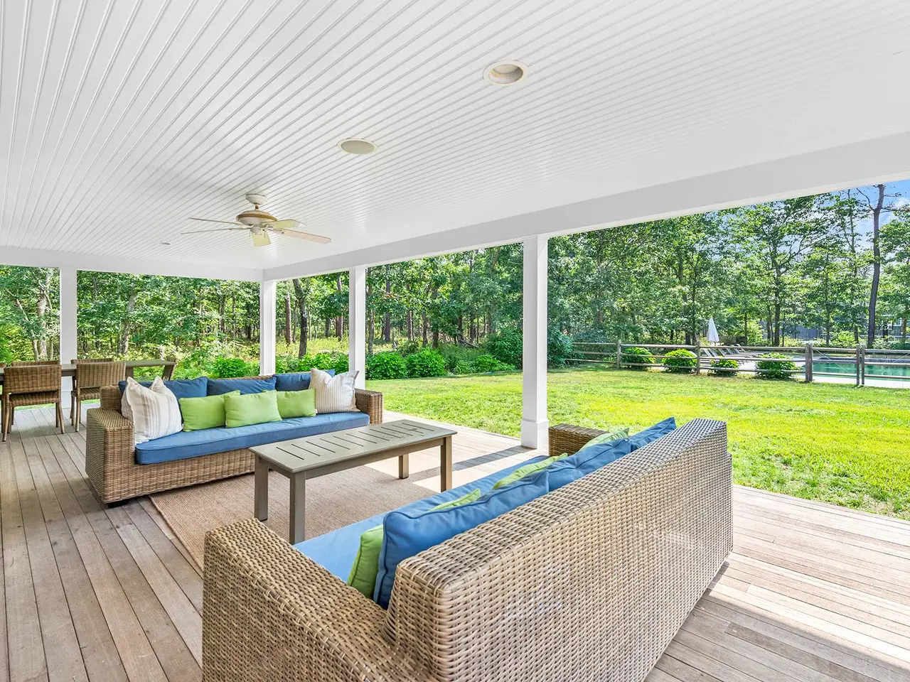 Privacy abounds in this beautifully renovated Wainscott traditional home. Sited on 5.5 acres with deco turf tennis/basketball this 4,500 square feet with 2,500 square foot lower level seven bed, 6.5 bath is the perfect summer rental. As you enter the grand open living areas, you are greeted with tons of natural light from a wall of French doors that open to expansive outdoor deck area. The living room flows into dining area and huge eat-in renovated chef's kitchen with island seating, marble counter tops, stainless steel appliances and breakfast area with window seating. Bedrooms and baths consist of a first floor primary suite with vaulted ceilings, access to the backyard and a renovated expansive en suite bathroom. There is another main floor bedroom as well. The second floor boast an additional primary bedroom with double granite vanity and soaking tub and access to a 2nd floor decked balcony. There are 3 other oversized en-suite guest bedrooms. The newly finished lower level consists of two more bedrooms, movie/media room and gym. The back deck has expansive covered seating and dining areas with outdoor kitchen with DCS grill that looks onto a beautifully landscaped yard and 20x40 heated gunite swimming pool. Beyond the pool lies the tennis court with basketball net that is perfect for all sports lovers. Other features include a new Jacuzzi, a two-car garage, and an outdoor shower. There's easy access to East Hampton and Sag Harbor villages! Prime location and close proximity to both bay and the ocean beaches.