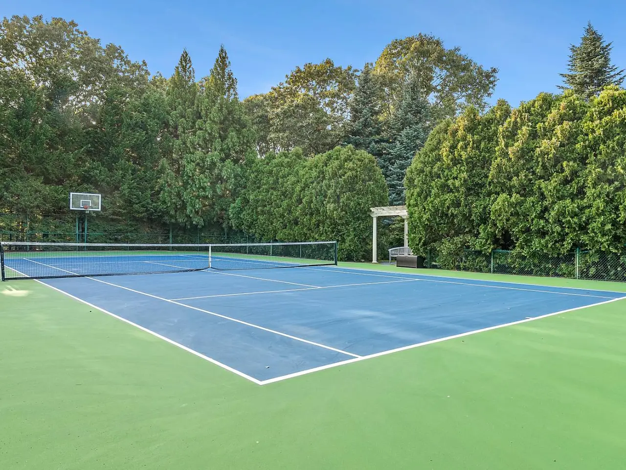 Rental Reg. # 22-399. Wainscott hidden gem - tranquility at its finest! Five bedrooms, four baths with pool, tennis, and putting green on 2.4 acres. This is a stunning meticulous light and bright five bedroom (two up, three down), four bathroom home. Features three en suite bedrooms, including two master suites. The open concept living room is sun-filled with open gourmet kitchen dining area with French doors leading outside to beautiful grounds featuring a heated 20x40 gunite pool, a secluded tennis court with basketball and putting green and sand trap. Conveniently located, only a five-minute drive to Sag Harbor's Main Street and bay and ocean beaches and seven-minute drive to East Hampton and Bridgehampton. This beautifully landscaped property offers colorful gardens. A private serene retreat, perfect property for entertaining as well as relaxation. Features six smart TVs, surround sound music, Sonos zones inside and out, and high speed Internet.