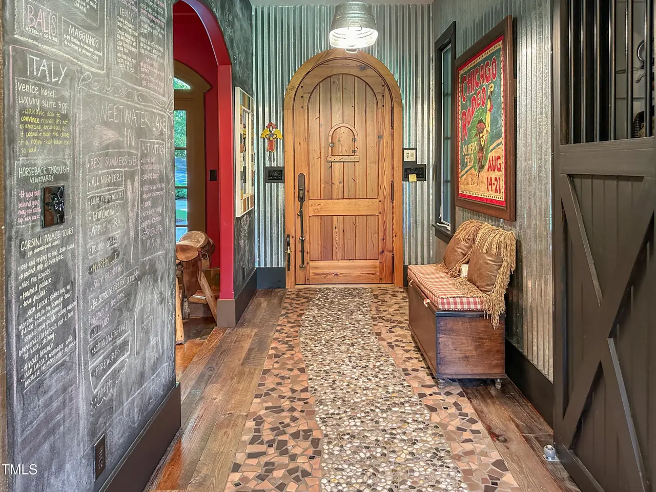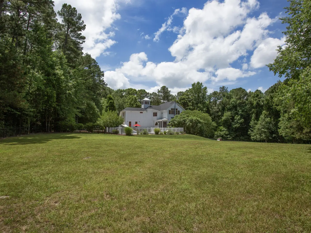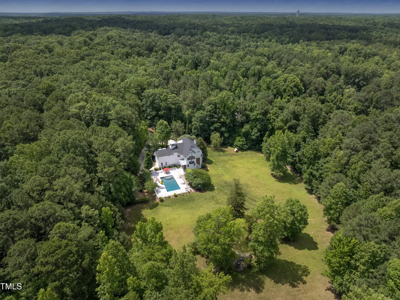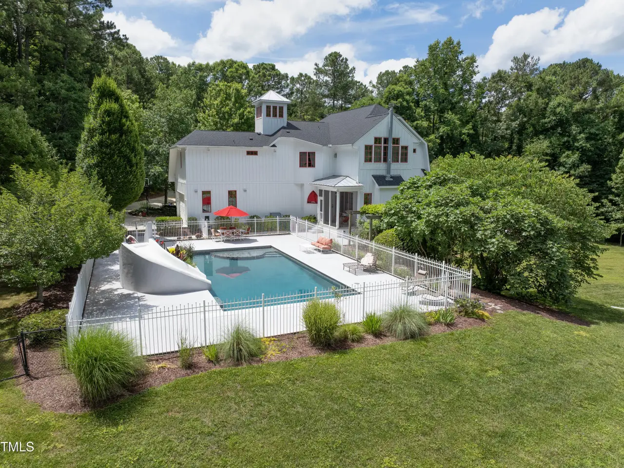 An Artist's Dream Home. This five bedroom and 4.5 Bath Custom Home is full of Character and Creative Flair. Nothing boring here! This home was designed with a vibe for the imaginative person who loves Free Flowing Rooms with whimsical touches. A uniquely different home surrounded by stunning landscapes. It's filled with natural wood carvings, art, and creative wrought iron accents. The home sits on 5.5 acres with stunning views of trees, open spaces, a swimming pool, a huge yard, and backs onto Falls Lake. It features an open kitchen with a bar and a sitting room with a fireplace, a craft room, an office area, and a pantry/mudroom. The second floor has a master suite, oversized bedrooms, private baths, and plenty of room to expand. The lower level includes a family room, guest bedroom, and ample storage. Enjoy a quiet walk around the grounds or to the lake. Relax on the large covered front porch or by the pool. It also offers easy access to shopping, RTP, and I-540.