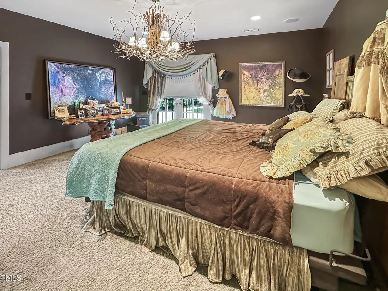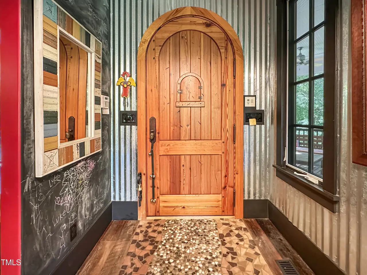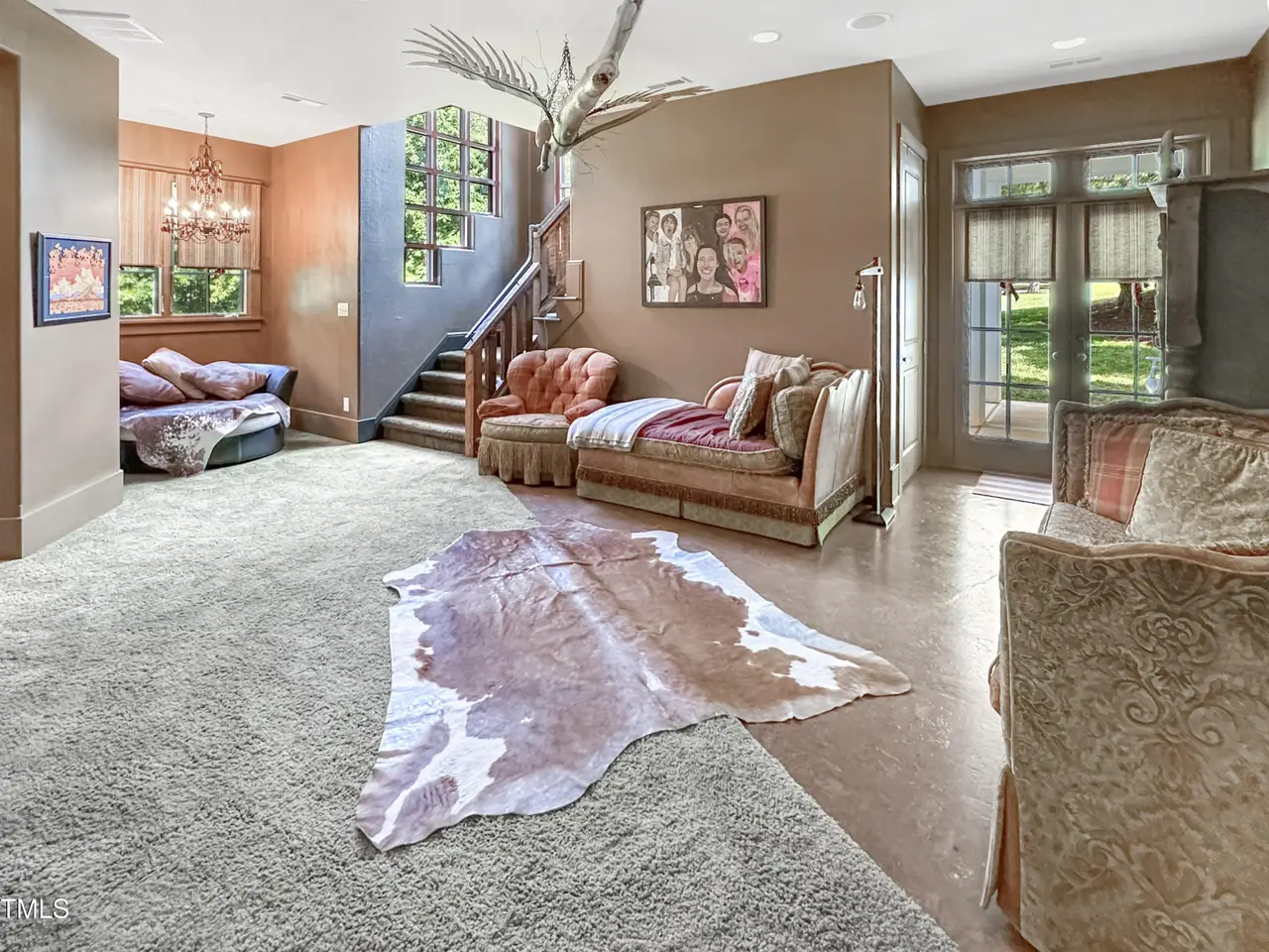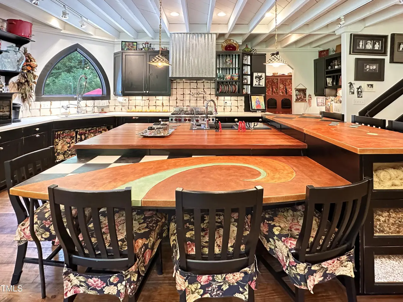 An Artist's Dream Home. This five bedroom and 4.5 Bath Custom Home is full of Character and Creative Flair. Nothing boring here! This home was designed with a vibe for the imaginative person who loves Free Flowing Rooms with whimsical touches. A uniquely different home surrounded by stunning landscapes. It's filled with natural wood carvings, art, and creative wrought iron accents. The home sits on 5.5 acres with stunning views of trees, open spaces, a swimming pool, a huge yard, and backs onto Falls Lake. It features an open kitchen with a bar and a sitting room with a fireplace, a craft room, an office area, and a pantry/mudroom. The second floor has a master suite, oversized bedrooms, private baths, and plenty of room to expand. The lower level includes a family room, guest bedroom, and ample storage. Enjoy a quiet walk around the grounds or to the lake. Relax on the large covered front porch or by the pool. It also offers easy access to shopping, RTP, and I-540.