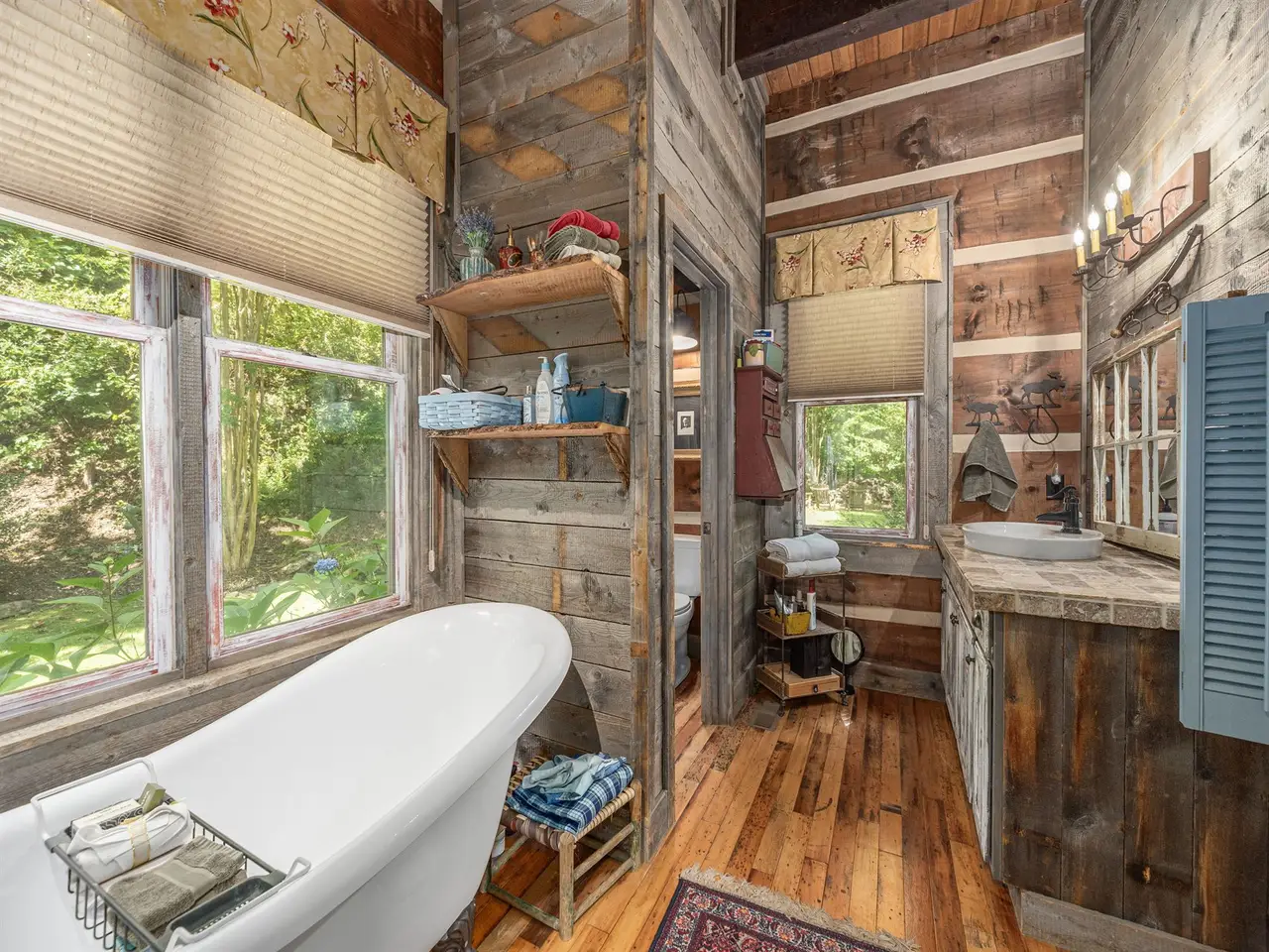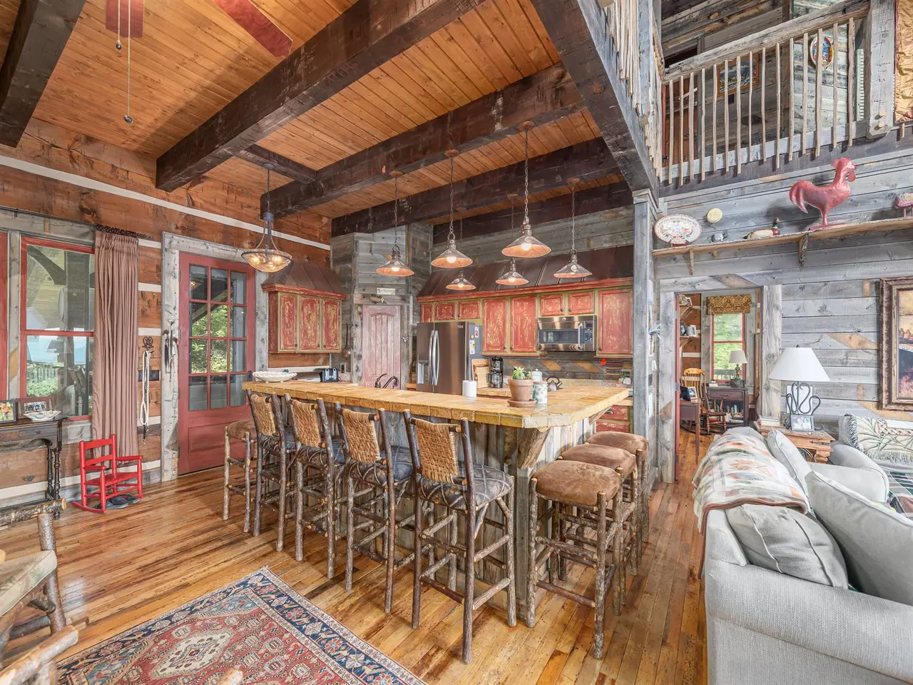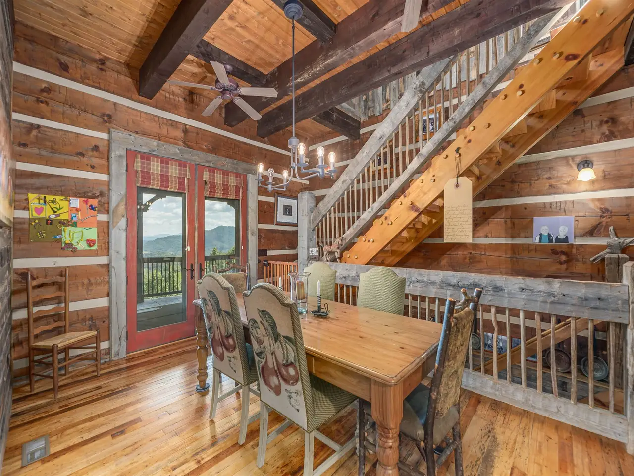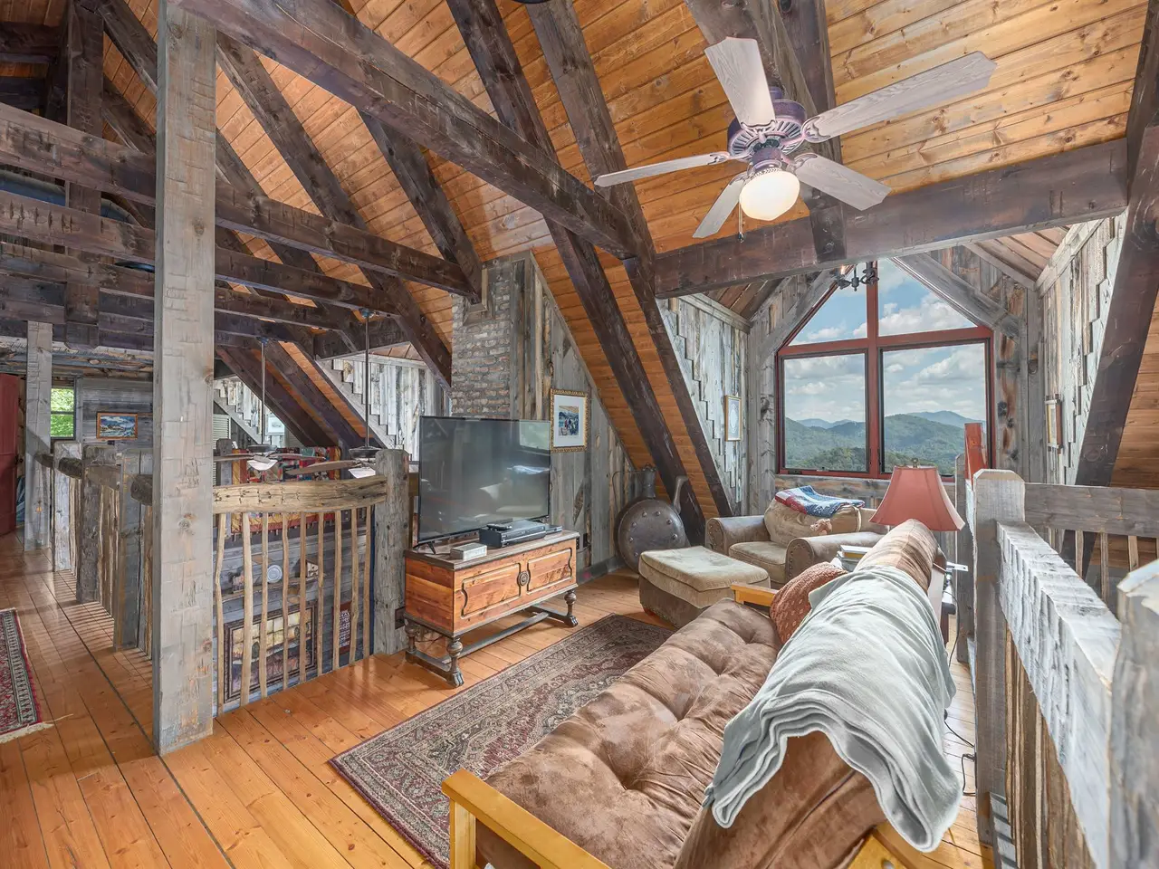 Only one home in Waynesville offers a seamless blend of luxury, craftsmanship, and breathtaking mountain vistas. Nestled on 2.44 acres of usable land, this custom-designed residence showcases artisanal reclaimed materials, open-concept living, and intentional design throughout. Built by the esteemed George Blackburn, this extraordinary property is a rare combination of artistry, functionality, and unparalleled mountain beauty. Step inside to discover remarkable custom woodwork, snow fence walls, and a stunning Chicago brick fireplace - all complimented by historic Maple Gin Mill floors. The gourmet kitchen features hand-painted cabinetry, tumbled marble tile, and stainless appliances. The great room boasts sweeping long-range mountain views, a cozy wood stove, and an adjoining dining space - perfect for entertaining. Retreat to the main level primary suite, complete with private deck access, two walk-in closets, and a luxurious bathroom with a clawfoot tub and walk-in shower. Upstairs, the guest rooms offer multiple spaces for rest or creative pursuits, two bathrooms, and two flexible alcoves - all framed by panoramic long-range mountain views. The terrace level allows for recreation, hobbies, and storage, finished with a full bathroom. The expansive main level cedar deck and terrace level deck seamlessly integrate the home with its natural surroundings, creating the perfect setting for outdoor enjoyment. Experience this one-of-a-kind luxury retreat where the mountains meet the clouds.