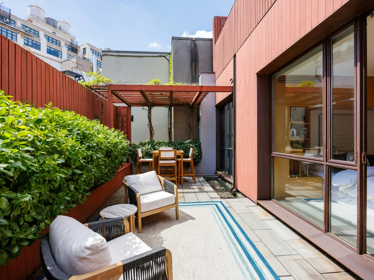 With 29 feet of frontage, including a curb cut, this fabulous 9,000 square foot home features double height ceilings, six outdoor spaces, a private covered parking spot, and an elevator that services the basement to roof deck. Step in off of charming Downing Street to an "open air" garage, that could be used as a garage, a front garden or party space too, with storage. Beyond the garage is the ground floor duplex that could be a perfect guest apartment, art studio, or company headquarters OR it can be combined with the rest of the house into one magnificent single family home. (If part of a single family home the ground floor would make an amazing kitchen/great room open to the back garden.) Features of this lower duplex include three bedrooms and three bathrooms and ceiling heights of over 16 feet in the main space with light streaming in from skylights. This dramatic great room has plenty of space for both a living and dining area, as well as direct access to the tranquil garden. Also on this floor is the large chef's kitchen, as well as a bonus room that has an en-suite bathroom and washer/dryer. The mezzanine level features three oversized bedrooms and two bathrooms. Currently, the main part of the townhouse begins on the second floor, which provides almost unlimited entertainment space with an 80 foot long great room with two terraces and a powder room. The adjacent, open kitchen boasts a 4 burner Garland stove with griddle, 48" Miele refrigerator/freezer, two sinks, two dishwashers, and a Gaggenau hot plate. Up a stunning, curved architectural staircase is the 3rd floor, which currently has two bedrooms, two bathrooms and a large office/den area with three built-in desks and tons of storage that is open to the great room below. Both bedrooms have en-suite bathrooms, built-in desks and the larger bedroom has access to a private terrace. The fourth floor is dedicated to the primary suite and boasts a wrap-around terrace with tall mature plantings and a wooden fence for privacy . The primary bedroom features custom built-ins and opens up to a nearly 30 foot long outdoor space with a pergola and plenty of seating space. The custom primary bath has a double vanity, deep soaking tub, separate shower, and water closet with a bidet. There is also a cedar walk-in closet and a sitting room/lounge with a fireplace, wet bar and additional storage that also has access to the terrace. The gorgeous roof deck, accessible from the elevator , boasts fantastic open skyline views, including the Empire State Building and Hudson Yards. The deck includes multiple seating areas, a pergola, and mature landscaping including birch trees. This unique home also includes a basement with additional storage and laundry. The house is currently configured as two condominium units, and is delivered vacant.