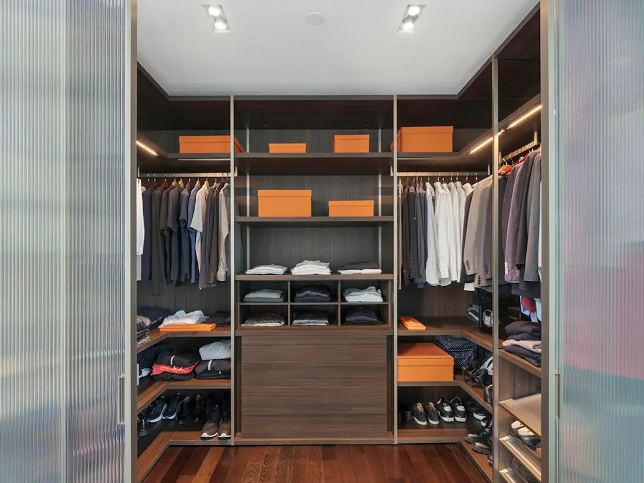 Boffi walk-in wardrobe with fluted glass pocket doors