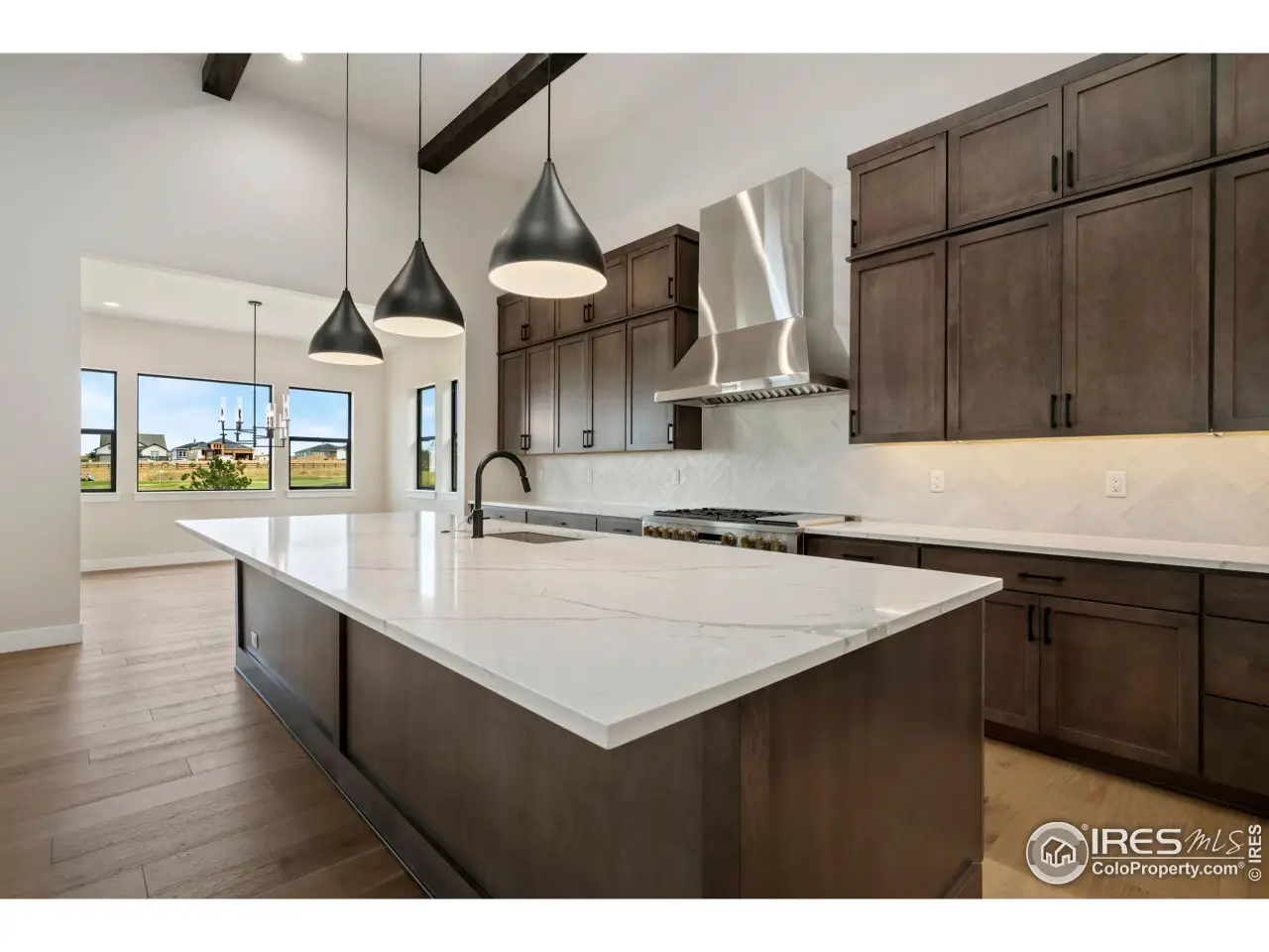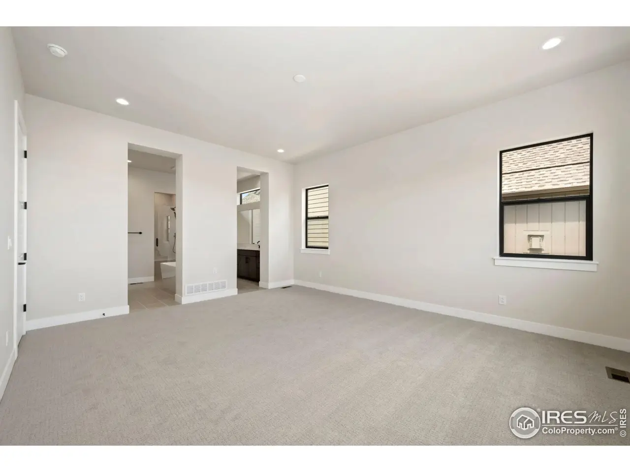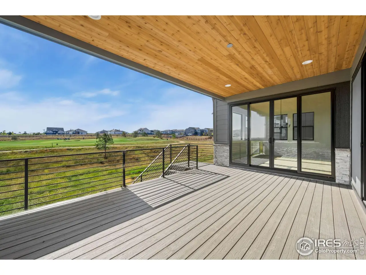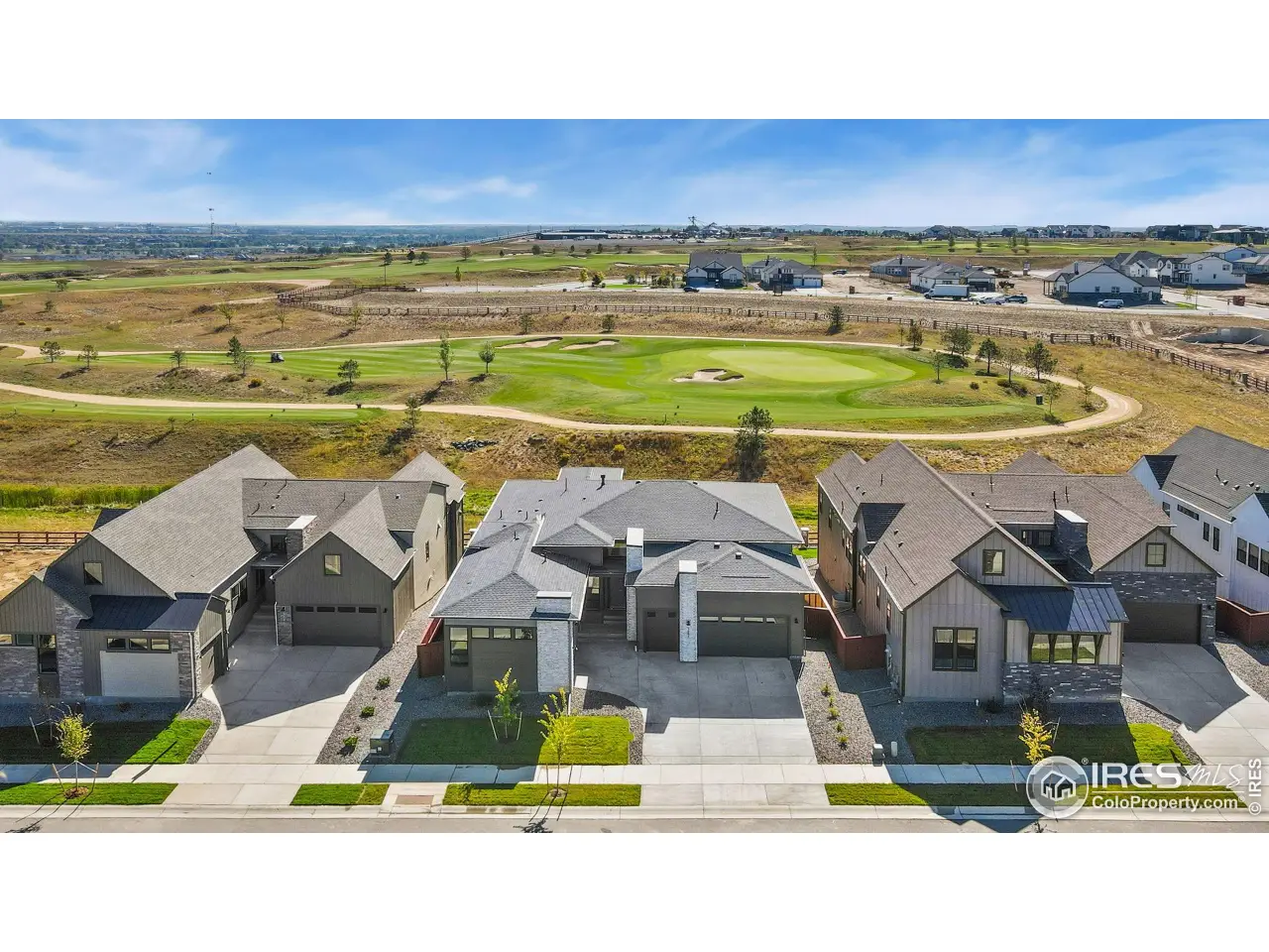 The stunning Modern Prairie Broadmoor at The Fairways in RainDance by Trumark Homes features an inviting porch. Beautiful single-story home offers 4,871 sq. ft. of finished space with 4 bedrooms and 4.5 baths. Past the entryway is a large great room and gourmet kitchen with a walk-in pantry and a prep island. Enjoy dusk-stained shaker-style cabinetry, Calacatta Laza countertops with tile backsplash, chef grade stainless steel appliance package, and decorative matte black fixtures. The great room, complete with stained ceiling beams and a modern linear gas fireplace, is filled with natural light and overlooks the covered outdoor deck to take in the stunning views of the high-plains links-style golf course at RainDance National. Down the hall you'll find a second sitting room, spacious laundry with sink, and two bedrooms both with ensuite baths. Off the great room is the office with glass wall and door and contemporary grand suite, including a luxurious bathroom with two sinks, walk-in shower, and an elegant freestanding tub. An expansive walk-in closet completes the primary suite. The home also comes with natural stained engineered hardwood flooring throughout the main floor with luxurious carpet in bedrooms, spacious 10-foot ceilings on the main floor and the partially finished walkout basement is complete with wet bar, bedroom, bath and large rec room for entertaining with a sliding glass door and oversized private concrete patio. Eight- foot interior doors, insulated steel garage doors, tankless water heater, AC, front yard landscaping, golf cart garage, and more! Neighborhood amenities; trails, orchards, non-potable water, trash, included in your metro district fees. Membership to the Raindance pool is optional/currently $510/year; other options combining amenities in Raindance and Water Valley - "WaterDance"!