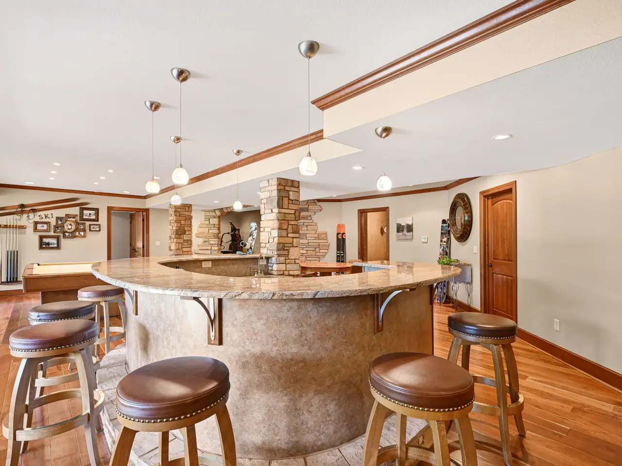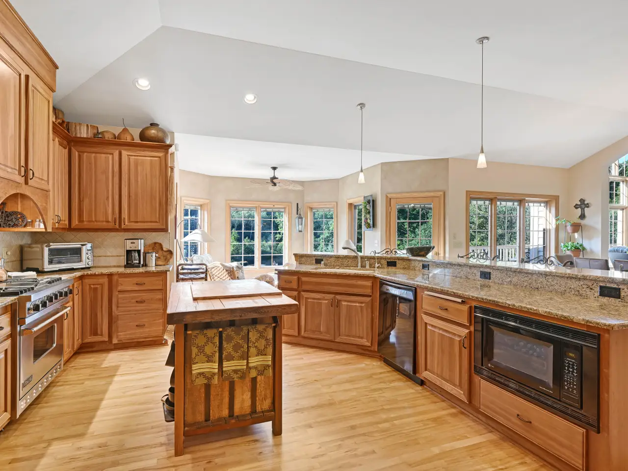Secluded Executive Walk-Out Ranch. Tucked away on a quiet cul-de-sac, this stunning 3-bedroom, 3.5-bath executive walk-out ranch offers luxurious living space on a serene, park-like 1.9-acre wooded and fenced lot. Designed with quality in mind, this home combines privacy, elegance, and functionality. The open-concept great room features a wall of windows that flood the space with natural light and seamlessly connects to the formal dining area, sunroom, and chef's kitchen. The gourmet kitchen is a dream, complete with a large breakfast bar, cherry wood cabinetry, granite countertops, a professional-grade Viking stove, and a Sub-Zero refrigerator - perfect for entertaining or everyday living. 3.5-car heated garage includes a built-in dog wash and direct stair access to the lower level. The fully finished walk-out lower level is ideal for multigenerational living or in-law accommodations, featuring a bedroom, full tiled bath, large family room, and rec room - all finished with the same high-quality craftsmanship as the main level.