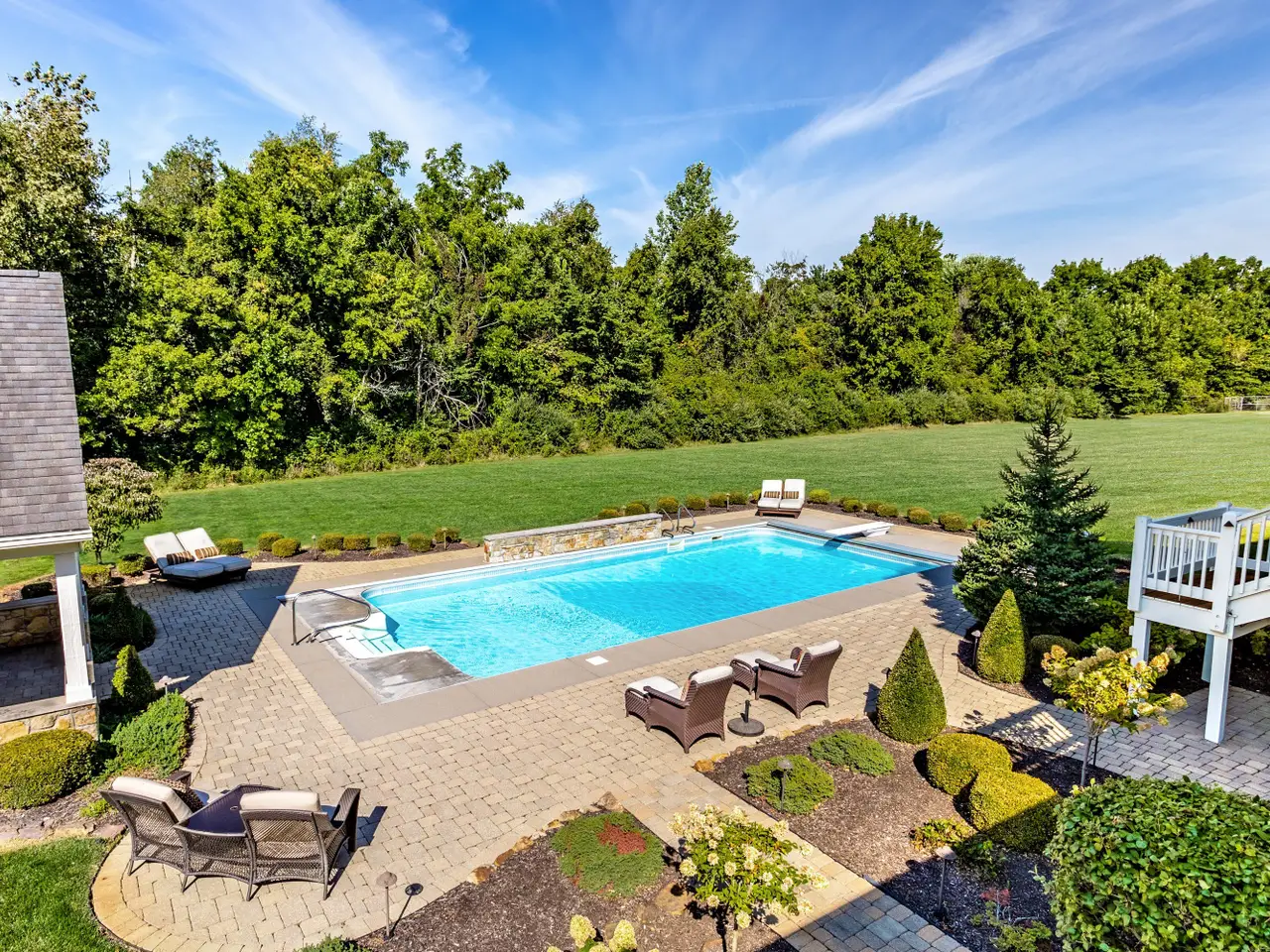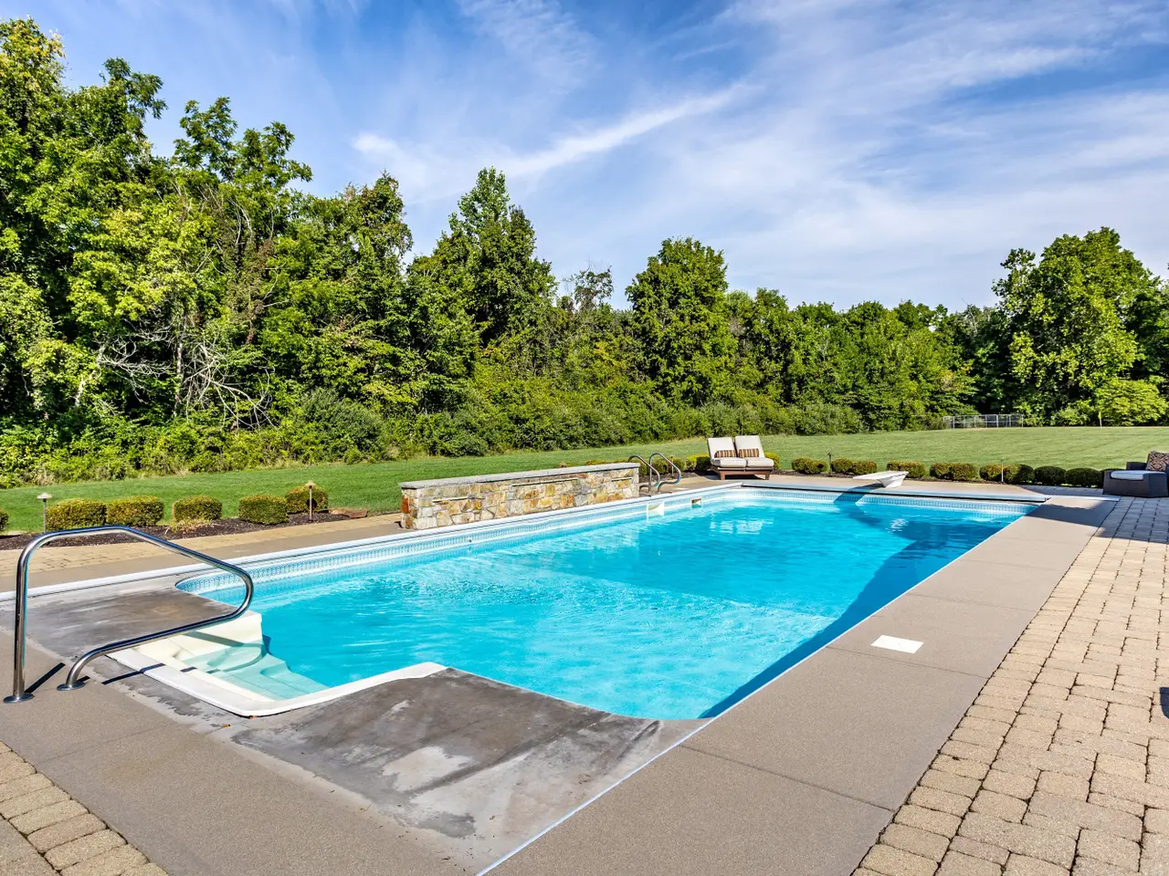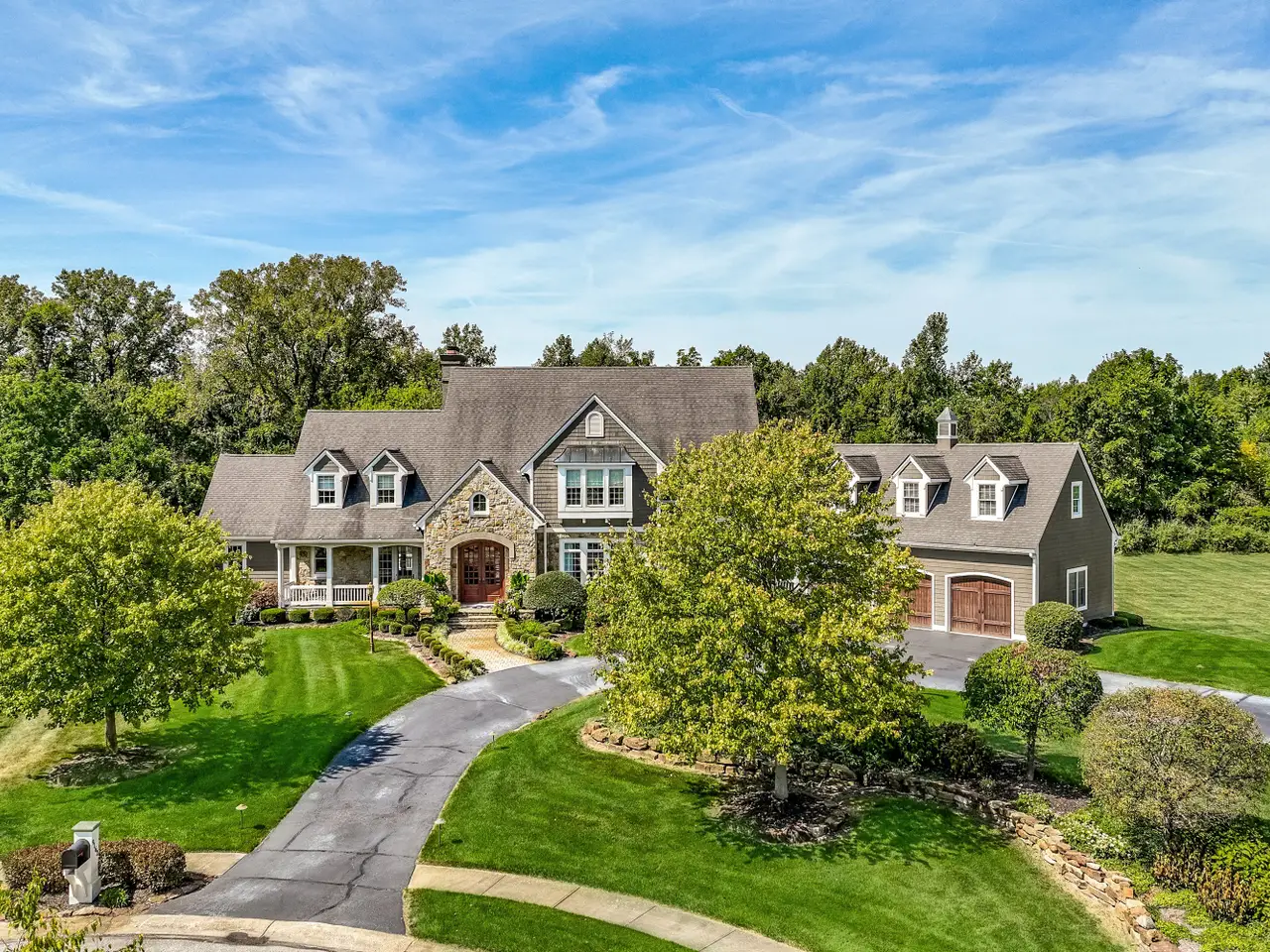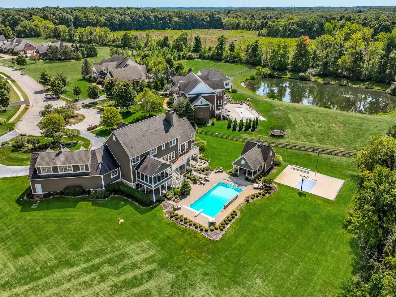 Nestled on 4 private acres at the end of a quiet cul-de-sac, this extraordinary 8-bedroom, 7 full and 2 half bath estate offers the perfect blend of elegance, warmth, and everyday livability. It's more than just a house....it's a home. Offering 9,900+ finished square feet, this home was designed with a calming, inviting flow. The enchanting floor plan showcases soaring ceilings, abundant natural light, and exquisite craftsmanship at every turn. The main level features newly refinished hardwoods throughout, anchored by a show-stopping great room with an oversized stone fireplace and coffered ceilings. The dreamy chef's kitchen is a true centerpiece, featuring double commercial-grade gas ovens and ranges, quartz surfaces, custom backlighting, and seamless access to both formal and casual dining areas. The primary suite is a sanctuary of its own, complete with a private sitting room, cozy fireplace, spa-inspired bath, and direct access to the outdoor deck. Up its own private staircase is a fully outfitted in-law/guest suite perfect for extended stays. The finished lower level is equally impressive, bathed in sunlight through two sets of French doors and designed for both entertainment and relaxation. Highlights include a state-of-the-art theater room, full wet bar, wine cellar, exercise room, and two additional fireplaces. Outdoor living is equally spectacular. Framed by lush woods, the in-ground pool with poolhouse creates a resort-like setting, while a basketball court, soccer field and baseball diamond offer endless recreation. Enjoy 'smores by the firepit, watch pool shenanigans, or enjoy a happy hour cocktail from the enormous deck--the choice is all yours. Property parcel includes 2 lots, allowing for additional building options. PVE Elementary and ZMS Middle School.