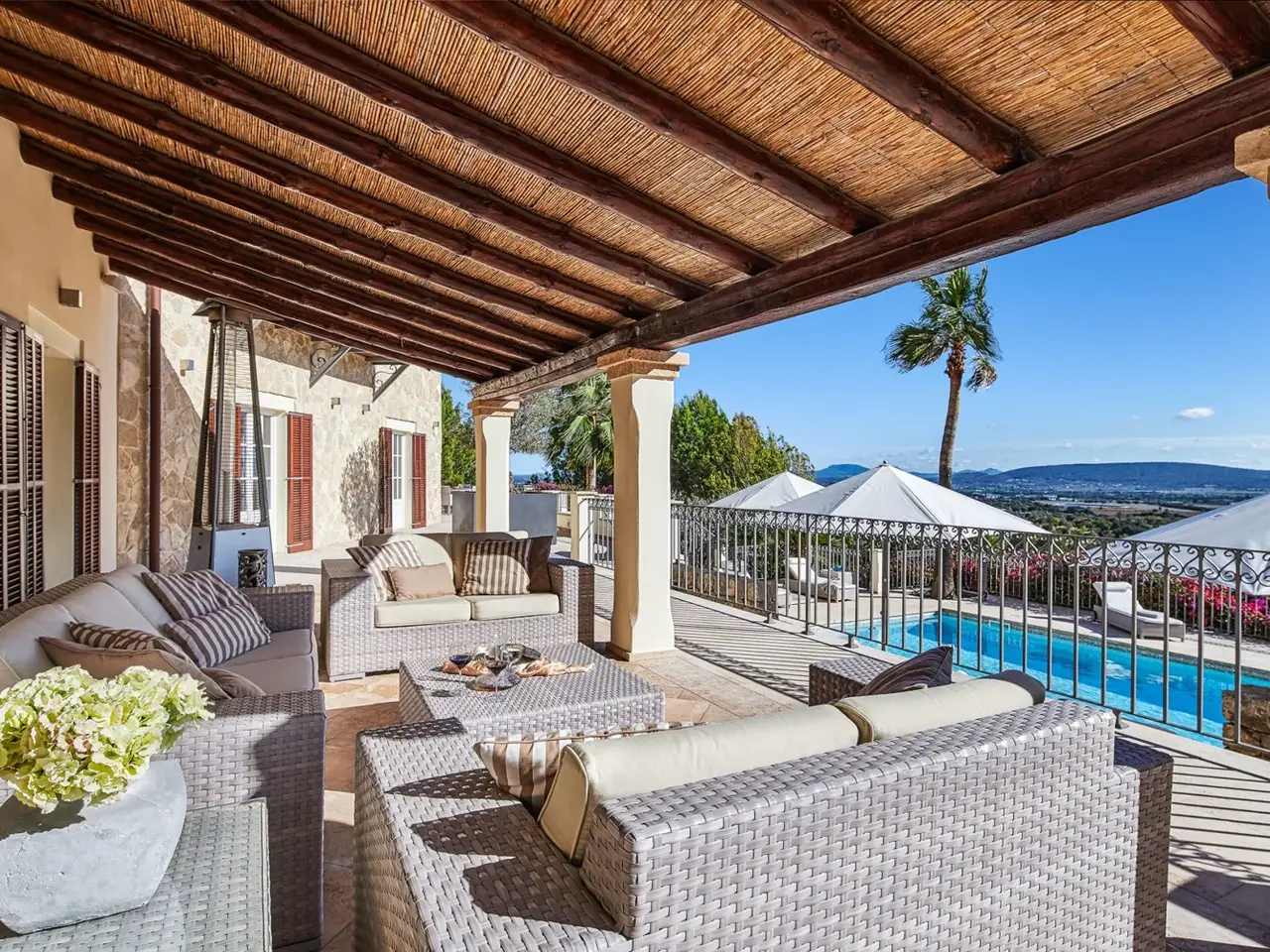 This fantastic, south-facing luxury villa with an area of 660m2 offers wonderful panoramic views and is located between Santa Maria and Alarò. Built in 2015 with tasteful design and high quality materials, in one of the most sought after areas of Mallorca just minutes from all amenities, this property offers complete privacy and fabulous views. The main house consists of five double bedrooms, five good-sized bathrooms, a spacious fully equipped kitchen with high quality appliances, a bright living-dining room with large windows, access to a beautiful covered terrace and a huge swimming pool of approximately 50 m2. The property also features a separate guest studio with a spacious en-suite bedroom, a fully equipped kitchen and a living-dining room, forming a sunny and cozy open plan space. The entire house is furnished in a beautiful and unique design with great attention to detail. In addition, this property offers a seven meter high gallery in the living area with high ceilings, a fully equipped outdoor kitchen, relaxation areas next to a fabulous swimming pool and unbeatable panoramic views. Also worth highlighting is the landscaped garden with old olive trees and a barbecue area above the house, which gives you an even better view. The amenities include underfloor heating, air conditioning, marble floors, a double garage, a par 3 golf course and many other highlights. It's a real gem with a fantastic location just 15 minutes from Palma.