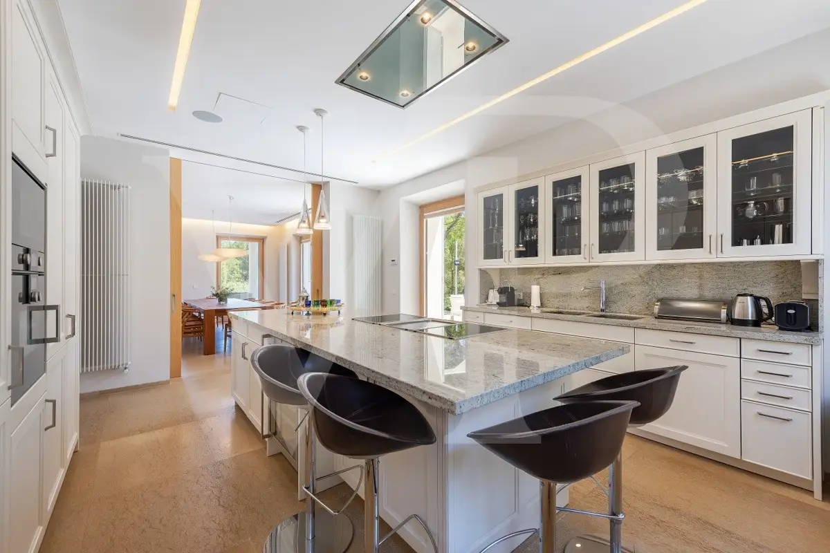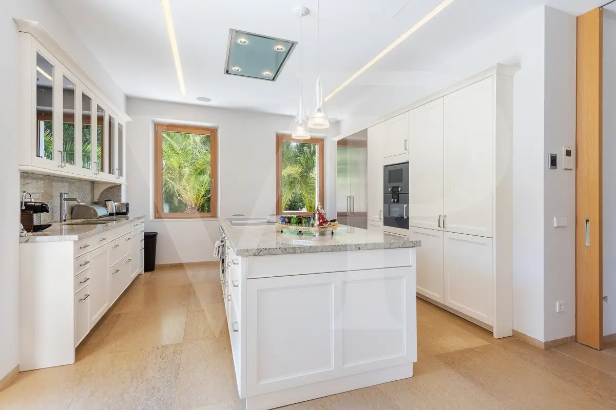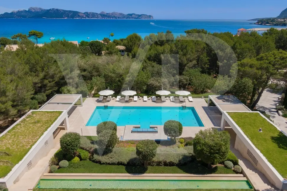 Exceptional historic luxury property from 1920 in the north of the island of Mallorca on the Bay of Pollensa. The villa is located in a quiet residential area between the bays of Alcudia and Pollensa, just a few meters from two beautiful beaches with white sand and crystal clear waters and offers beautiful views over the Bay of Pollensa. The property consists of the elegantly furnished main house with a luxurious modern American kitchen, dining room and large living room. The villa is equipped with all amenities as are the various outbuildings which include the guest house, pool house and staff house. The staff house has a professional kitchen and three bedrooms and two bathrooms and a huge boat garage. The villa also has a holiday rental license with 18 places. The extensive private property with its well-kept gardens and large lawns offers an ideal environment for a wonderful holiday with friends and/or family. The house has several great terraces in different orientations, an outdoor dining area next to the main house and another dining and grilling area with full kitchen equipment next to the 20 x 8 saltwater pool and hot tub, although it is covered. The areas are equipped with comfortable furniture as well as parasols and awnings. The modern interior of the main house has been carefully chosen to create an ambience that exudes maximum comfort and tranquility. High quality materials have been used in the furnishing of the rooms, with stone floors in the day area and warm, large format oak parquet in the night area, combined with light colors and custom-made furniture for each room. The furnishings of the bedrooms harmonize with that of the rest of the house and all have a large, modern bathroom en suite. The upstairs attic is ideal as a playroom for the youngest family members. Of particular note is the master bedroom, which has a dressing room and a bathroom with a bathtub and shower, as well as a private terrace on the first floor that offers wonderful views of the sea and the Formentor peninsula with the spectacular Tramuntana mountains in the background. This property is undoubtedly one of the most spectacular and luxurious properties to be found on the island. The fact that it is a listed building gives it the unique and special charm that makes owning it and becoming part of its history a priceless experience. A unique opportunity for those looking for a priceless gem to make their home.