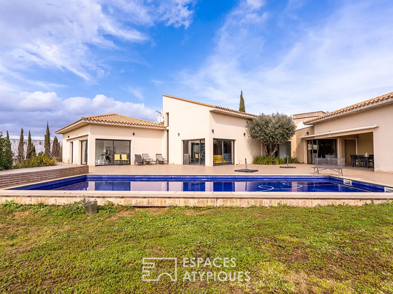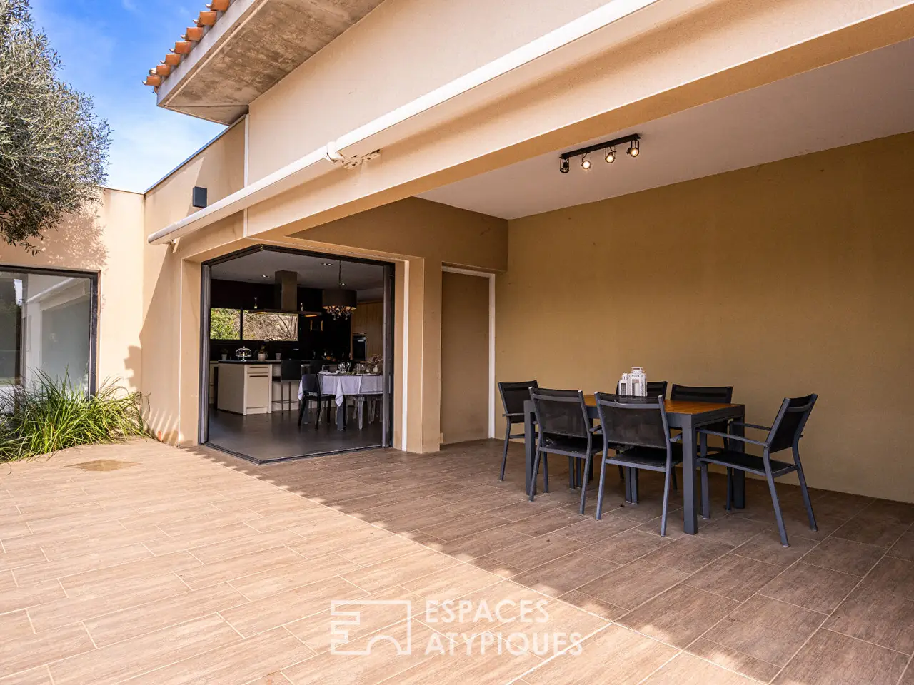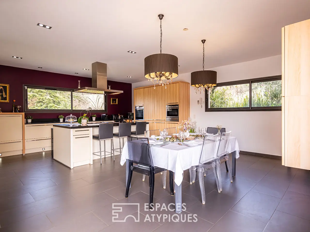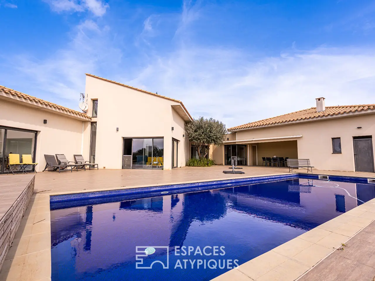 Nestled in a green setting in Alenya, this contemporary single-storey villa, built in 2010, seduces with its generous volumes, its high-end services and its perfect dialogue with the outside. Located on a plot of more than 4,500 sqm, it offers a unique living environment, where comfort and serenity combine harmoniously. A superb 250 sqm terrace facing due south with its superb tiled swimming pool and a landscaped garden complete this exceptional place. From the entrance, a large bay window catches the eye and opens a striking perspective on the garden, like a living painting, a strong architectural signature of this achievement. The cathedral living room, bathed in light, is enhanced by an elegant mezzanine which adds relief to the living space. The kitchen-diner, a real centerpiece, offers high-end equipment with, among other things, an integrated wine cellar, warming drawer, double refrigerator and teppanyaki. Thanks to a large sliding corner bay window, it naturally merges with the summer kitchen set up on the terrace, allowing you to enjoy the Mediterranean climate all year round. An adjoining utility room completes this space, providing practicality and comfort on a daily basis. On the night side, three suites, each with their own bathroom, adjoin a majestic master suite, with its own bathroom with shower and bathtub as well as a beautiful dressing room. A fifth additional bedroom offers the flexibility of an office or a space dedicated to sports. Comfort is optimized by underfloor heating and reversible air conditioning, regulated independently in each room. Outside, the vast terrace naturally extends the living spaces and invites you to relax. The swimming pool blends harmoniously into this green setting with no vis-a-vis. The green spaces, equipped with automatic watering, are decorated with orange trees, grapefruit trees, almond trees and other Mediterranean species, adding a touch of charm and serenity to the whole. The double garage allows several vehicles to be parked safely or to create a workshop space. Located close to amenities while benefiting from a location outside the village, this villa offers an exclusive living environment, just a few minutes from the beaches. A rare property that will appeal to lovers of architecture and space, looking for an elegant and functional place to live. ENERGY CLASS B (100) / CLIMATE CLASS B (8)Estimated average amount of annual energy expenditure for standard use, established from 2021 energy prices: EUR1,520 and EUR2,130.REF. 9863MLAdditional information* 7 rooms* 5 bedrooms* 3 bathrooms* 1 bathroom* Outdoor space : 4550 SQM* Property tax : 3 435 €Energy Performance CertificatePrimary energy consumptionb : 100 kWh/m2.yearHigh performance housing*A*100kWh/m2.year8*kg CO2/m2.yearB*C*D*E*F*GExtremely poor housing performance* Of which greenhouse gas emissionsb : 8 kg CO2/m2.yearLow CO2 emissions*A*8kg CO2/m2.yearB*C*D*E*F*GVery high CO2 emissionsEstimated average annual energy costs for standard use, indexed to specific years 2021, 2022, 2023 : between 1520 € and 2130 € Subscription IncludedAgency feesThe fees include VAT and are payable by the vendorMediatorMediation Franchise-Consommateurswww.mediation-franchise.com29 Boulevard de Courcelles 75008 ParisInformation on the risks to which this property is exposed is available on the Geohazards website : www.georisques.gouv.fr
