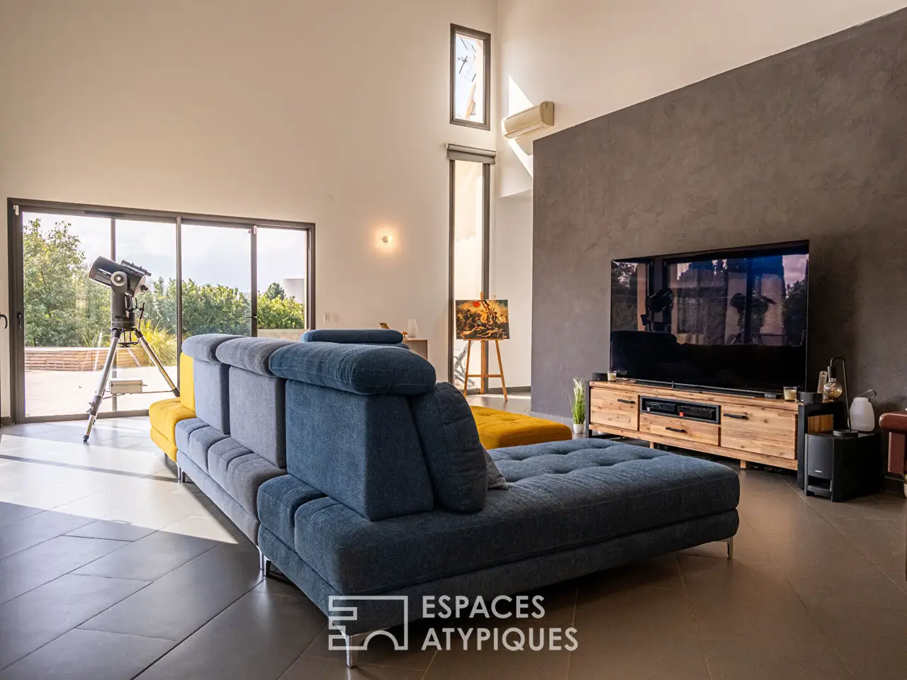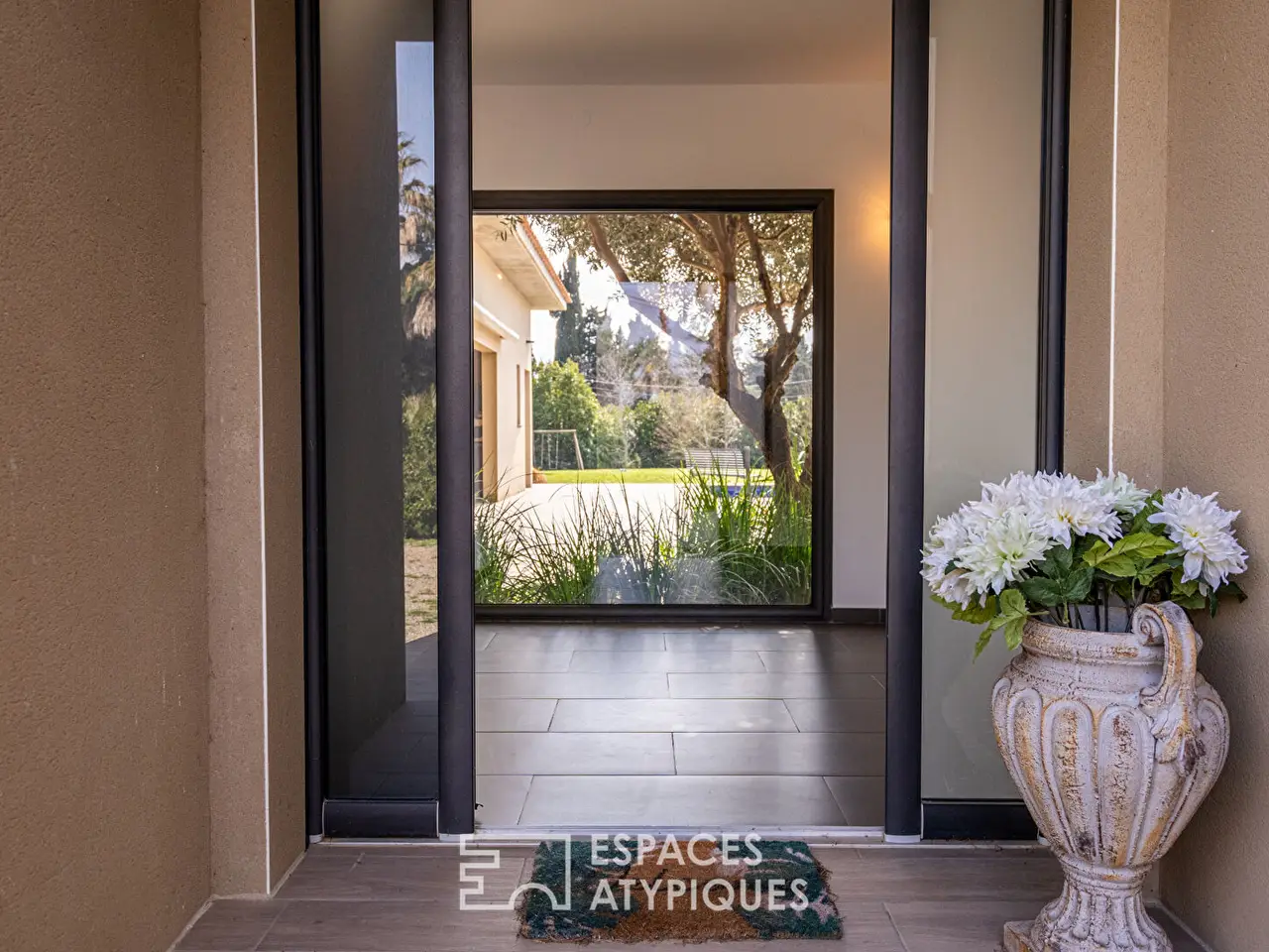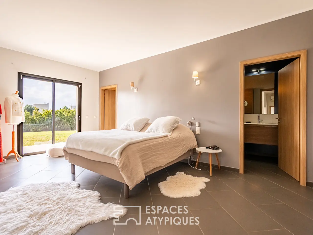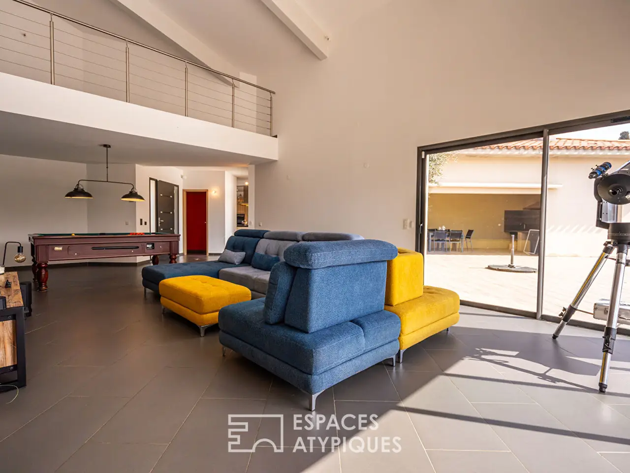 Nestled in a green setting in Alenya, this contemporary single-storey villa, built in 2010, seduces with its generous volumes, its high-end services and its perfect dialogue with the outside. Located on a plot of more than 4,500 sqm, it offers a unique living environment, where comfort and serenity combine harmoniously. A superb 250 sqm terrace facing due south with its superb tiled swimming pool and a landscaped garden complete this exceptional place. From the entrance, a large bay window catches the eye and opens a striking perspective on the garden, like a living painting, a strong architectural signature of this achievement. The cathedral living room, bathed in light, is enhanced by an elegant mezzanine which adds relief to the living space. The kitchen-diner, a real centerpiece, offers high-end equipment with, among other things, an integrated wine cellar, warming drawer, double refrigerator and teppanyaki. Thanks to a large sliding corner bay window, it naturally merges with the summer kitchen set up on the terrace, allowing you to enjoy the Mediterranean climate all year round. An adjoining utility room completes this space, providing practicality and comfort on a daily basis. On the night side, three suites, each with their own bathroom, adjoin a majestic master suite, with its own bathroom with shower and bathtub as well as a beautiful dressing room. A fifth additional bedroom offers the flexibility of an office or a space dedicated to sports. Comfort is optimized by underfloor heating and reversible air conditioning, regulated independently in each room. Outside, the vast terrace naturally extends the living spaces and invites you to relax. The swimming pool blends harmoniously into this green setting with no vis-a-vis. The green spaces, equipped with automatic watering, are decorated with orange trees, grapefruit trees, almond trees and other Mediterranean species, adding a touch of charm and serenity to the whole. The double garage allows several vehicles to be parked safely or to create a workshop space. Located close to amenities while benefiting from a location outside the village, this villa offers an exclusive living environment, just a few minutes from the beaches. A rare property that will appeal to lovers of architecture and space, looking for an elegant and functional place to live. ENERGY CLASS B (100) / CLIMATE CLASS B (8)Estimated average amount of annual energy expenditure for standard use, established from 2021 energy prices: EUR1,520 and EUR2,130.REF. 9863MLAdditional information* 7 rooms* 5 bedrooms* 3 bathrooms* 1 bathroom* Outdoor space : 4550 SQM* Property tax : 3 435 €Energy Performance CertificatePrimary energy consumptionb : 100 kWh/m2.yearHigh performance housing*A*100kWh/m2.year8*kg CO2/m2.yearB*C*D*E*F*GExtremely poor housing performance* Of which greenhouse gas emissionsb : 8 kg CO2/m2.yearLow CO2 emissions*A*8kg CO2/m2.yearB*C*D*E*F*GVery high CO2 emissionsEstimated average annual energy costs for standard use, indexed to specific years 2021, 2022, 2023 : between 1520 € and 2130 € Subscription IncludedAgency feesThe fees include VAT and are payable by the vendorMediatorMediation Franchise-Consommateurswww.mediation-franchise.com29 Boulevard de Courcelles 75008 ParisInformation on the risks to which this property is exposed is available on the Geohazards website : www.georisques.gouv.fr