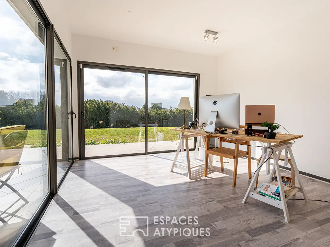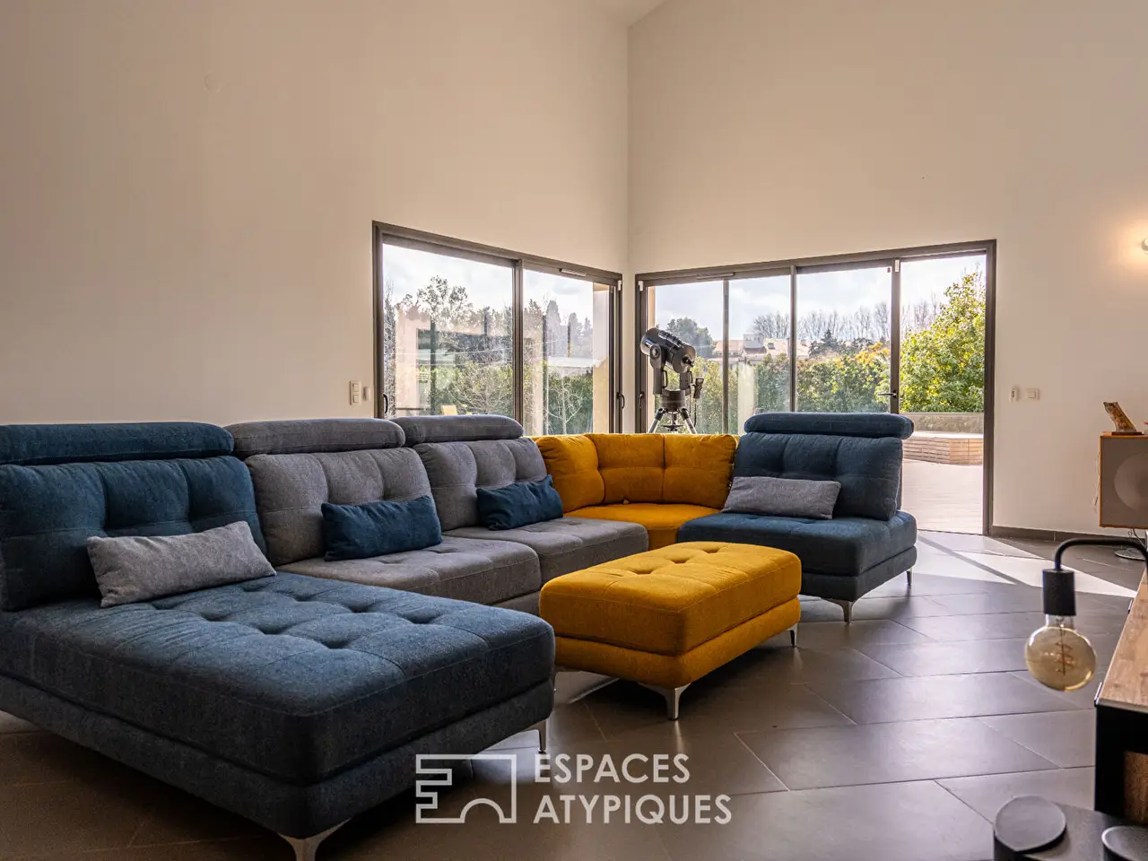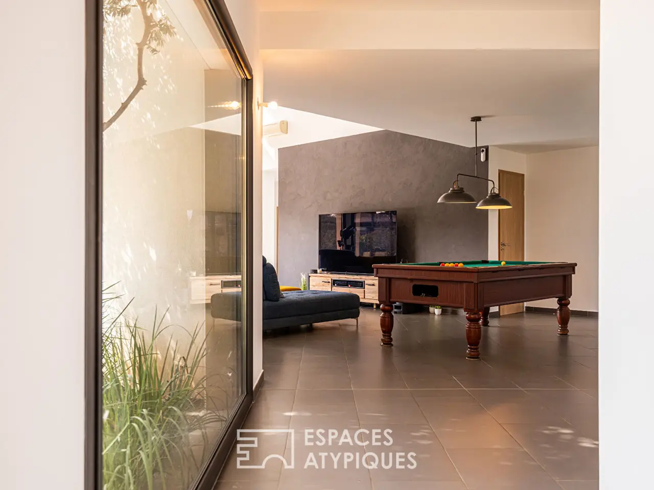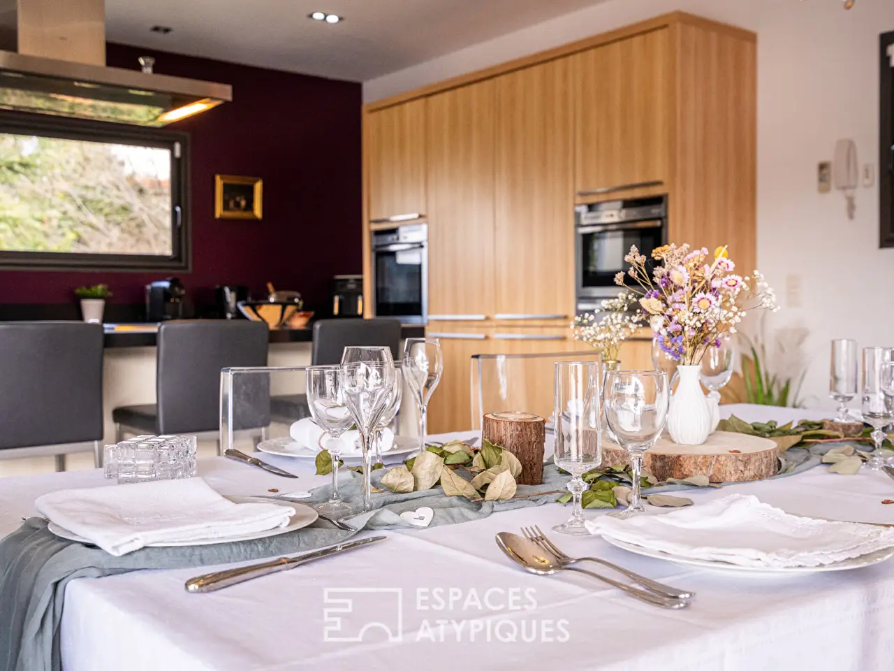 Nestled in a green setting in Alenya, this contemporary single-storey villa, built in 2010, seduces with its generous volumes, its high-end services and its perfect dialogue with the outside. Located on a plot of more than 4,500 sqm, it offers a unique living environment, where comfort and serenity combine harmoniously. A superb 250 sqm terrace facing due south with its superb tiled swimming pool and a landscaped garden complete this exceptional place. From the entrance, a large bay window catches the eye and opens a striking perspective on the garden, like a living painting, a strong architectural signature of this achievement. The cathedral living room, bathed in light, is enhanced by an elegant mezzanine which adds relief to the living space. The kitchen-diner, a real centerpiece, offers high-end equipment with, among other things, an integrated wine cellar, warming drawer, double refrigerator and teppanyaki. Thanks to a large sliding corner bay window, it naturally merges with the summer kitchen set up on the terrace, allowing you to enjoy the Mediterranean climate all year round. An adjoining utility room completes this space, providing practicality and comfort on a daily basis. On the night side, three suites, each with their own bathroom, adjoin a majestic master suite, with its own bathroom with shower and bathtub as well as a beautiful dressing room. A fifth additional bedroom offers the flexibility of an office or a space dedicated to sports. Comfort is optimized by underfloor heating and reversible air conditioning, regulated independently in each room. Outside, the vast terrace naturally extends the living spaces and invites you to relax. The swimming pool blends harmoniously into this green setting with no vis-a-vis. The green spaces, equipped with automatic watering, are decorated with orange trees, grapefruit trees, almond trees and other Mediterranean species, adding a touch of charm and serenity to the whole. The double garage allows several vehicles to be parked safely or to create a workshop space. Located close to amenities while benefiting from a location outside the village, this villa offers an exclusive living environment, just a few minutes from the beaches. A rare property that will appeal to lovers of architecture and space, looking for an elegant and functional place to live. ENERGY CLASS B (100) / CLIMATE CLASS B (8)Estimated average amount of annual energy expenditure for standard use, established from 2021 energy prices: EUR1,520 and EUR2,130.REF. 9863MLAdditional information* 7 rooms* 5 bedrooms* 3 bathrooms* 1 bathroom* Outdoor space : 4550 SQM* Property tax : 3 435 €Energy Performance CertificatePrimary energy consumptionb : 100 kWh/m2.yearHigh performance housing*A*100kWh/m2.year8*kg CO2/m2.yearB*C*D*E*F*GExtremely poor housing performance* Of which greenhouse gas emissionsb : 8 kg CO2/m2.yearLow CO2 emissions*A*8kg CO2/m2.yearB*C*D*E*F*GVery high CO2 emissionsEstimated average annual energy costs for standard use, indexed to specific years 2021, 2022, 2023 : between 1520 € and 2130 € Subscription IncludedAgency feesThe fees include VAT and are payable by the vendorMediatorMediation Franchise-Consommateurswww.mediation-franchise.com29 Boulevard de Courcelles 75008 ParisInformation on the risks to which this property is exposed is available on the Geohazards website : www.georisques.gouv.fr