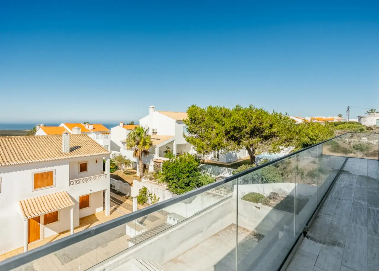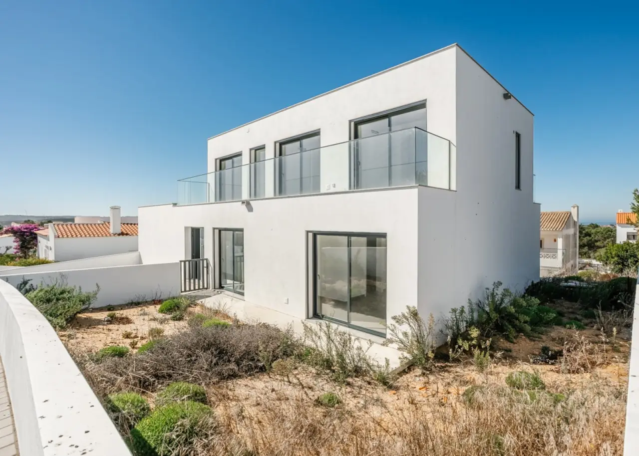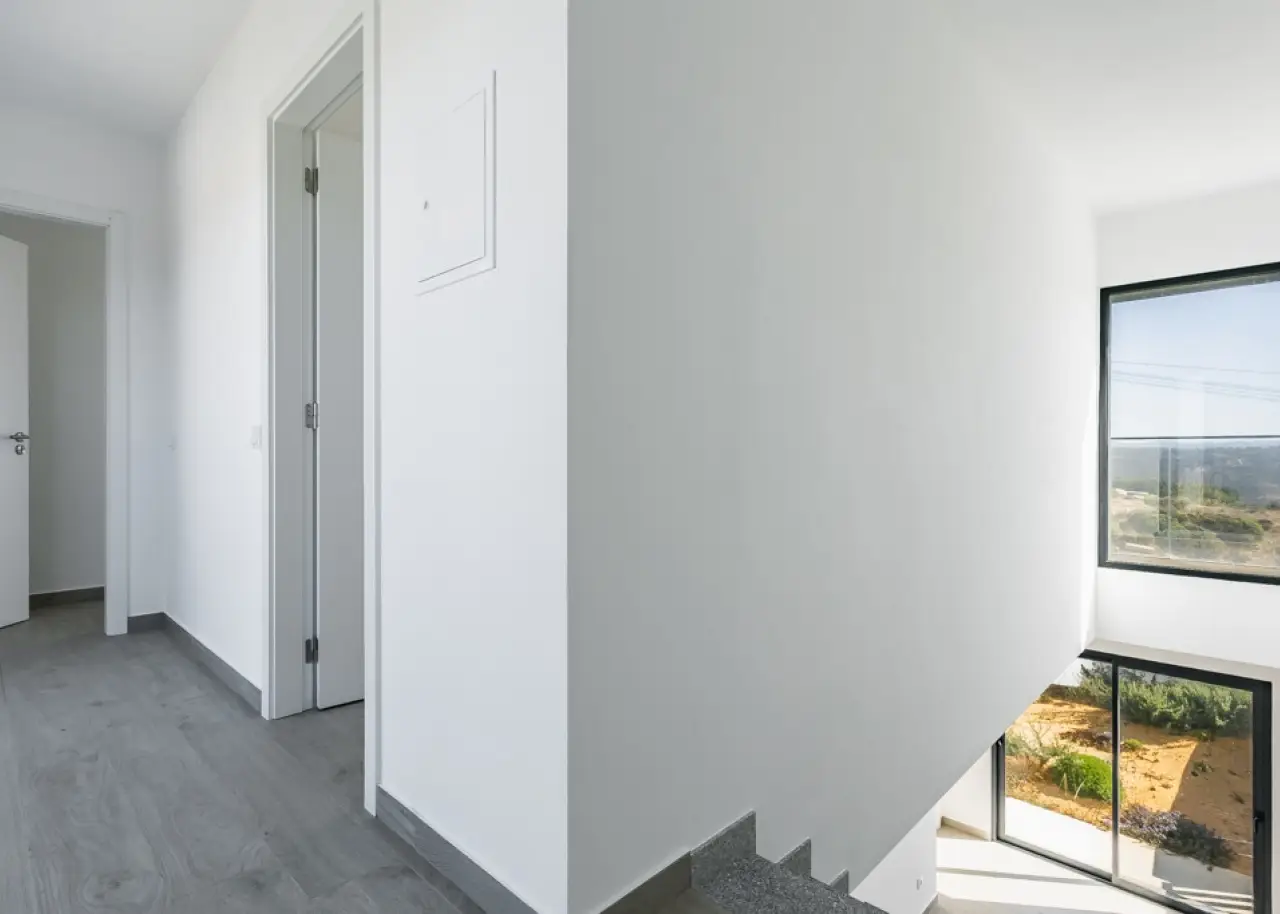 Modern 4-bedroom villa for sale in Aljezur, about 5 minutes from Monte Clérigo beach in the Algarve. Recently built with attention to detail, the villa has three floors, including a garage in the basement. On the main floor is the living area, with the kitchen equipped with modern, efficient appliances and an island, with plenty of space for storage and preparing meals. It's an open and spacious space, in harmony with the living room, with large windows, making the space full of natural light and welcoming. From the large living room there is access through the large windows to the outside, namely to the terrace and swimming pool. Also on this floor is a bathroom and a spacious bedroom with an en-suite bathroom, with direct access to the garden. On the upper floor are the remaining three good-sized bedrooms, all with en-suite bathrooms and a fantastic balcony. The villa is equipped with air conditioning in every room, and the windows have electric shutters. The large basement can be used as a garage for up to 6 cars, or part of the space can be used as a games room, cinema or gym. With a privileged location, in a protected area of the Costa Vicentina Natural Park, next to Monte Clérigo beach and close to Arrifana beach, it is around 80 minutes from Faro International Airport. For lovers of nature and water sports, Aljezur is an excellent area for hiking, mountain biking and surfing. CHARACTERISTICS: Plot Area: 465 m2 | 5 005 sq ft Area: 233 m2 | 2 503 sq ft Deployment Area: 150 m2 | 1 615 sq ft Bedrooms: 4 Bathrooms: 5 Garage: 2 Energy efficiency: A+ FEATURES: 4 bedrooms Equipped kitchen Garden Swimming pool Garage Balconies / Terrace