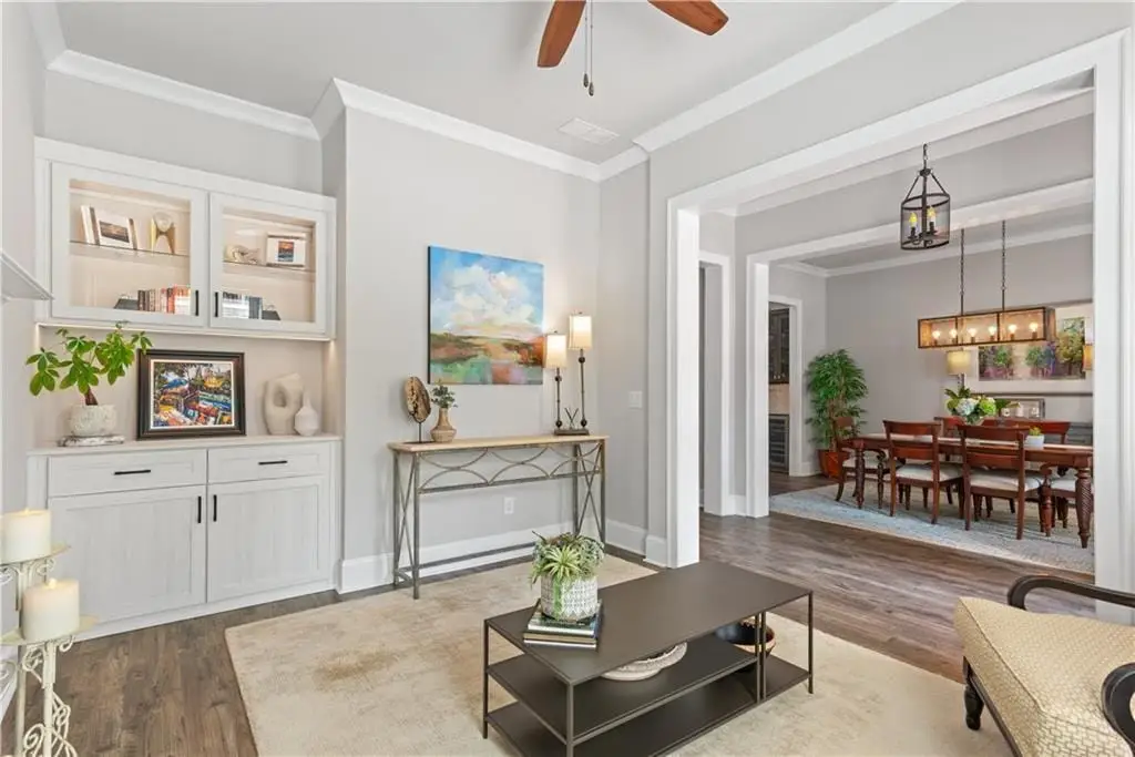 This is the ultimate downtown living opportunity you’ve been waiting for! You’ll fall in love with this exquisite and spacious home loaded with over $100K of special features and upgrades, all designed to enhance your everyday life. The most charming double porches welcome you. Upon entering this stunning home, you’ll appreciate the upgraded rich wide-planked LVP flooring and the soaring 10-foot ceilings throughout the main floor. The two spaces located at the front of the home are perfect for elegant dinners and cozy fireside evenings. The study also does double duty with its specially designed built-in cabinet that serves as a tucked away desk/office. Also, the gracious dining room seats at least eight guests with easy access to a built-in butler’s pantry/bar that’s ready for service. The back half of the main floor offers a casual, open space for relaxed living and entertaining. Enjoy a beautiful, well-equipped kitchen with KitchenAid and GE Profile appliances including a double oven. Theres a perfect sunny breakfast area, just the place for enjoying morning coffee - all open to a very spacious and stylish great room, boasting a modern stone fireplace, flanked by stained floating shelving. This main floor is conveniently located steps from the 2-car garage, making unloading groceries a breeze. Complimenting this amazing space you’ll note other custom upgrades like a designer ceiling fan, island pendants, gold-tones hardware, upgraded sink faucet and other lovely light fixtures. And, don’t miss the smartly designed custom pantry and closet. The second floor does not disappoint with four spacious bedrooms, including a sumptuous primary suite complete with a fabulous sitting area and private screened porch. The primary suite features a stunning spa-like bath with simply the best amenities: oversized walk-in shower, dual granite topped vanities, free-standing slipper tub ready to spoil you, and two enormous fully custom designed closets that will simply wow you. Theres no home in this price point that offers a primary suite like this! The lovely secondary bedrooms have access to well-appointed baths, more custom closets and the second story porch with a view of downtown Alpharetta. One more (a third) floor awaits currently used as an inviting den with a full bath that is perfect for movie nights or game day. Another unique feature of this home is the two walk-in storage spaces located on the third level, there’s definitely no lack of storage here! The garage provides even more storage with its motorized lifts, plus there’s an epoxy finished floor and wiring for an EV charger. The cu degras is the most enchanting porch and side patio with its lush professional landscaping, fun party lights strung all around, stepping stones and planters brimming with greenery. It’s one heavenly escape from the everyday hustle and bustle. This home offers the ultimate location, just a few minutes walk to all of the fun, action and excitement of downtown Alpharetta’s shopping, dining, and popular events like the Brew Moon Festival, Taste of Alpharetta and the Songwriters Festival, and so much more! And, the amazing Avalon is within walking distance too. If you’re looking for a home that is located in the middle of it all without compromising comfort and space, you’ve found your new home!