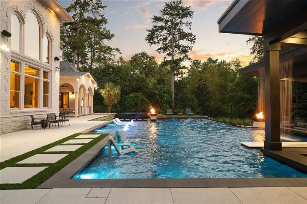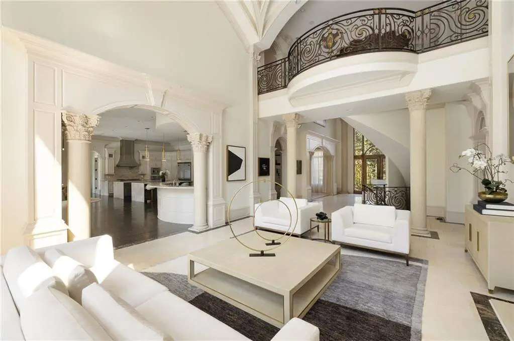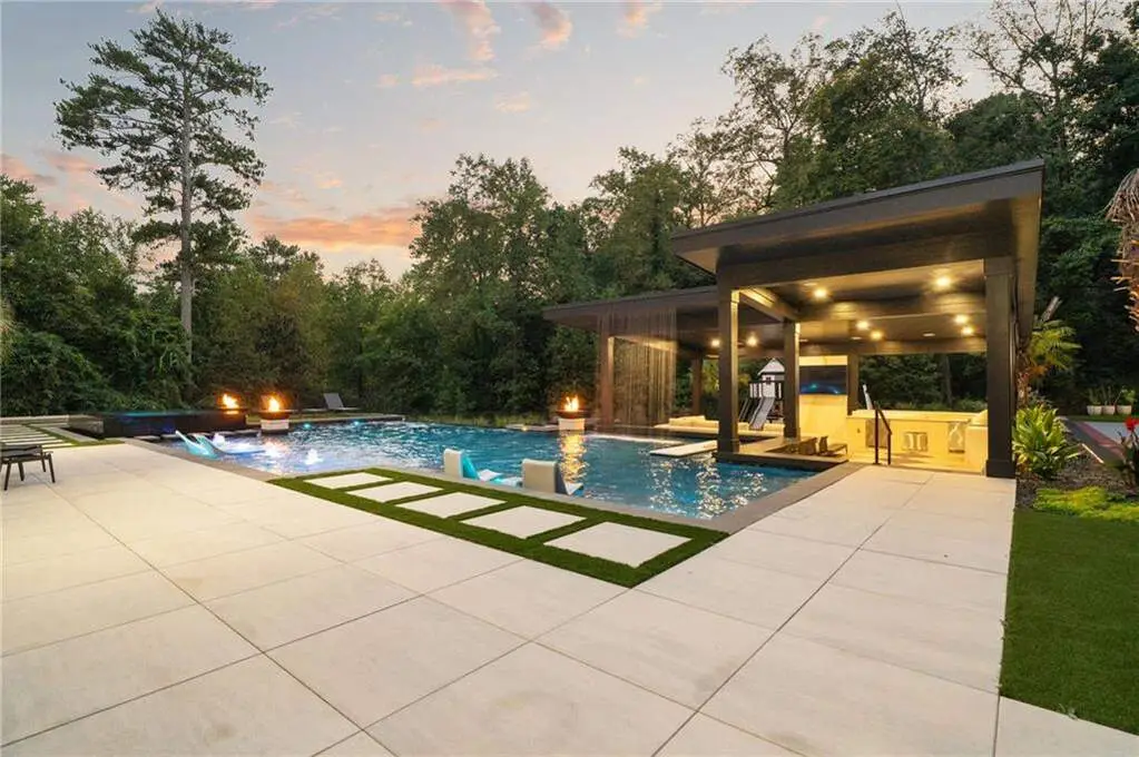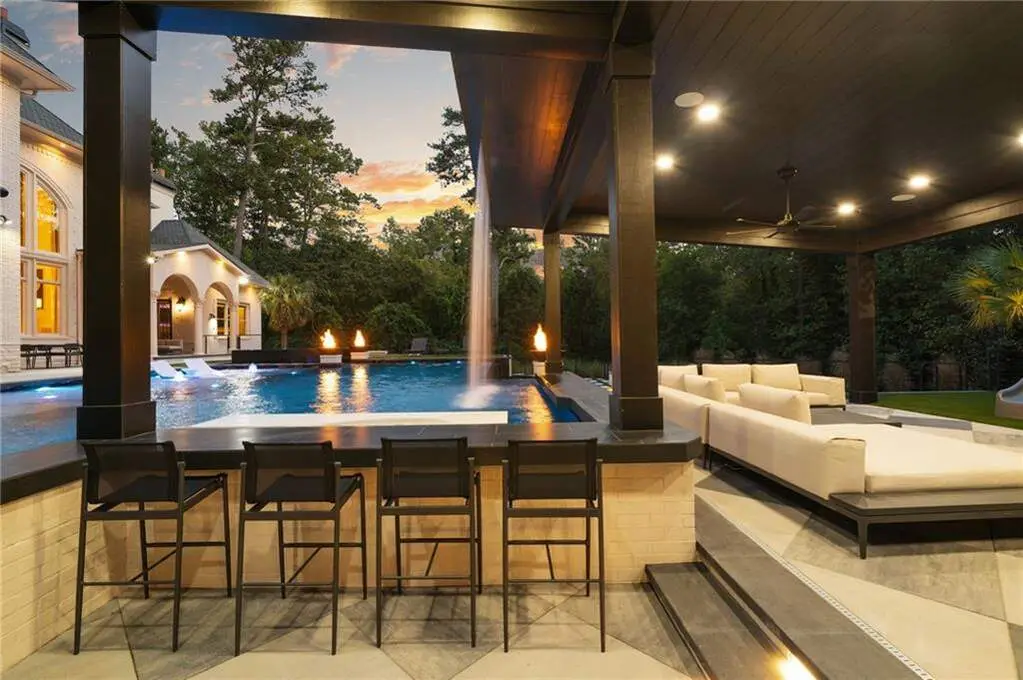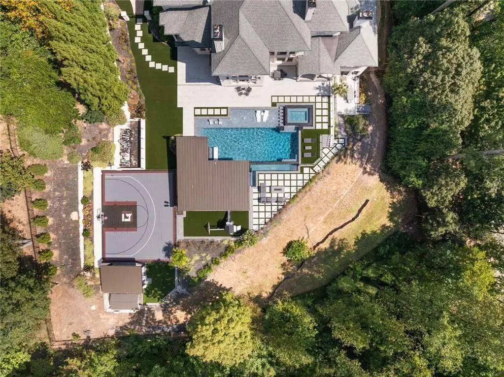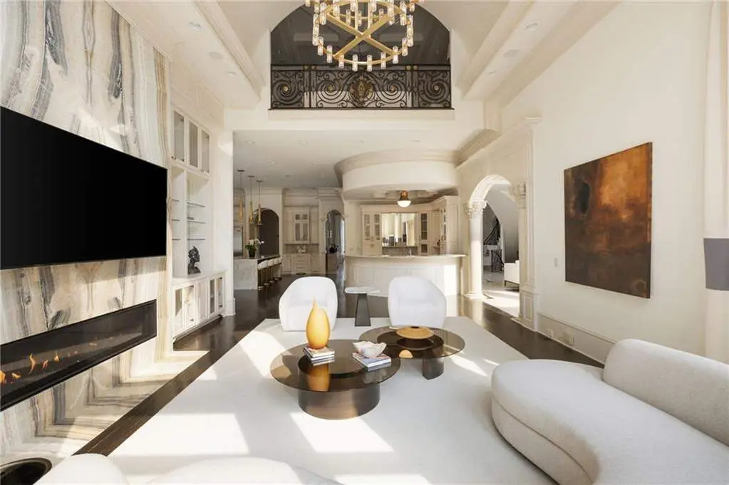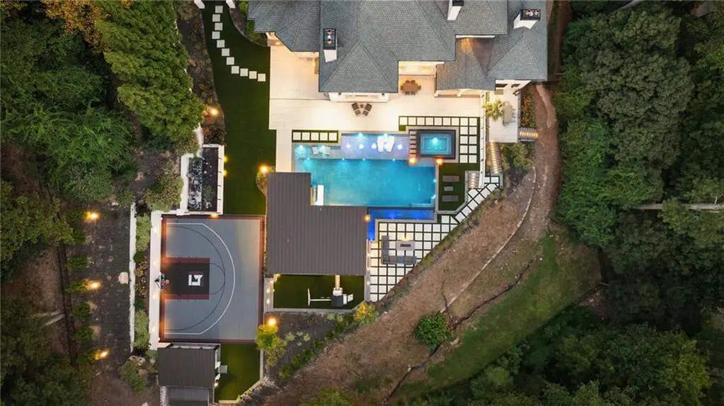 Set on 2.5+ wooded acres, this custom estate is designed for luxurious living and unforgettable entertaining, with soaring ceilings, intricate ironwork, natural stone accents, and dramatic statement features like a floor-to-ceiling backlit onyx fireplace. The open layout flows from the grand foyer and formal dining room into the living spaces and chef's kitchen, where dual islands topped with Taj Mahal quartz and premium stainless steel appliances set the stage for gatherings, complemented by an adjacent bar also finished in Taj Mahal quartz. The main-level primary suite offers a private retreat with a sitting room, double-sided fireplace, spa-style bath, and access to the covered patio overlooking the resort-inspired backyard with pool, spa, waterfalls, fire pits, and a fully equipped outdoor kitchen. Upstairs, a second primary suite, au pair suite with kitchenette and private entry, and additional en suites provide comfort for family and guests, while the terrace level brings entertainment to another level with its own backlit onyx bar, full second kitchen, climate-controlled wine room, home theater, private guest suite, and a recovery room complete with sauna, cold plunge, and hot tub. With turfed grounds, a basketball court, and a four-car garage, every detail of this estate combines elegance, comfort, and extraordinary amenities for both everyday living and large-scale entertaining.