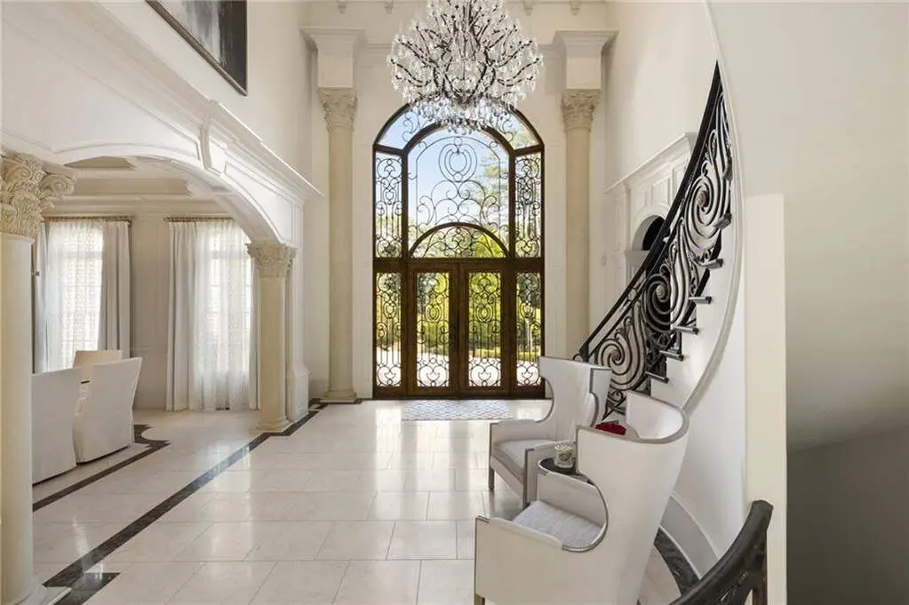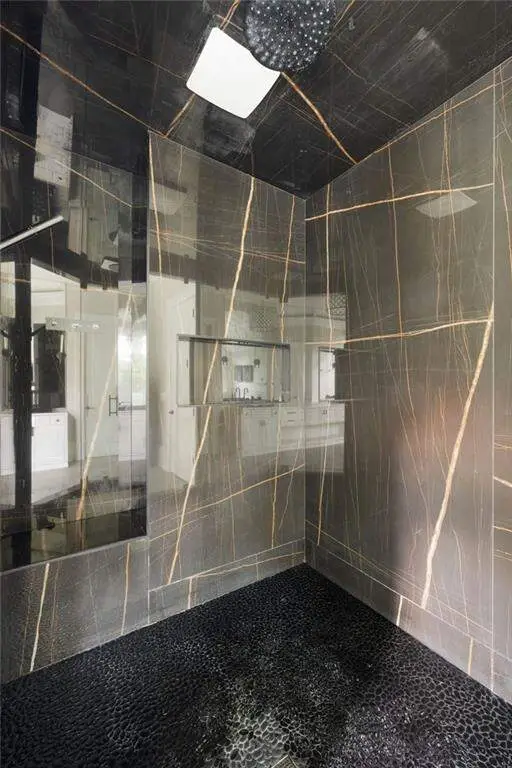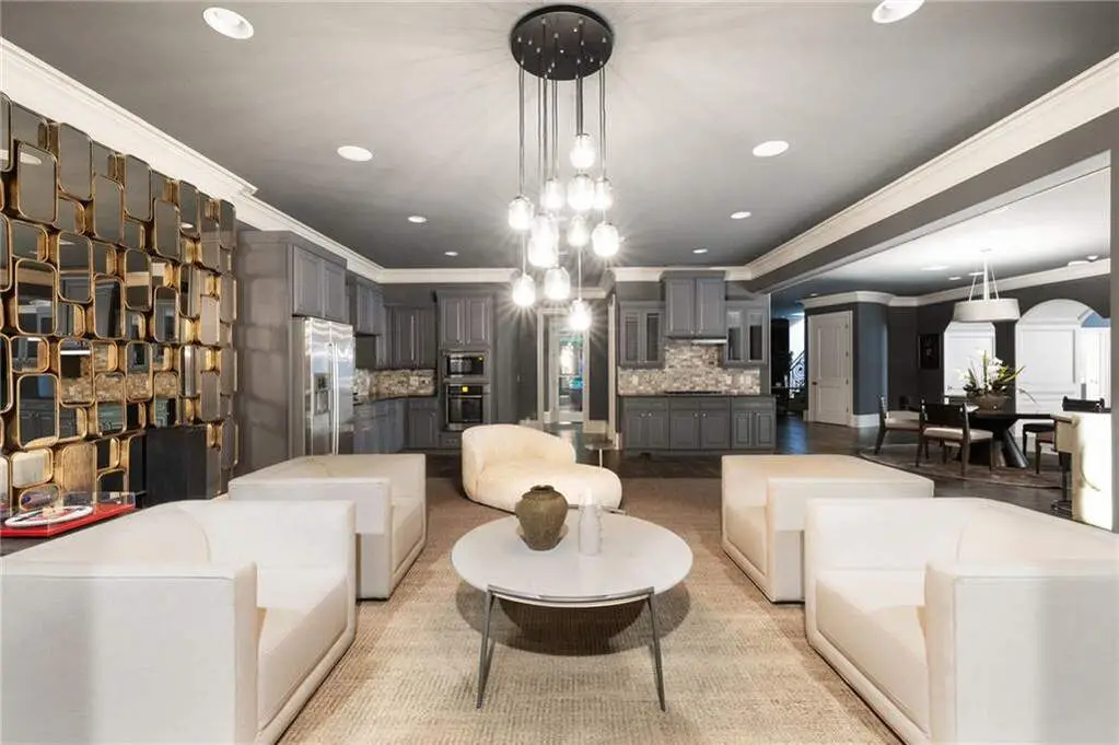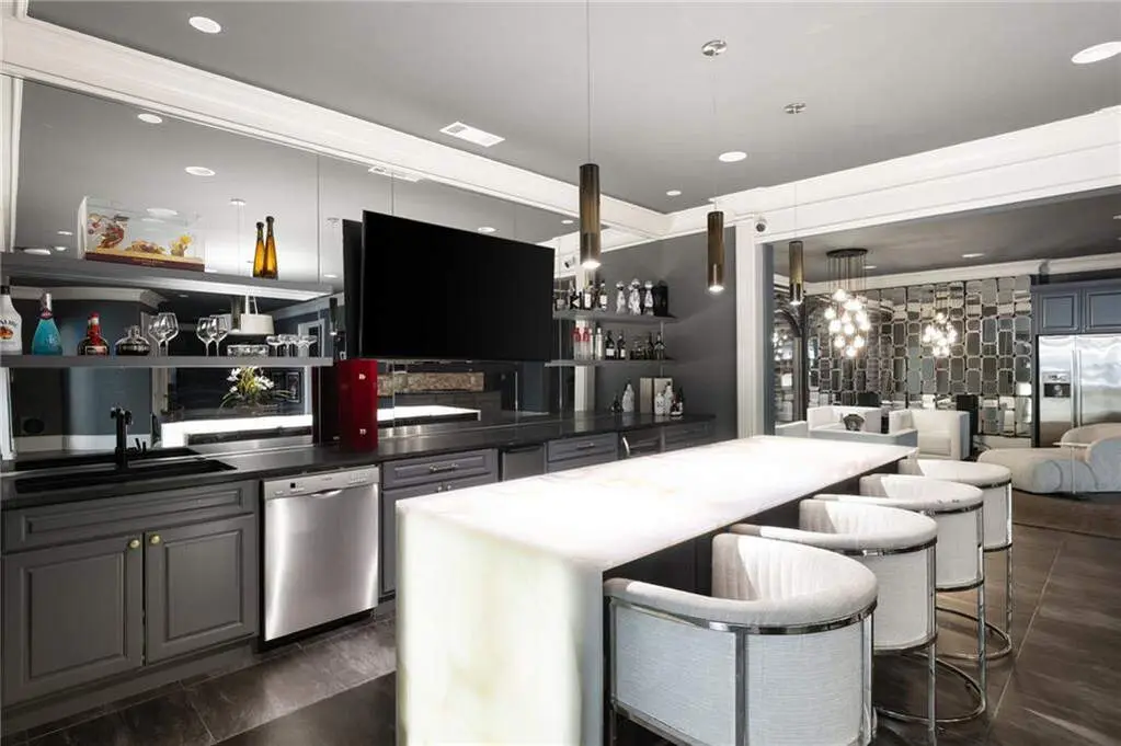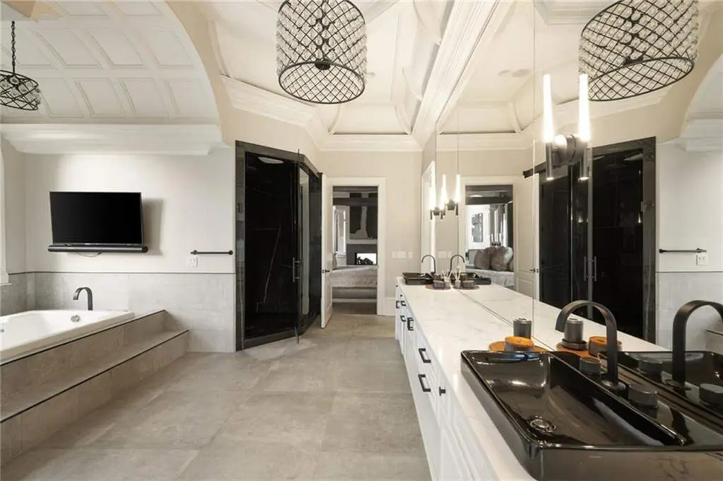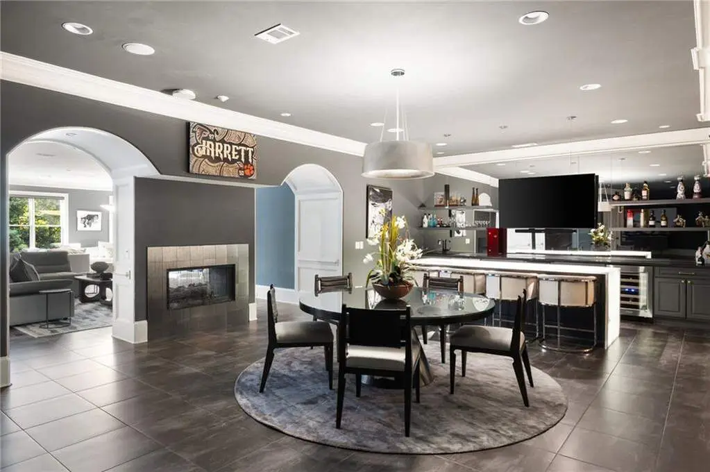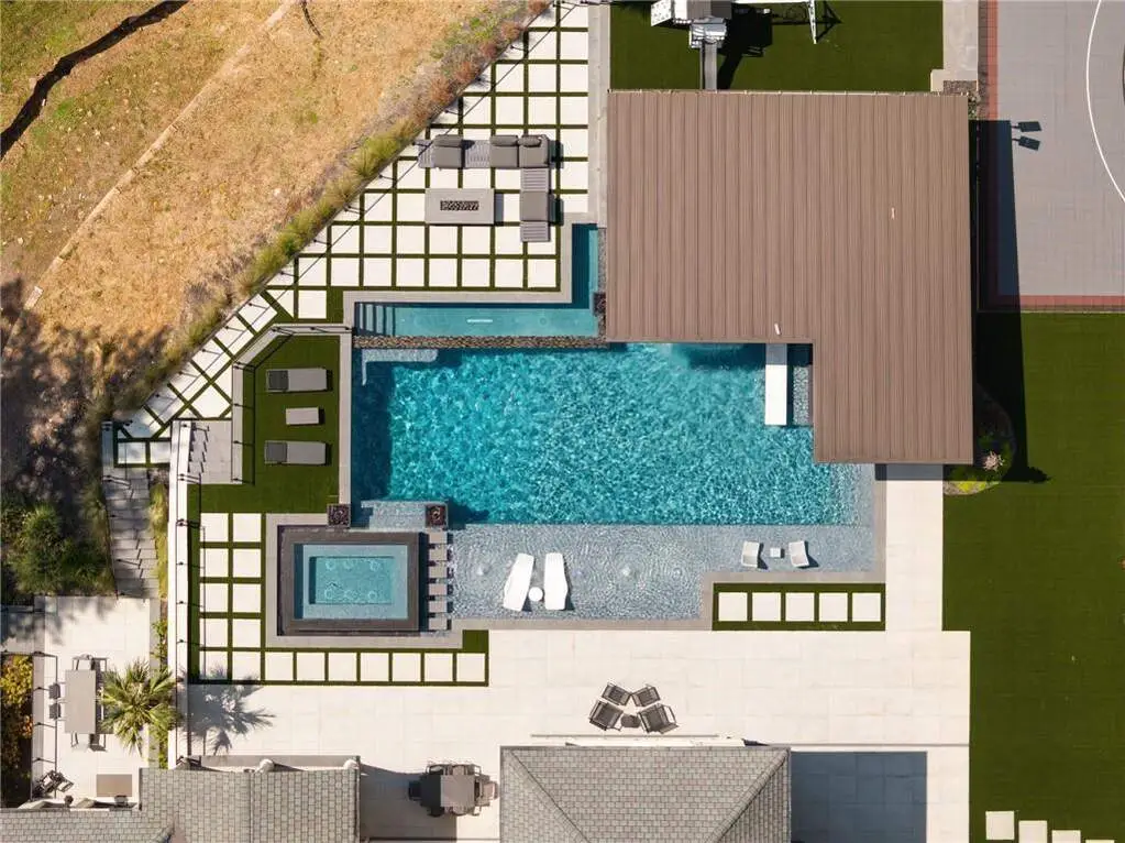 Set on 2.5+ wooded acres, this custom estate is designed for luxurious living and unforgettable entertaining, with soaring ceilings, intricate ironwork, natural stone accents, and dramatic statement features like a floor-to-ceiling backlit onyx fireplace. The open layout flows from the grand foyer and formal dining room into the living spaces and chef's kitchen, where dual islands topped with Taj Mahal quartz and premium stainless steel appliances set the stage for gatherings, complemented by an adjacent bar also finished in Taj Mahal quartz. The main-level primary suite offers a private retreat with a sitting room, double-sided fireplace, spa-style bath, and access to the covered patio overlooking the resort-inspired backyard with pool, spa, waterfalls, fire pits, and a fully equipped outdoor kitchen. Upstairs, a second primary suite, au pair suite with kitchenette and private entry, and additional en suites provide comfort for family and guests, while the terrace level brings entertainment to another level with its own backlit onyx bar, full second kitchen, climate-controlled wine room, home theater, private guest suite, and a recovery room complete with sauna, cold plunge, and hot tub. With turfed grounds, a basketball court, and a four-car garage, every detail of this estate combines elegance, comfort, and extraordinary amenities for both everyday living and large-scale entertaining.