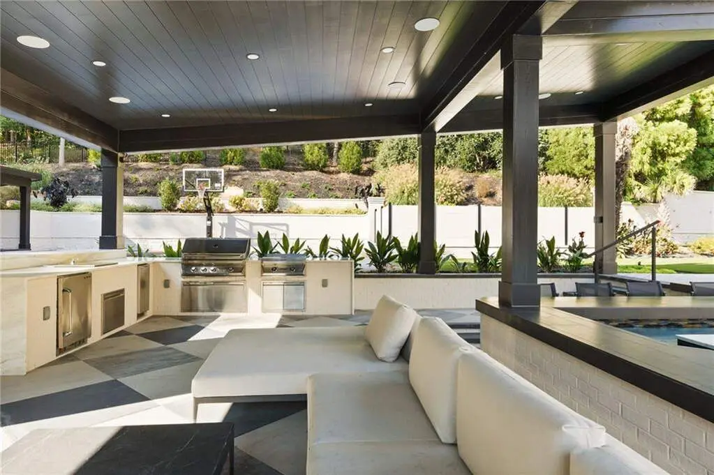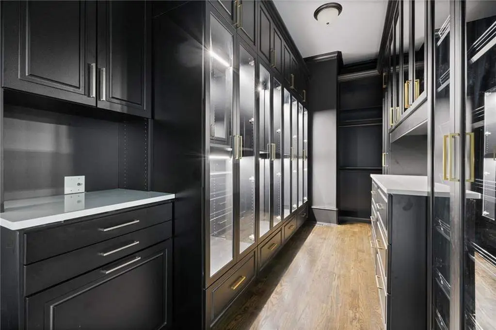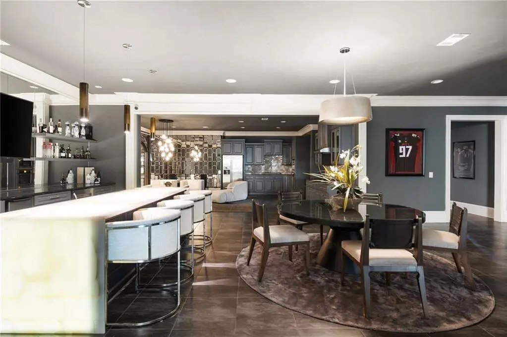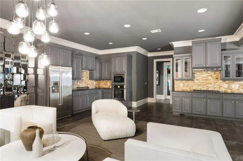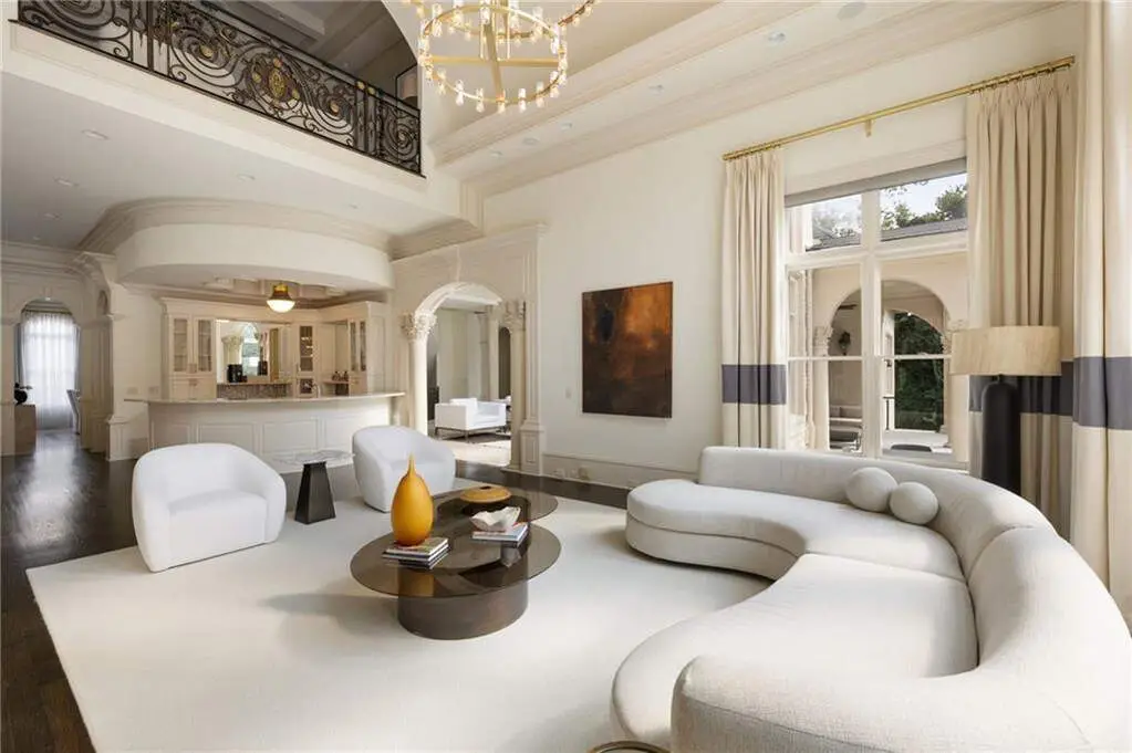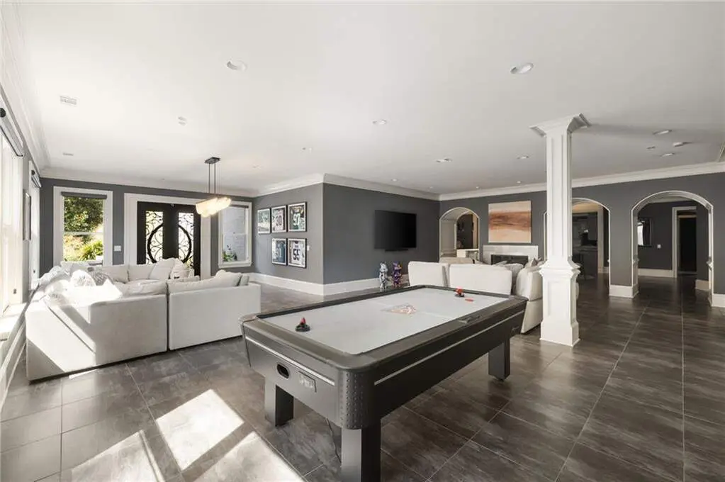 Set on 2.5+ wooded acres, this custom estate is designed for luxurious living and unforgettable entertaining, with soaring ceilings, intricate ironwork, natural stone accents, and dramatic statement features like a floor-to-ceiling backlit onyx fireplace. The open layout flows from the grand foyer and formal dining room into the living spaces and chef's kitchen, where dual islands topped with Taj Mahal quartz and premium stainless steel appliances set the stage for gatherings, complemented by an adjacent bar also finished in Taj Mahal quartz. The main-level primary suite offers a private retreat with a sitting room, double-sided fireplace, spa-style bath, and access to the covered patio overlooking the resort-inspired backyard with pool, spa, waterfalls, fire pits, and a fully equipped outdoor kitchen. Upstairs, a second primary suite, au pair suite with kitchenette and private entry, and additional en suites provide comfort for family and guests, while the terrace level brings entertainment to another level with its own backlit onyx bar, full second kitchen, climate-controlled wine room, home theater, private guest suite, and a recovery room complete with sauna, cold plunge, and hot tub. With turfed grounds, a basketball court, and a four-car garage, every detail of this estate combines elegance, comfort, and extraordinary amenities for both everyday living and large-scale entertaining.