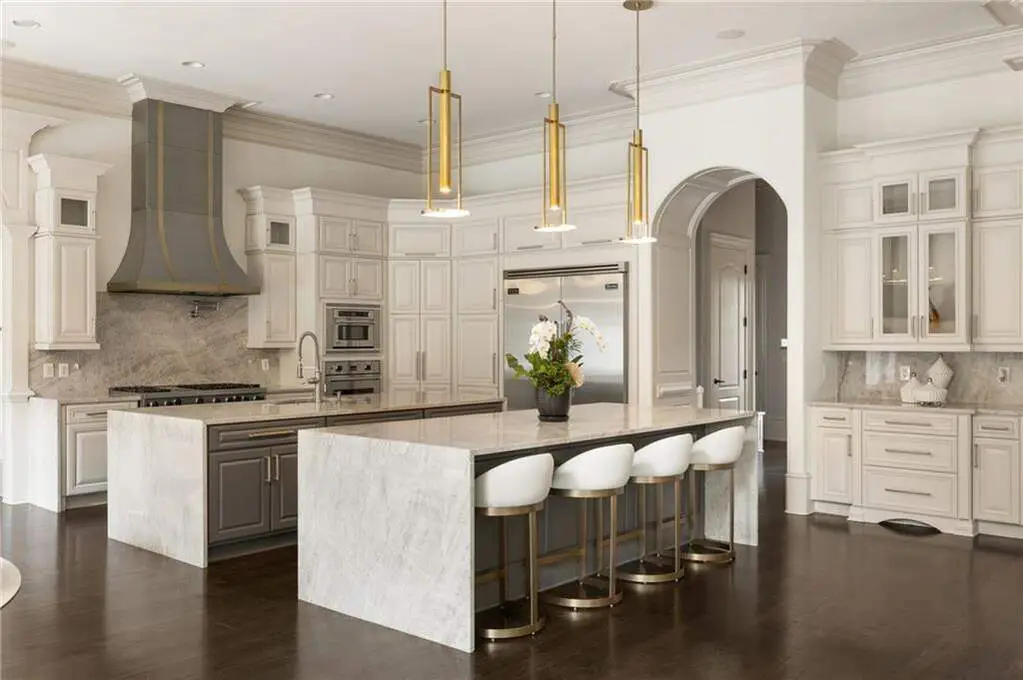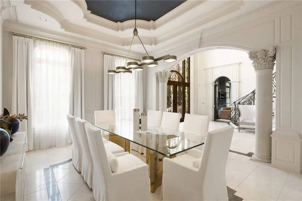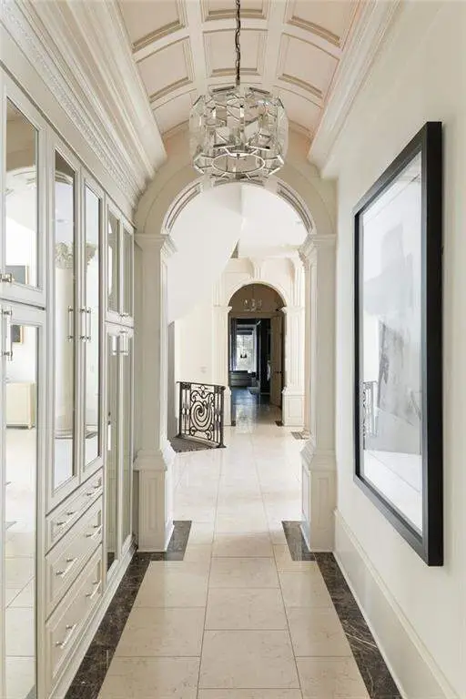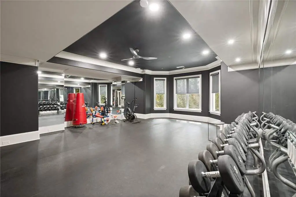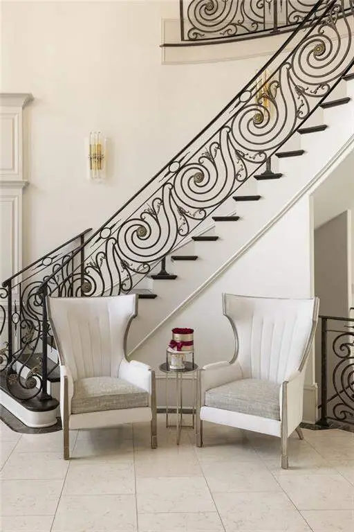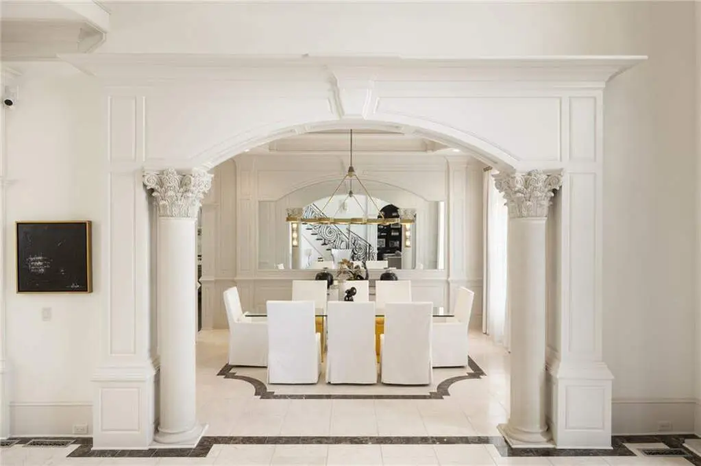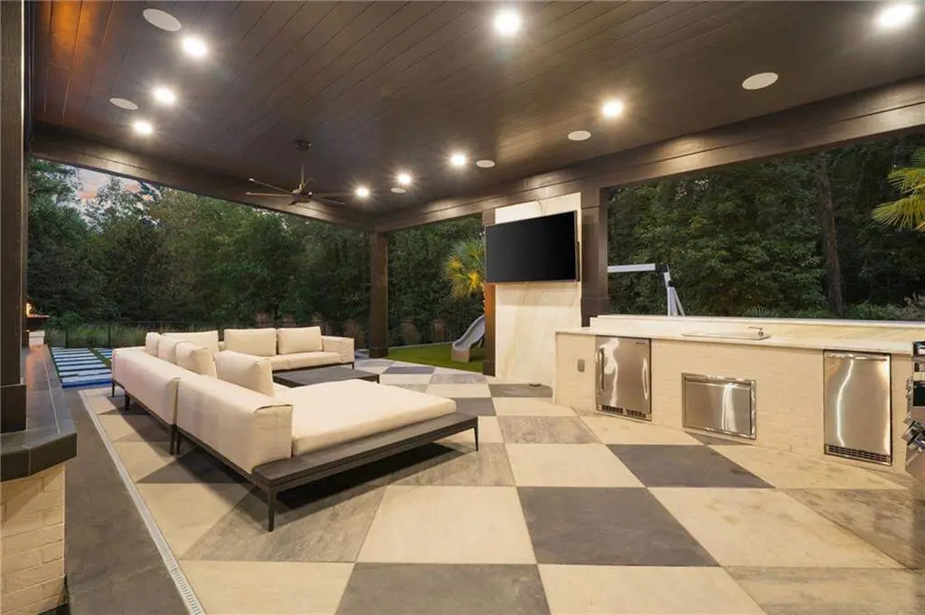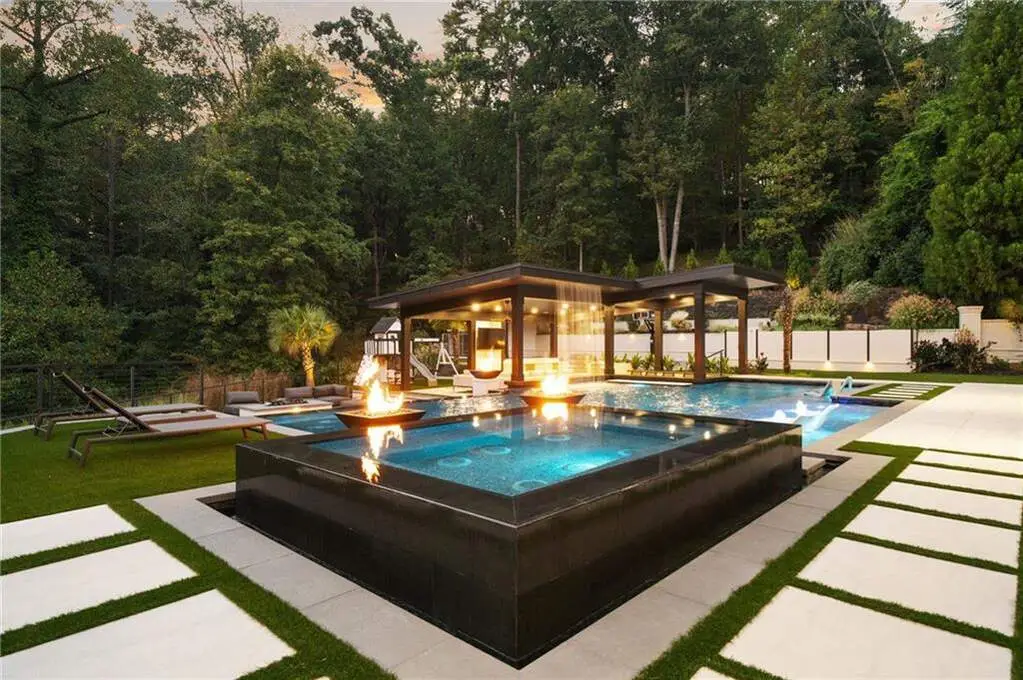 Set on 2.5+ wooded acres, this custom estate is designed for luxurious living and unforgettable entertaining, with soaring ceilings, intricate ironwork, natural stone accents, and dramatic statement features like a floor-to-ceiling backlit onyx fireplace. The open layout flows from the grand foyer and formal dining room into the living spaces and chef's kitchen, where dual islands topped with Taj Mahal quartz and premium stainless steel appliances set the stage for gatherings, complemented by an adjacent bar also finished in Taj Mahal quartz. The main-level primary suite offers a private retreat with a sitting room, double-sided fireplace, spa-style bath, and access to the covered patio overlooking the resort-inspired backyard with pool, spa, waterfalls, fire pits, and a fully equipped outdoor kitchen. Upstairs, a second primary suite, au pair suite with kitchenette and private entry, and additional en suites provide comfort for family and guests, while the terrace level brings entertainment to another level with its own backlit onyx bar, full second kitchen, climate-controlled wine room, home theater, private guest suite, and a recovery room complete with sauna, cold plunge, and hot tub. With turfed grounds, a basketball court, and a four-car garage, every detail of this estate combines elegance, comfort, and extraordinary amenities for both everyday living and large-scale entertaining.
