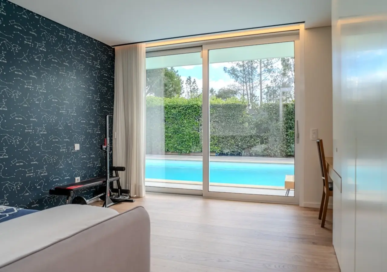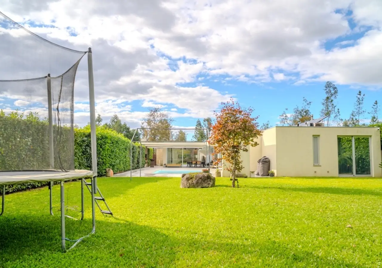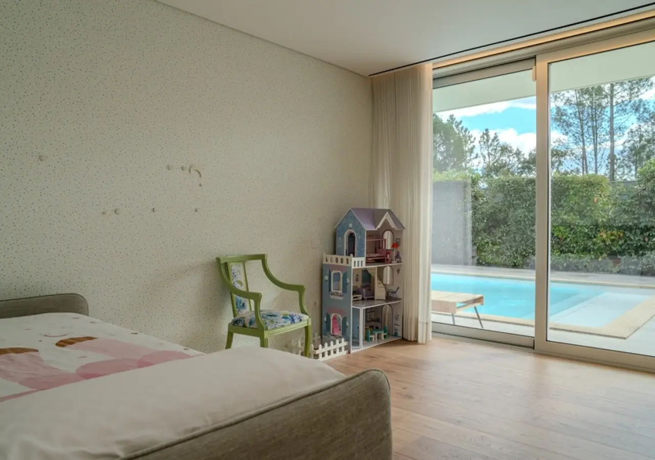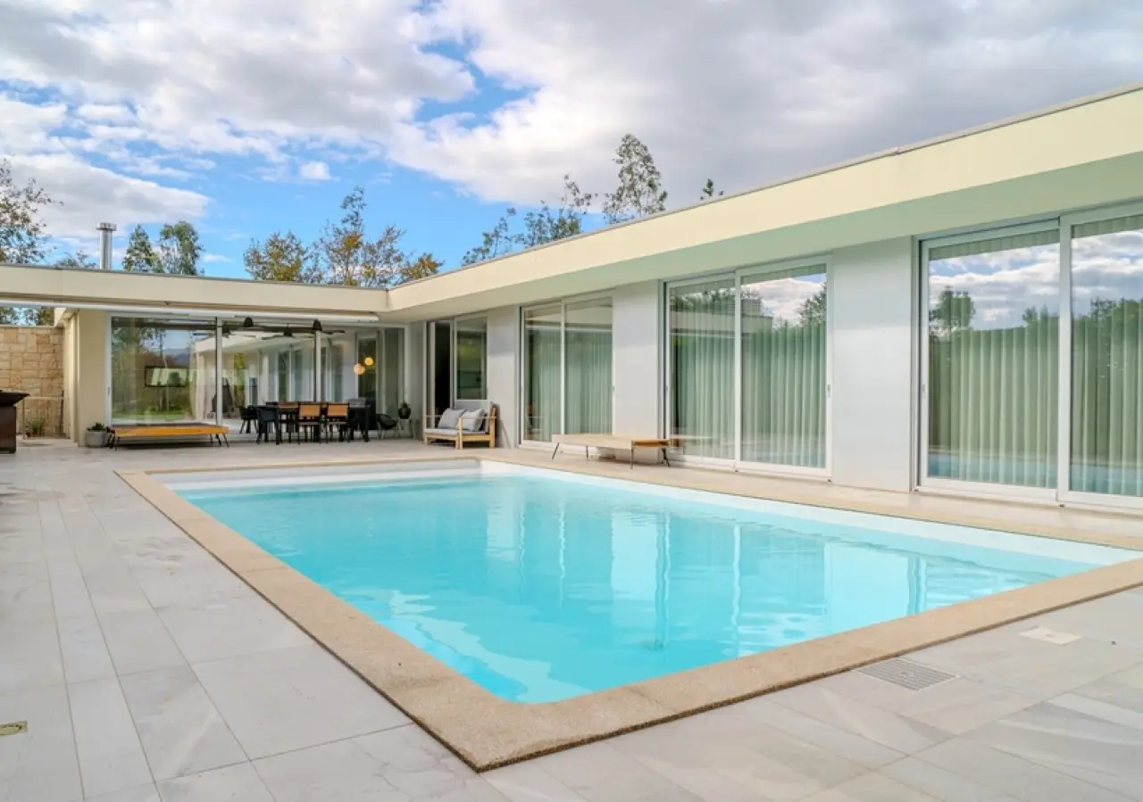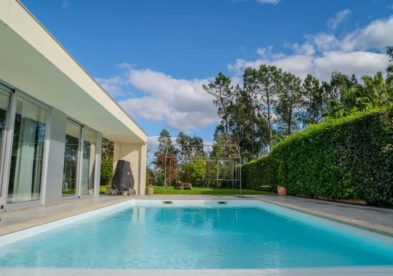 Located on the banks of the Cávado River, this contemporary-style villa is set on a plot of approximately 1000m2, complemented by two other plots bordering the river. It has a simple and intuitive layout, with the social area differentiated from the private area. All rooms have access to the outside, from where you can reach the heated swimming pool, barbecue area and garden area. It has excellent sun exposure, maximized by the glazed windows that run throughout the single-storey villa. it consists of three suites, a guest toilet, an office, a kitchen with a dining area, a lounge and a laundry room, as well as a garage for two cars. It is as good as new and has several technologies that make it easier to enjoy and use on a daily basis, offering protection, comfort and well-being. It is part of a condominium of just five houses which, due to its location, offers almost total privacy. CHARACTERISTICS: Plot Area: 3 117 m2 | 33 551 sq ft Deployment Area: 356 m2 | 3 832 sq ft Building Area: 356 m2 | 3 832 sq ft Bedrooms: 3 Bathrooms: 4 Garage: 2 Energy efficiency: B FEATURES: Air conditioning Fireplace in the living room Video surveillance system Intrusion and smoke alarms Pellet boiler in the bedroom area Automatic irrigation system Central vacuum system Solar panels Photovoltaic panels