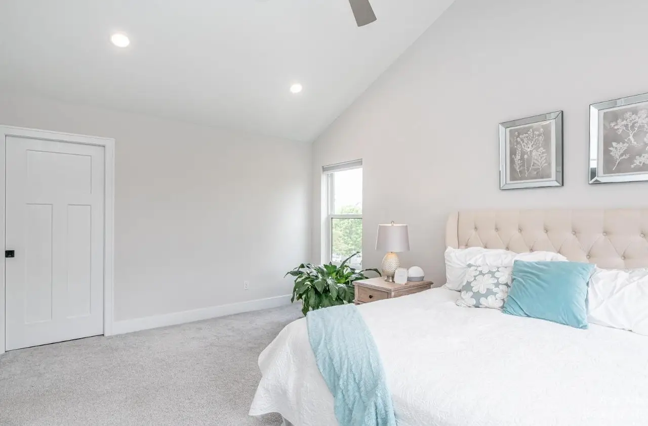 Primary bedroom suite with tray ceiling and spa-sized shower
