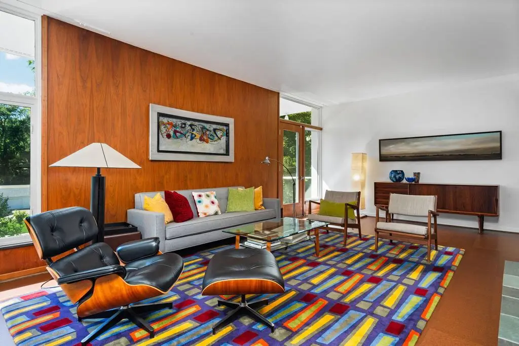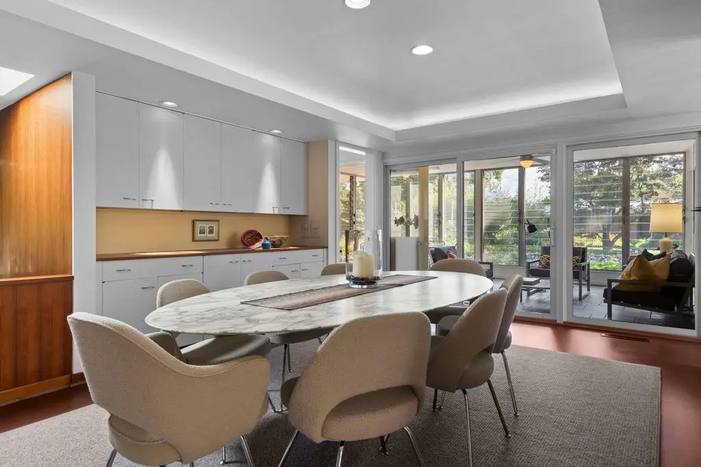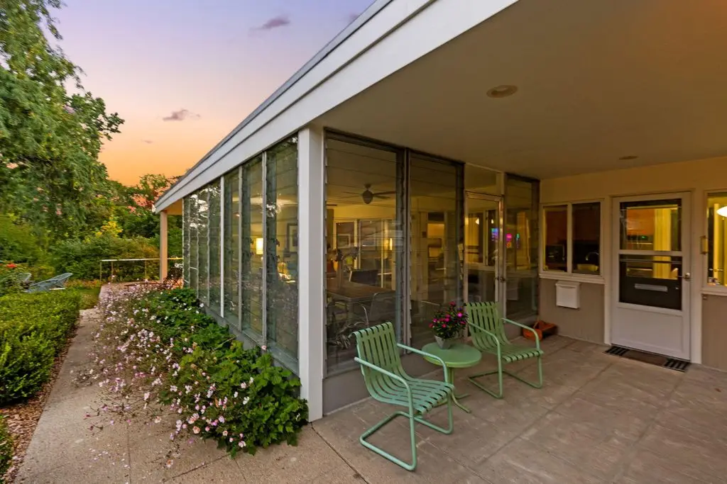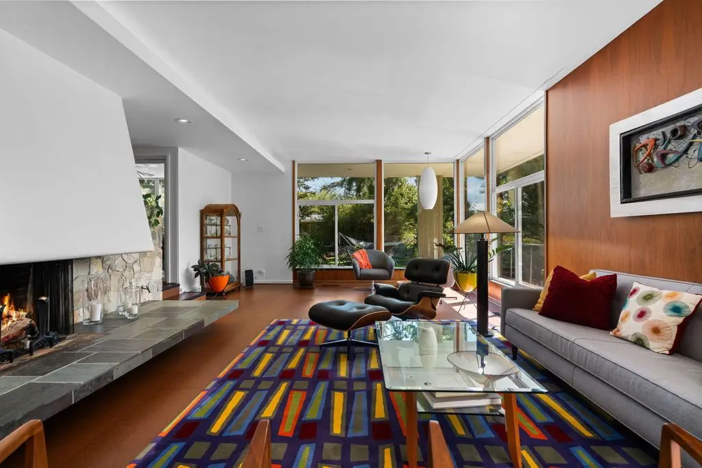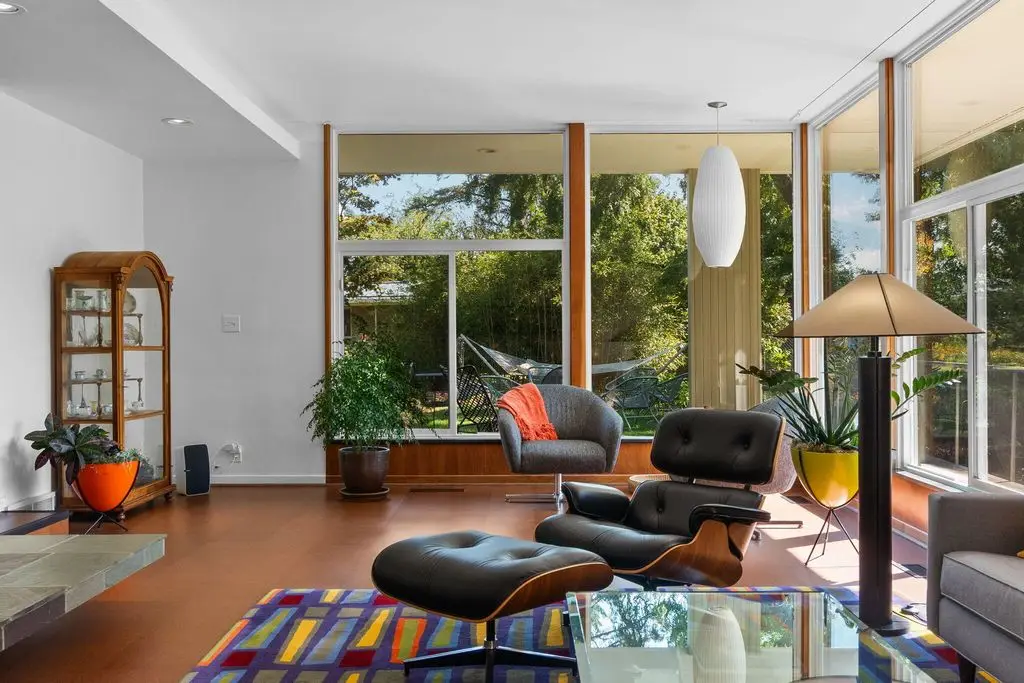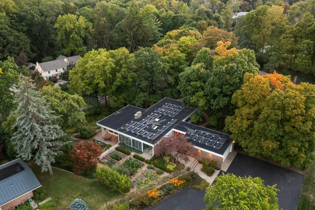 Designated by A2Modern as one of Ann Arbor's most notable Mid-Century Modern residences, this gracious home is a timeless example of the movement's enduring appeal. Its flat roof, cantilevered eaves, and private entry tucked into a breezeway embody the geometric simplicity and strong connection to nature that define the era. Expansive windows and skylights flood the interior with natural light, framing treetop and meadow views. A Florida room with jalousie windows and a full-width balcony create seamless transitions between indoors and out, while landscaped grounds enhance the home's natural hillside setting. In keeping with the owners' commitment to sustainability, the property features a small orchard of fruit trees, raised vegetable gardens and a pollinator garden. The exceptional property was featured in the Ann Arbor Garden Tour. Inside, organic materials including slate tile, cork flooring, and walnut paneling are paired with a dramatic stone wall that divides the living and dining rooms, featuring a built-in planter and cantilevered hearth. Cove lighting accents the tall ceilings, while horizontal flow brings warmth and intimacy to the open floor plan. The eat-in kitchen blends stainless steel finishes and high-end appliances with carefully preserved original cabinetry. On the main level, three bedrooms and two baths include a primary suite with treetop views and a renovated bath featuring a level-entry shower, while the third bedroom has been converted into a paneled study. The lower level offers a cozy sitting area, laundry and exercise space, and well-organized storage. One-level living is easily possible by relocating the laundry to the spacious primary closet.Thoughtful renovations have elevated this residence into a net-zero, all-electric retreat powered by a 15kW solar arraya rare union of architectural heritage and sustainable living. At once a faithful restoration and a forward-looking sanctuary, 505 Burson Place offers the elegance of mid-century design harmoniously reimagined for today's eco-conscious lifestyle.Tucked away on a private cul-de-sac in Ann Arbor Hills, this home provides unparalleled access to the best of Ann Arbor: stroll through Nichols Arboretum, picnic at Gallup Park, bike or jog to the U-M main campus, medical center, or new U-M fitness center. Designed by James Livingston in 1956, it remains one of the city's most admired Mid-Century Modern retreats.