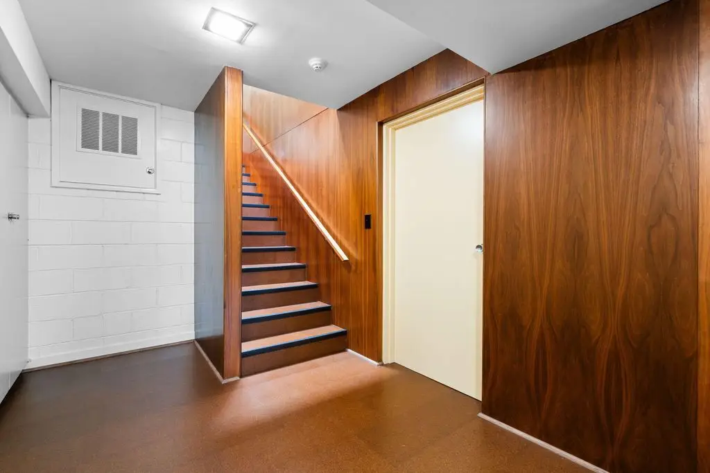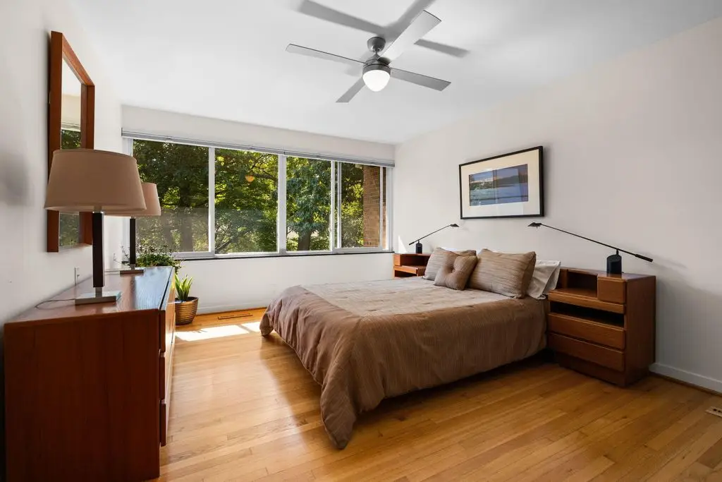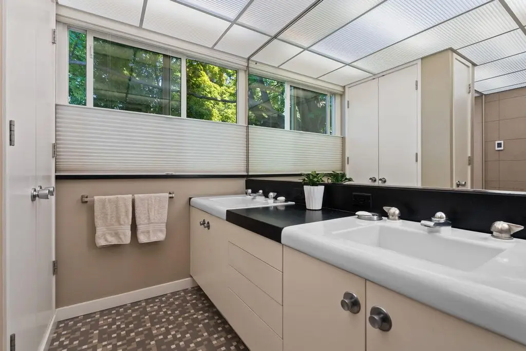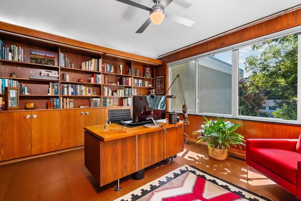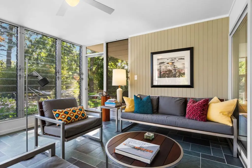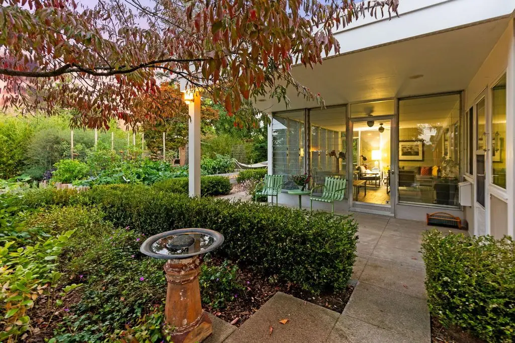 Designated by A2Modern as one of Ann Arbor's most notable Mid-Century Modern residences, this gracious home is a timeless example of the movement's enduring appeal. Its flat roof, cantilevered eaves, and private entry tucked into a breezeway embody the geometric simplicity and strong connection to nature that define the era. Expansive windows and skylights flood the interior with natural light, framing treetop and meadow views. A Florida room with jalousie windows and a full-width balcony create seamless transitions between indoors and out, while landscaped grounds enhance the home's natural hillside setting. In keeping with the owners' commitment to sustainability, the property features a small orchard of fruit trees, raised vegetable gardens and a pollinator garden. The exceptional property was featured in the Ann Arbor Garden Tour. Inside, organic materials including slate tile, cork flooring, and walnut paneling are paired with a dramatic stone wall that divides the living and dining rooms, featuring a built-in planter and cantilevered hearth. Cove lighting accents the tall ceilings, while horizontal flow brings warmth and intimacy to the open floor plan. The eat-in kitchen blends stainless steel finishes and high-end appliances with carefully preserved original cabinetry. On the main level, three bedrooms and two baths include a primary suite with treetop views and a renovated bath featuring a level-entry shower, while the third bedroom has been converted into a paneled study. The lower level offers a cozy sitting area, laundry and exercise space, and well-organized storage. One-level living is easily possible by relocating the laundry to the spacious primary closet.Thoughtful renovations have elevated this residence into a net-zero, all-electric retreat powered by a 15kW solar arraya rare union of architectural heritage and sustainable living. At once a faithful restoration and a forward-looking sanctuary, 505 Burson Place offers the elegance of mid-century design harmoniously reimagined for today's eco-conscious lifestyle.Tucked away on a private cul-de-sac in Ann Arbor Hills, this home provides unparalleled access to the best of Ann Arbor: stroll through Nichols Arboretum, picnic at Gallup Park, bike or jog to the U-M main campus, medical center, or new U-M fitness center. Designed by James Livingston in 1956, it remains one of the city's most admired Mid-Century Modern retreats.