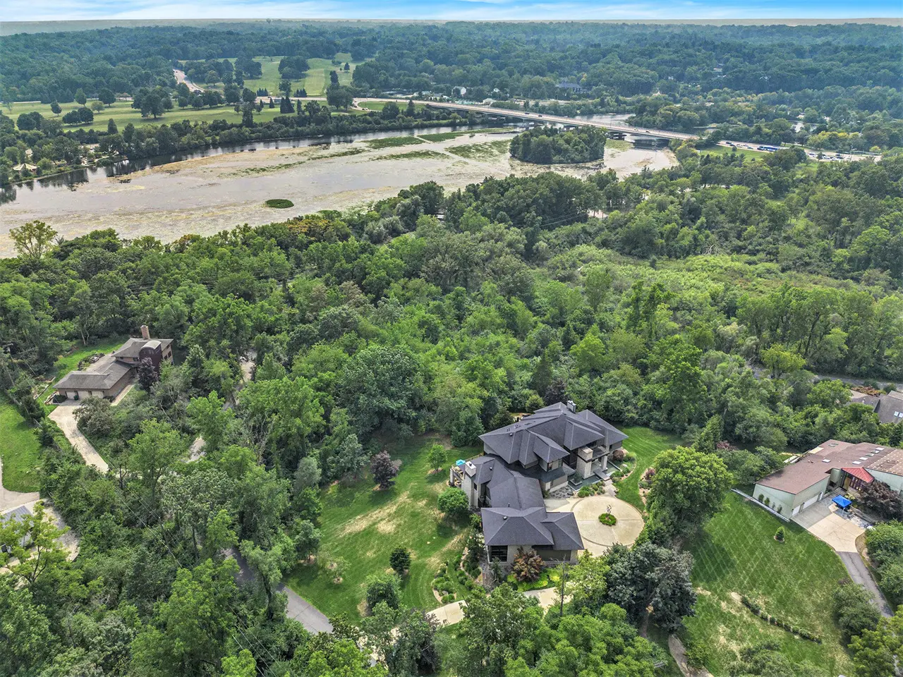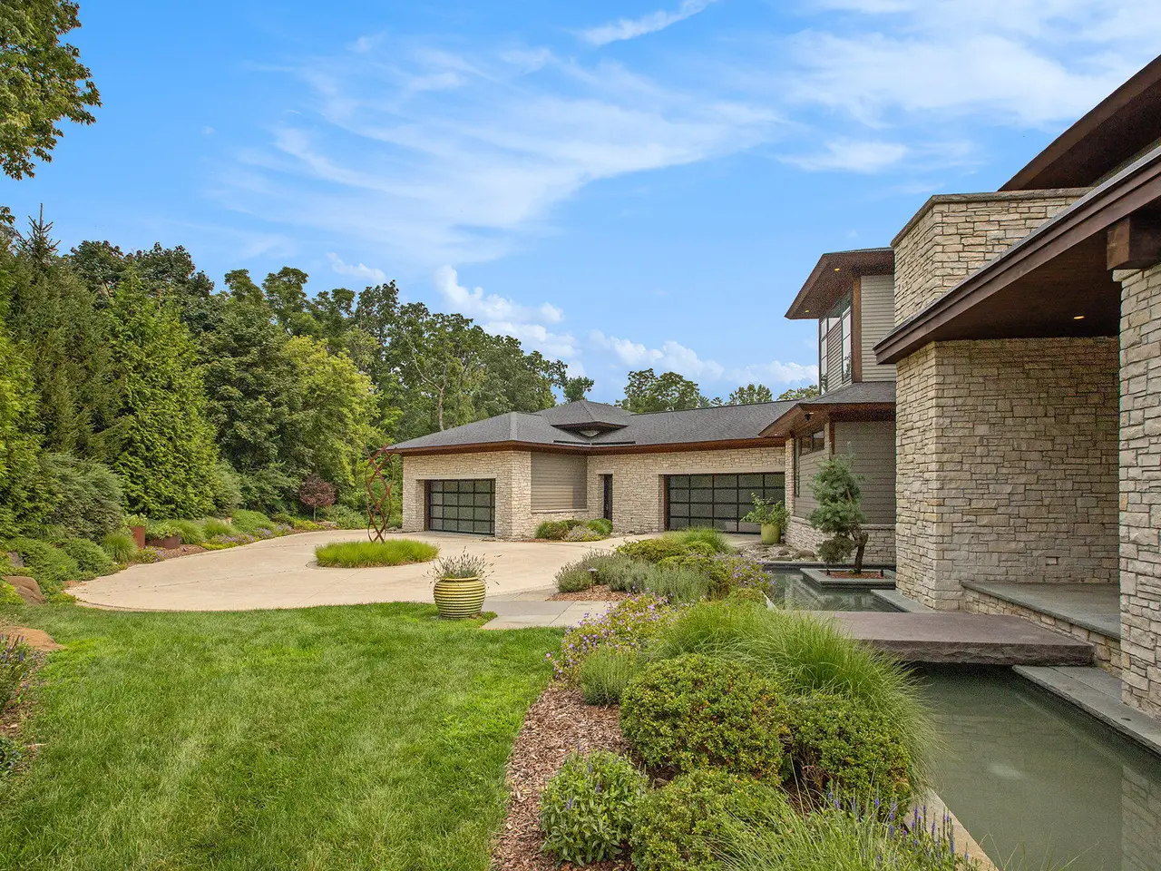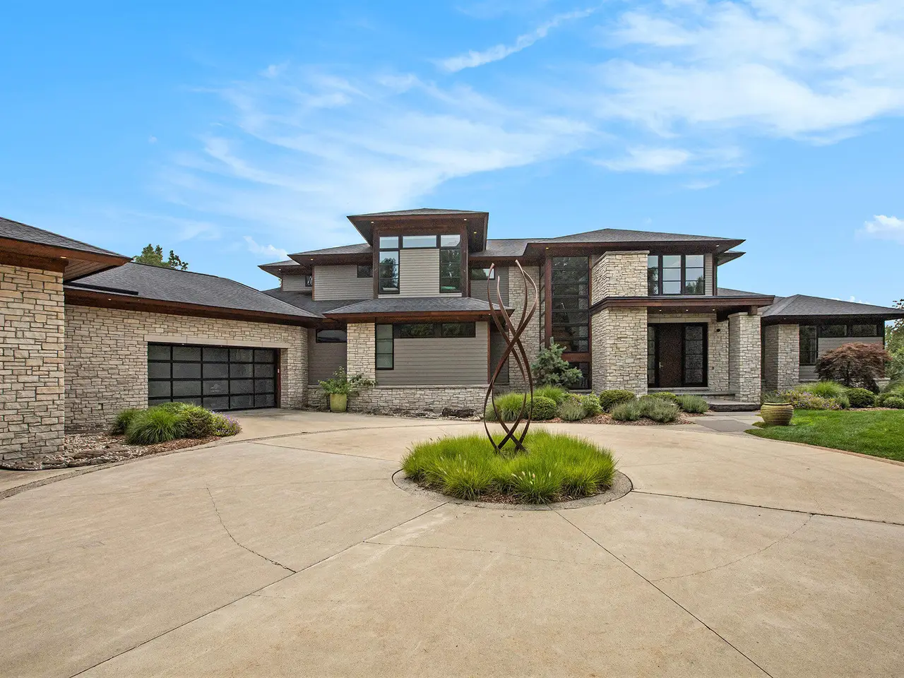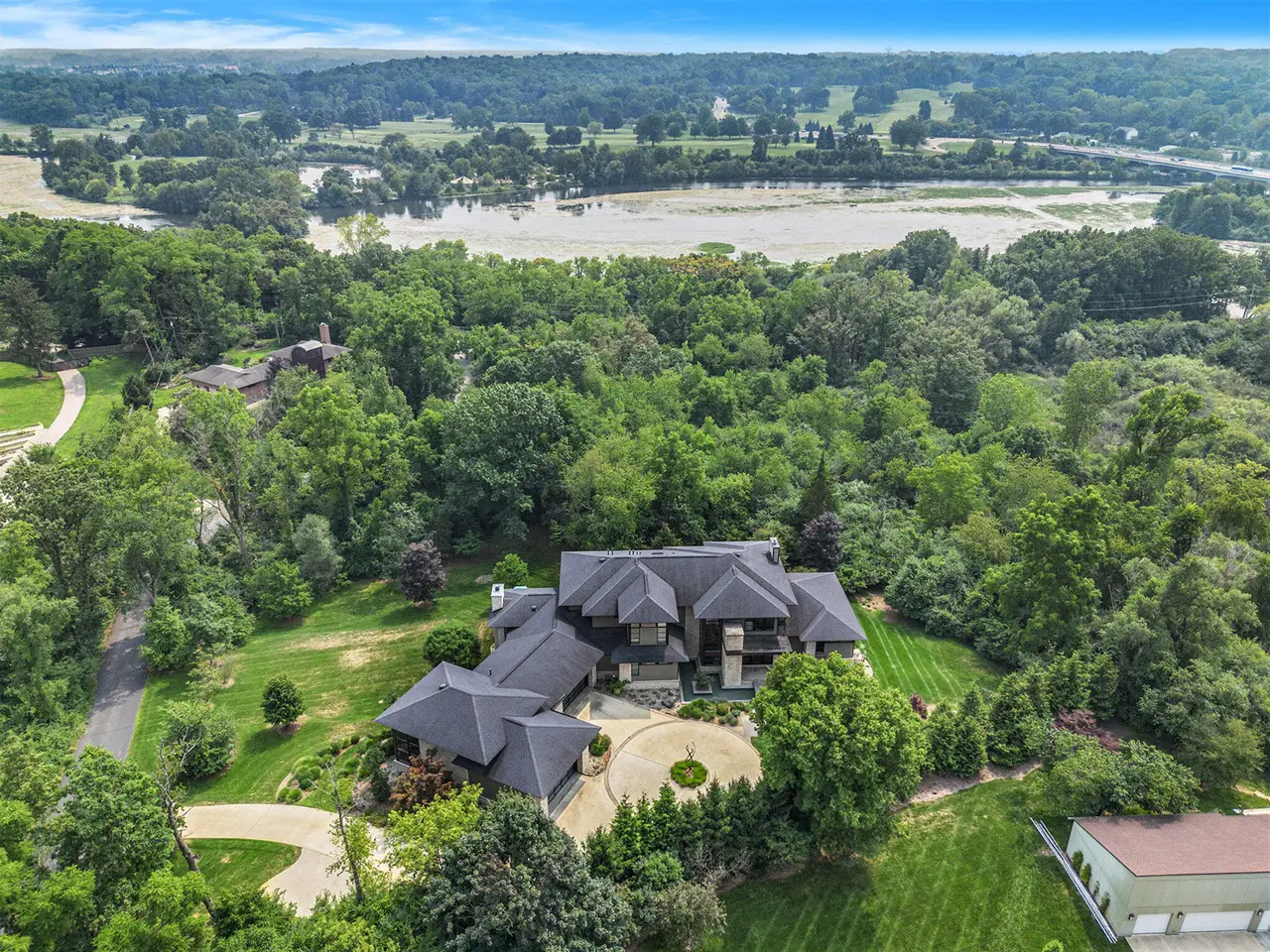 This custom-built Frank Lloyd Wright inspired Prairie Modern style home located in the heart of Ann Arbor is one of the finest homes in the area and a true masterpiece of design, materials, and craftsmanship. You will be impressed at every turn, inside and out, by this truly spectacular property. The home rests on a three-acre double lot just minutes from all UM Campus locations and all Hospitals. The setting offers complete privacy and a stunning view of the Huron River Valley. The grounds are immaculate and feature multiple outdoor loving spaces, extensive landscaping, soothing water sculpture, and entry water feature with walk-over bridge. The eight-car garage space includes fully conditioned work bay with two car lift and extensive cabinetry. No expense was spared to create one of the most incredible living experiences you have ever seen. Interior highlights include a breathtaking two story foyer with custom staircase and stone accent wall, Ipe wood flooring throughout the main level, dramatic two story living room with stone fireplace, custom display shelves, and two story windows with views to the Valley, custom kitchen with Mahogany cabinets built by Dan Young includes two islands, coffee station, professional grade Thermador appliances, and quartz counter tops with a full waterfall edge on the islands, walk-behind wet bar with wine storage, dedicated walk-in pantry with built in cabinets, 2nd refrigerator, and wet bar, comfortable open concept family room with built in entertainment center, and an incredible screened porch with fireplace, Viking grill, heat lamps, and power screens. Additional main floor features include an extensive back hall mud room, laundry room, and homework-station, main floor guest suite with attached bath, and private home office with built-in desk and cabinets, fireplace, and private balcony. The upper level includes a spectacular primary bedroom suite with custom built walnut accents, spa-like primary bath, and oversized, fully built-out primary closet, 2 additional bedroom/bath suites, and a 2nd laundry room. The finished walk-out lower level includes an oversized, walk-behind bar, home theater room with retractable divider, gaming area, sitting area, 2nd office home/playroom, exercise room, and 5th bedroom/bath suite. There is an extensive list of upgrades including custom Lutron lighting and Control 4 home automation for music, security, and theater. Incredible!