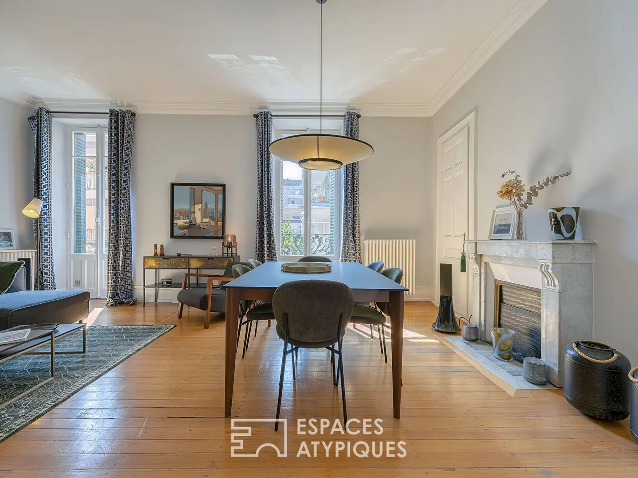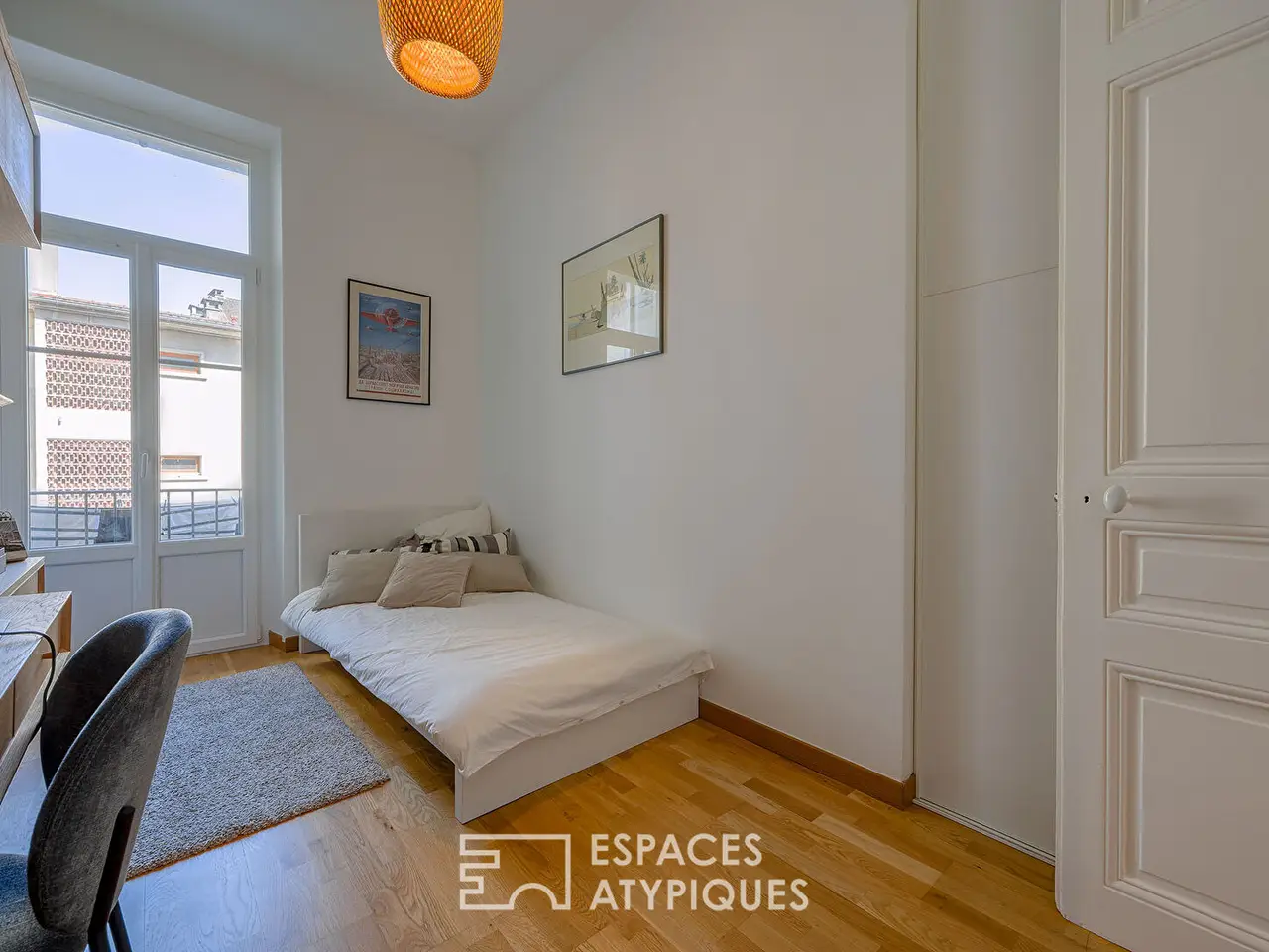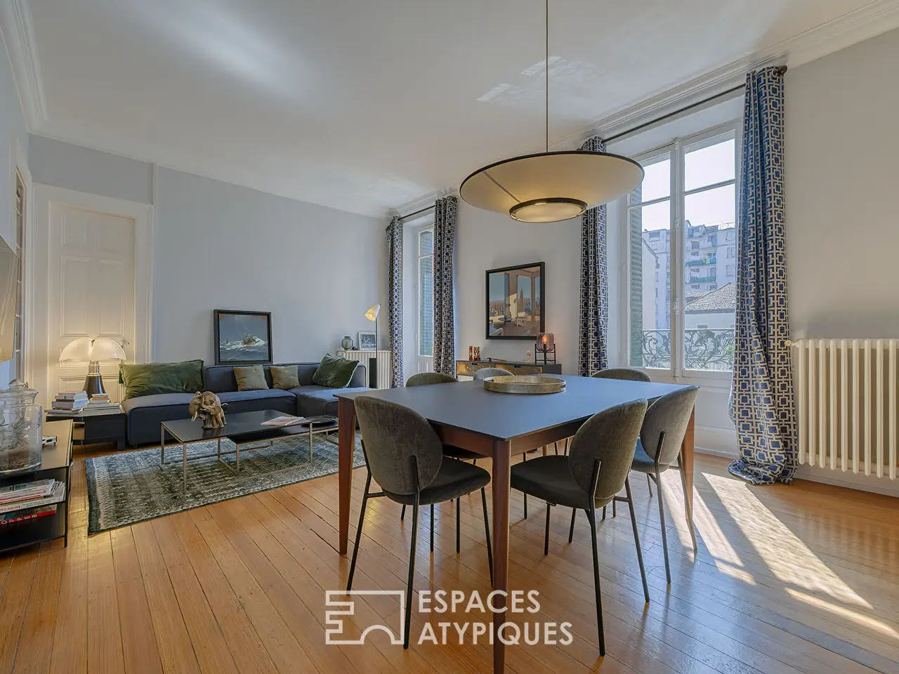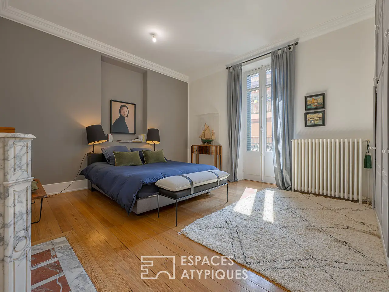 This beautiful Haussmann-style apartment of approximately 116 m² (Carrez Law) is located in the heart of Annecy, on the first floor of a condominium building. This high-quality renovation benefits from generous volumes highlighted by a functional layout. The combination of materials, antique and contemporary elements, makes this apartment a unique place, full of charm, enhanced by beautiful light. The high ceilings, marble fireplaces, exposed moldings, and solid parquet floors are the centerpieces. The entrance hall, with its hallway, separates the living space. It leads to the approximately 31 m² living room and the fully equipped and fitted open kitchen. The living area consists of a charming living room and a dining room with a beautiful marble fireplace and solid parquet flooring. Two large windows and a balcony allow natural light to flood in from all angles. Tastefully chosen designer decor completes this apartment's amenities. An open kitchen invites conviviality with its contemporary lines. A hallway leads to the sleeping area. The latter consists of three bedrooms, including the master bedroom with a generous volume of approximately 23 m². Two of them also have a private balcony. A bathroom with a shower, sinks, and storage completes this space. A cellar completes the features of this beautiful Haussmann-style apartment. Lovers of the city center, high-quality amenities, and spacious, bright spaces will be delighted by this undeniably charming property located in the heart of Annecy. Close to shops, schools, and public transport. A stone's throw from the lake. Possibility of renting out a garage for an additional fee (€200/month). ENERGY CLASS: D / CLIMATE CLASS: D Estimated average annual energy costs for standard use, based on energy prices for 2021, 2022, and 2023: between €2,130 and €2,920. Information on the risks to which this property is exposed is available on the Georisques website for the affected areas: www.georisques.gouv.fr. REF. 2016EA Additional Information * 4 rooms * 3 bedrooms * 1 bathroom * Floor: 1 * 5 floors in the building * 16 condominium units * Annual charges: €3,200 * Property tax: €1,500 * Procedures in progress: No Energy performance audits Primary energy consumption d: 227 kWh/m²/year Extremely efficient housing